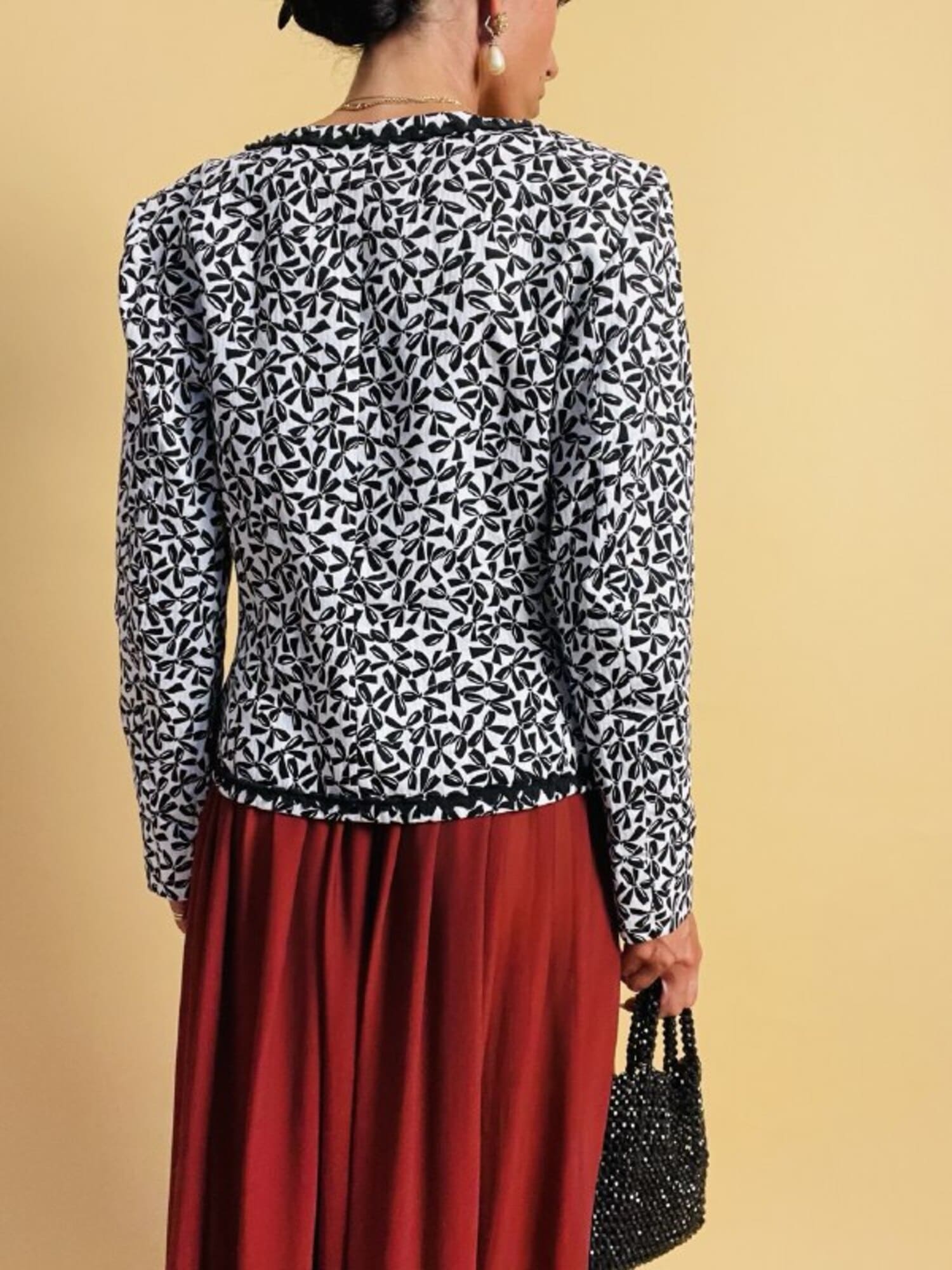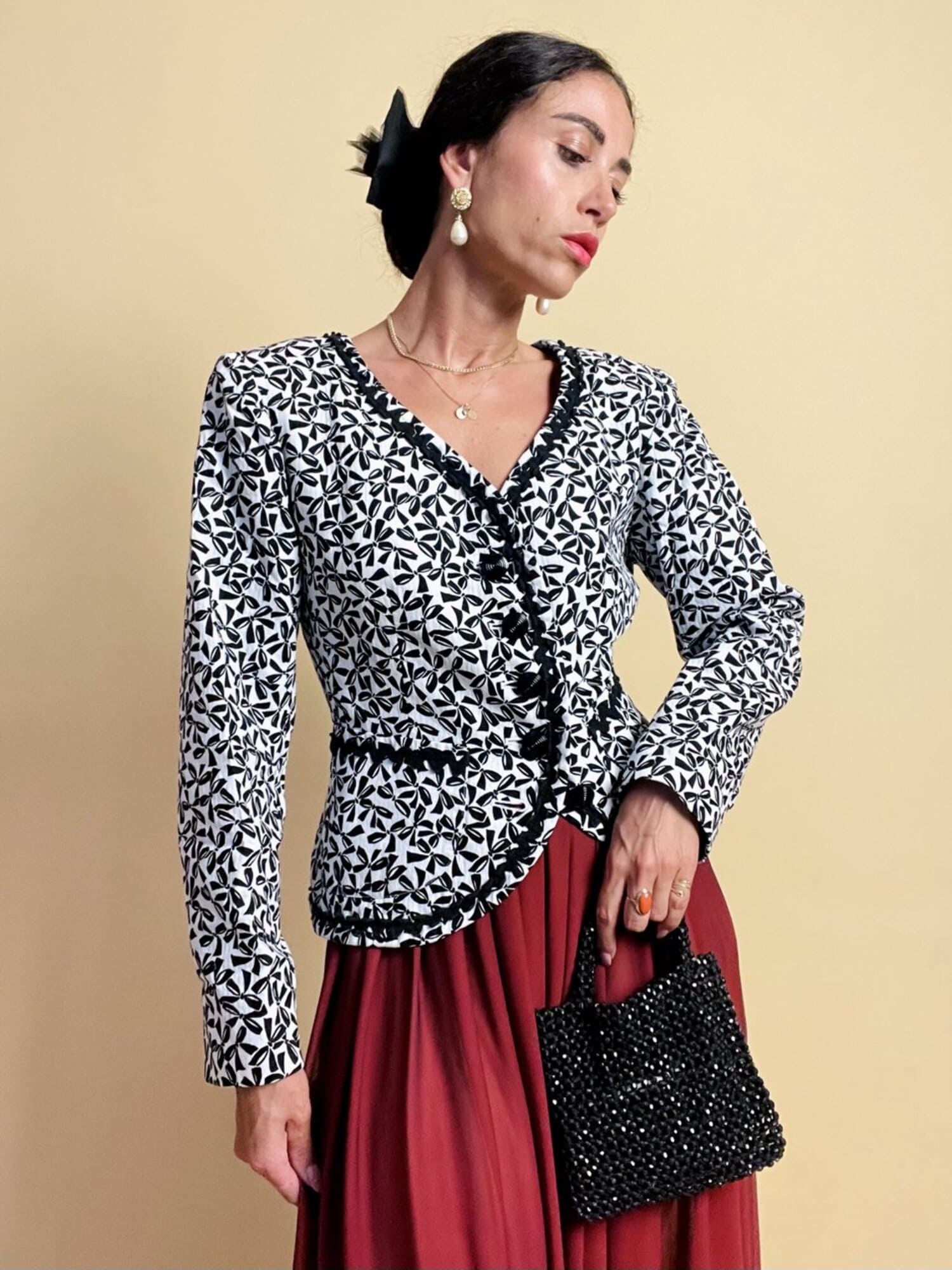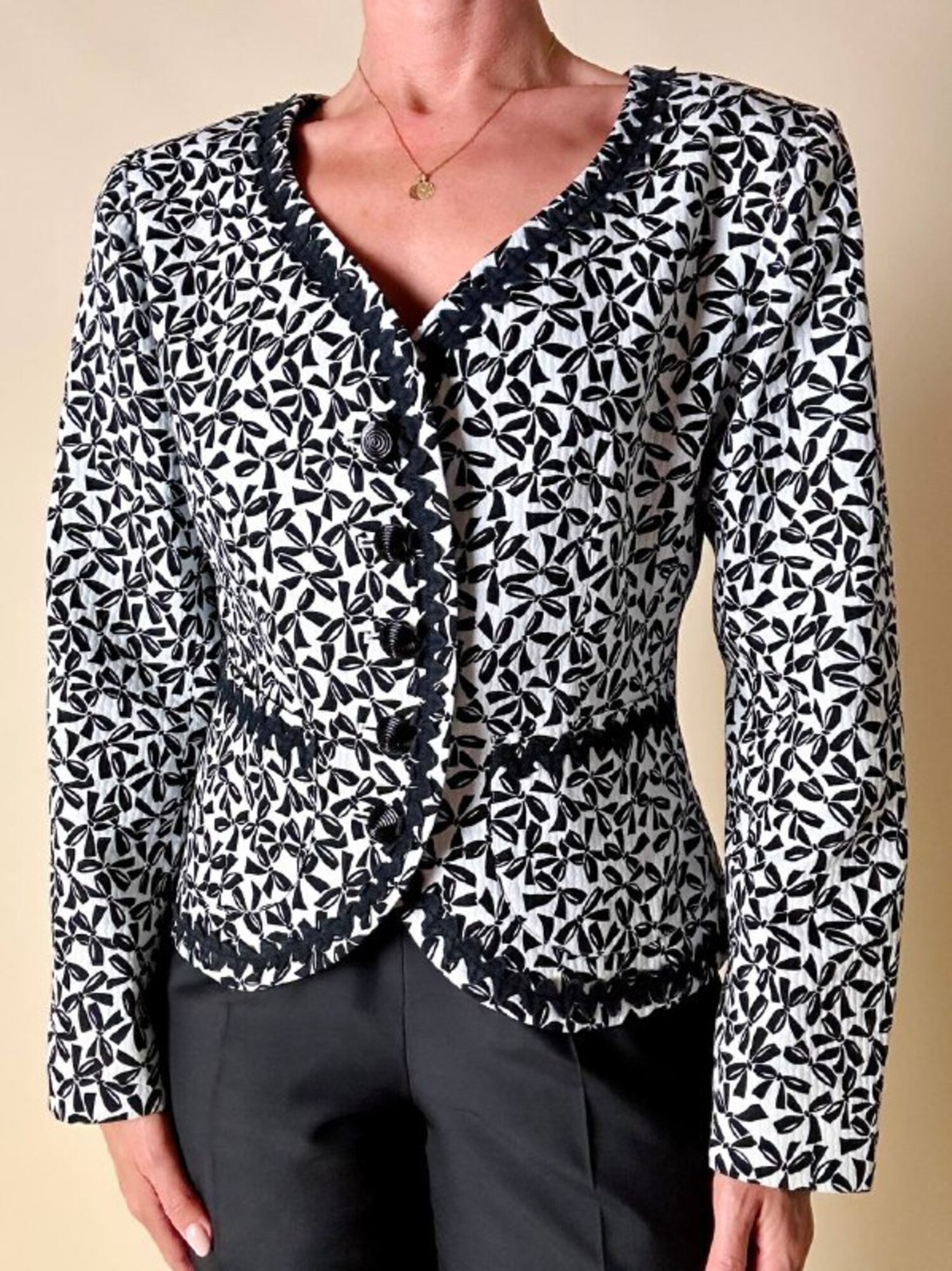 Questa giacca vintage firmata “Yves Saint Laurent”, della linea Variation, incanta per il suo fascino bon ton e l’attenzione sartoriale ai dettagli. Realizzata in cotone piquet bianco, è impreziosita da una deliziosa fantasia a piccoli fiocchi neri, che aggiunge un tocco di grazia e femminilità. Il modello corto, monopetto, con graziose taschine e un raffinato scollo a V senza rever, valorizza la figura con leggerezza e sobrietà. A delinearne i contorni, una passamaneria ondulata nera corre lungo il profilo e sul bordo alto delle tasche, donando carattere e raffinatezza. Completano il capo dei preziosi bottoni a cupola, neri lucidi, con motivo scanalato a spirale. Interamente foderata, è la scelta perfetta per chi ama lo charme intramontabile dello stile parigino.