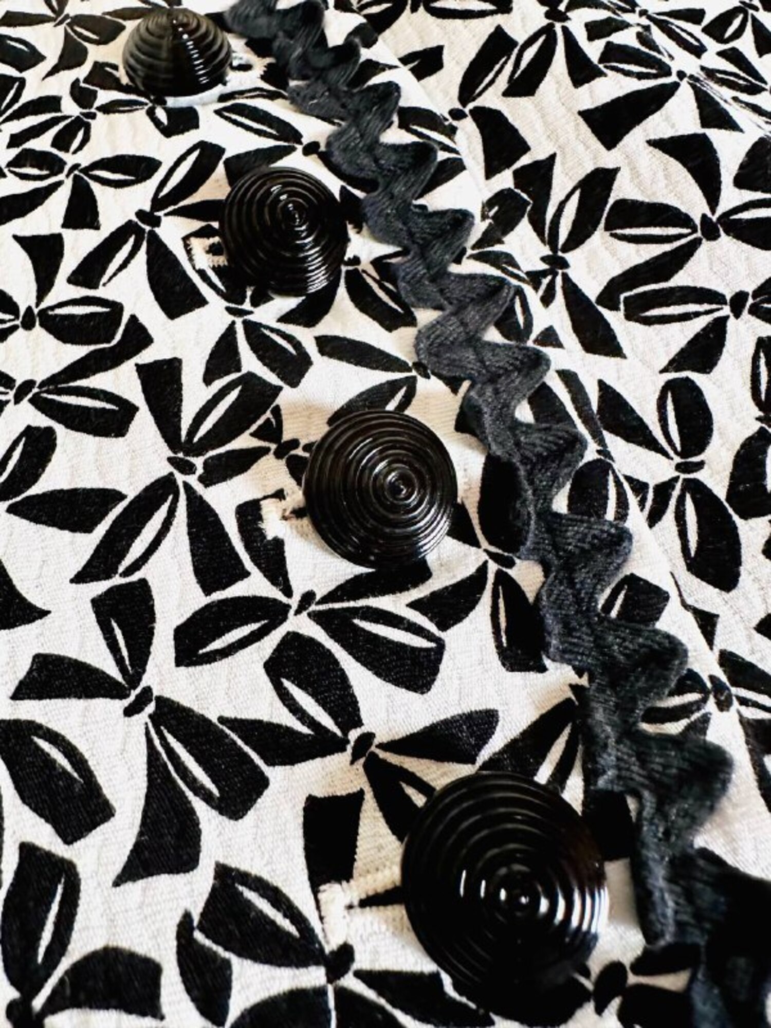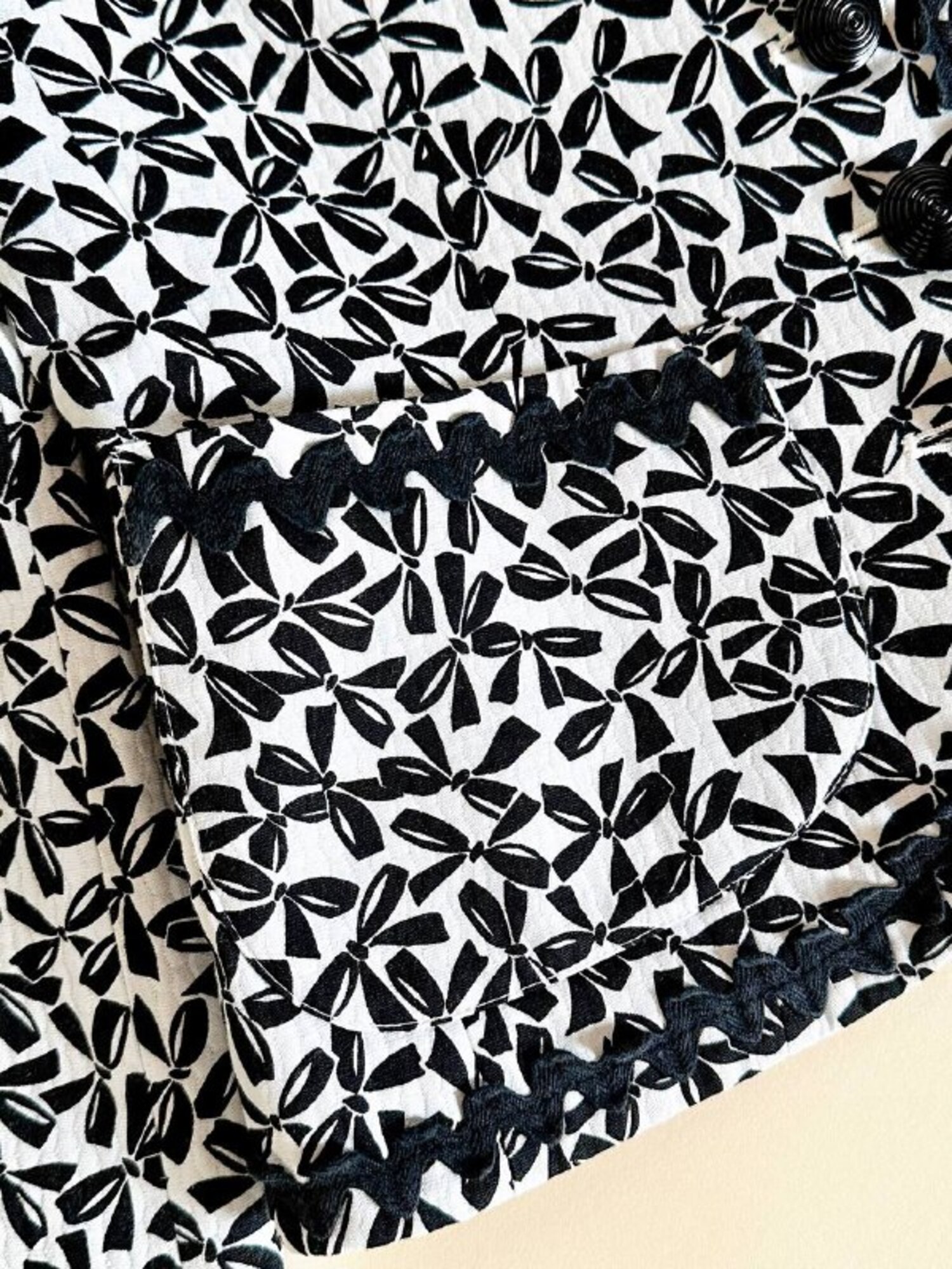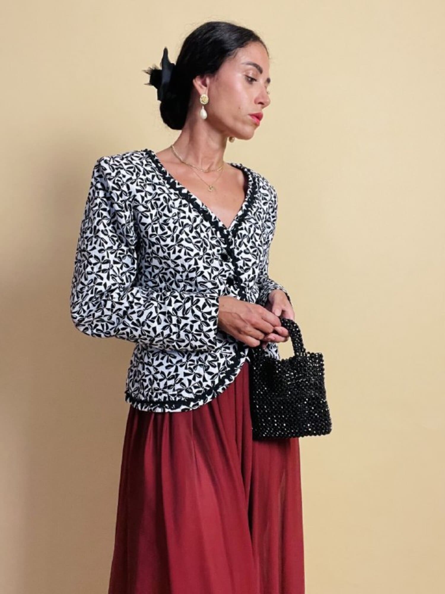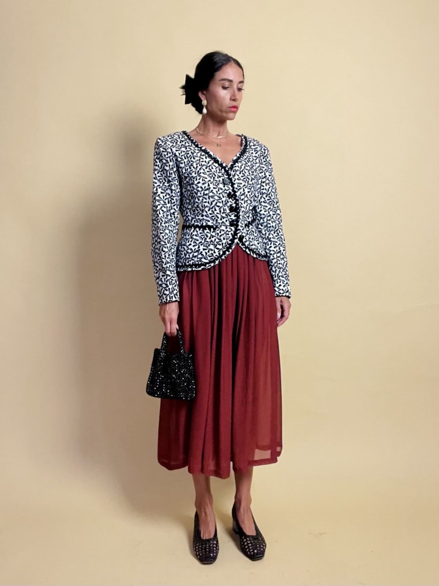 Questa giacca vintage firmata “Yves Saint Laurent”, della linea Variation, incanta per il suo fascino bon ton e l’attenzione sartoriale ai dettagli. Realizzata in cotone piquet bianco, è impreziosita da una deliziosa fantasia a piccoli fiocchi neri, che aggiunge un tocco di grazia e femminilità. Il modello corto, monopetto, con graziose taschine e un raffinato scollo a V senza rever, valorizza la figura con leggerezza e sobrietà. A delinearne i contorni, una passamaneria ondulata nera corre lungo il profilo e sul bordo alto delle tasche, donando carattere e raffinatezza. Completano il capo dei preziosi bottoni a cupola, neri lucidi, con motivo scanalato a spirale. Interamente foderata, è la scelta perfetta per chi ama lo charme intramontabile dello stile parigino.