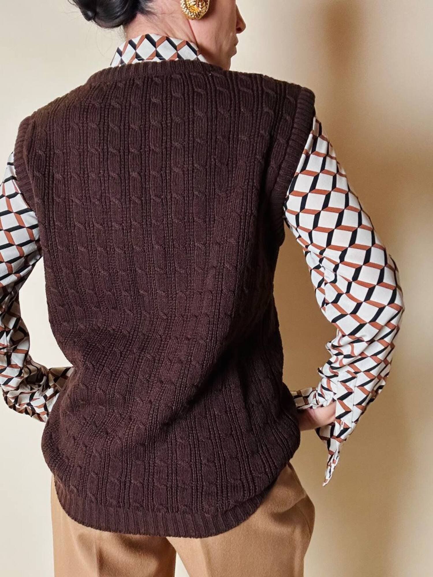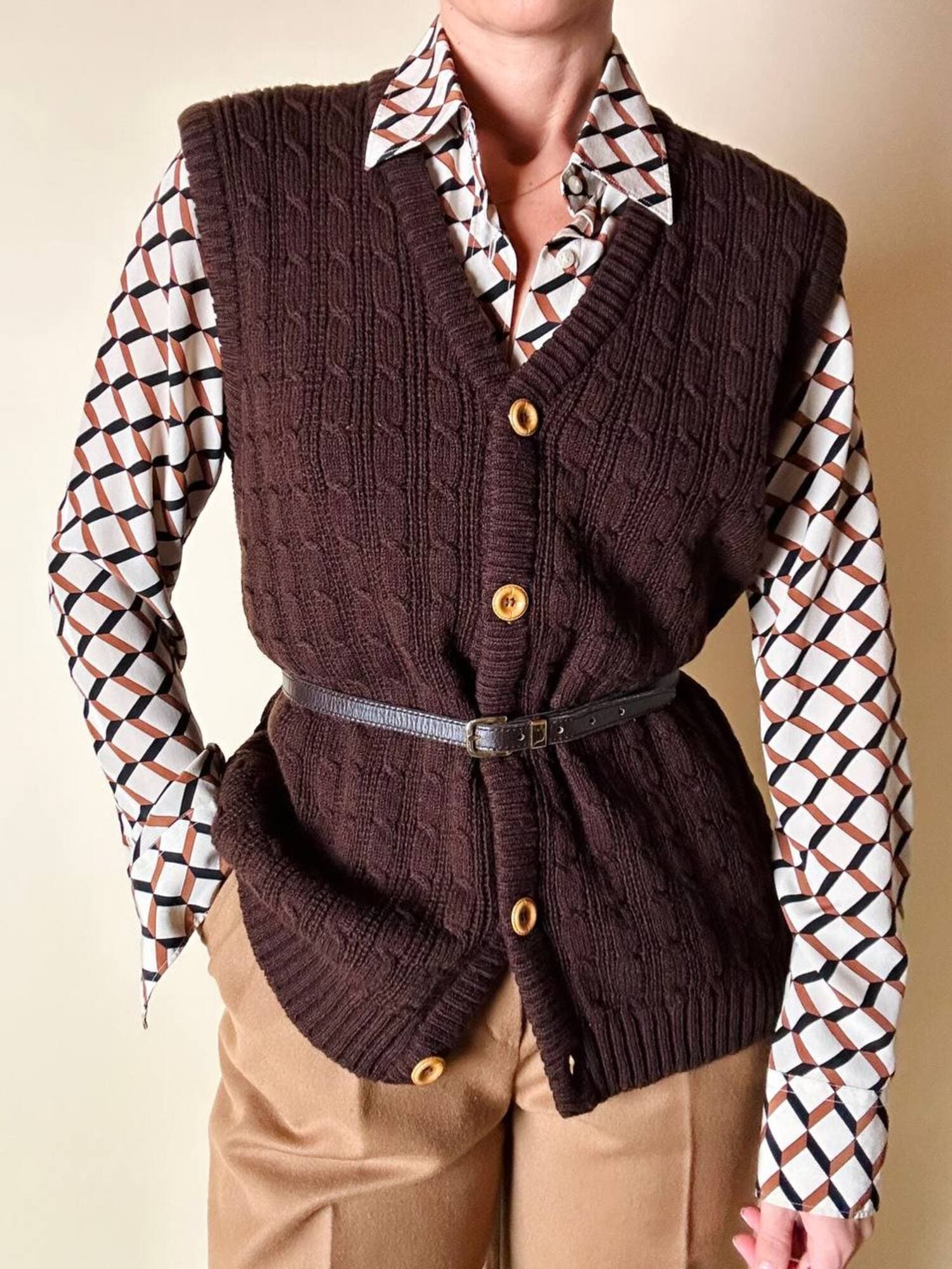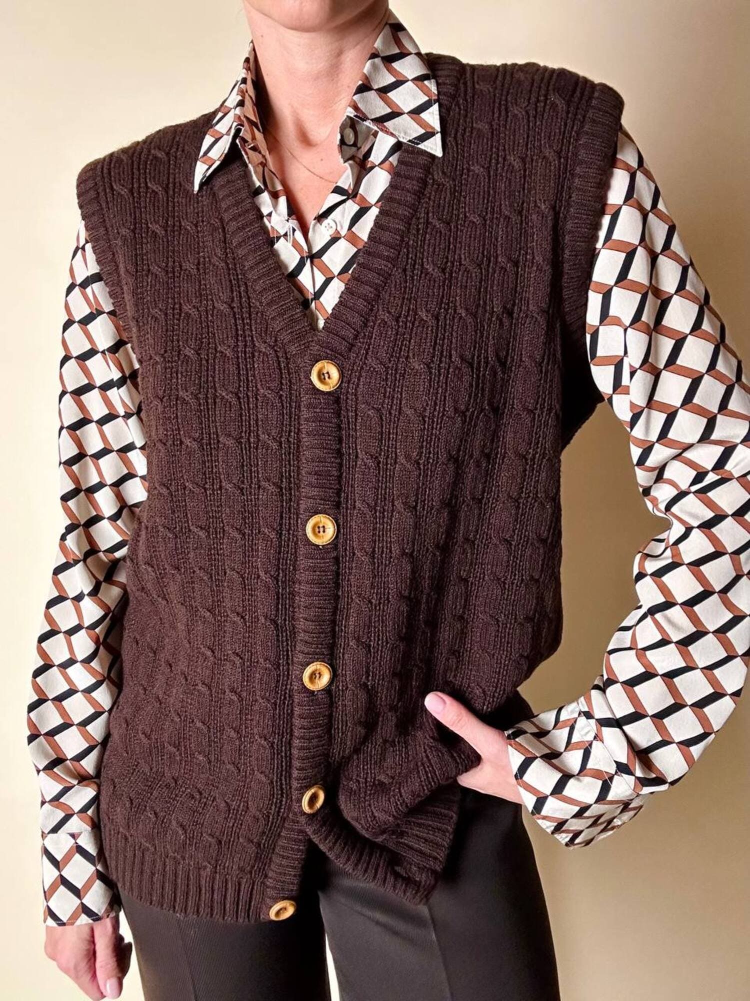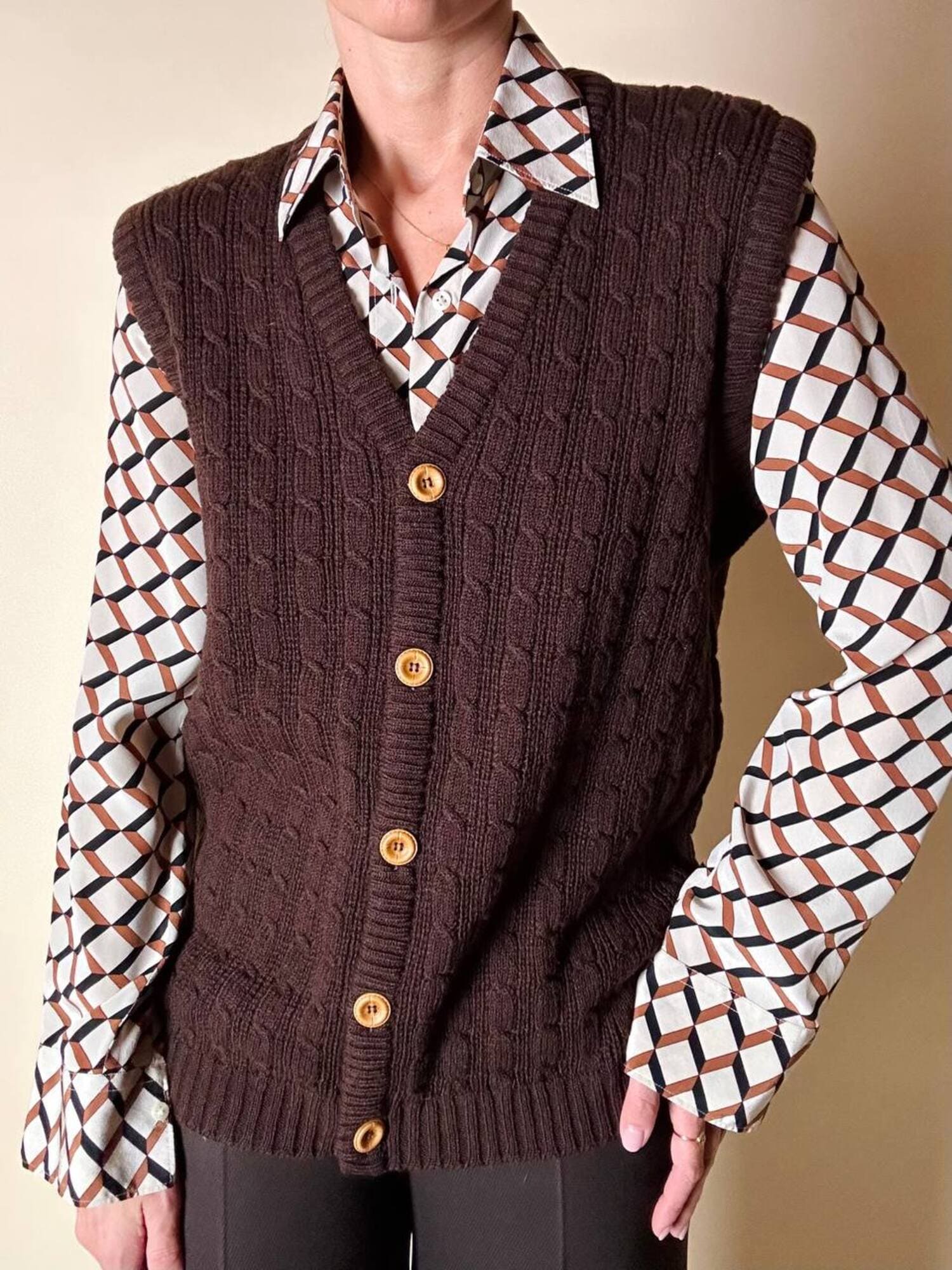 Questo gilet marrone lavorato a trecce è un autentico classico del guardaroba senza tempo. La lavorazione a maglia a trecce verticali dona profondità e carattere.