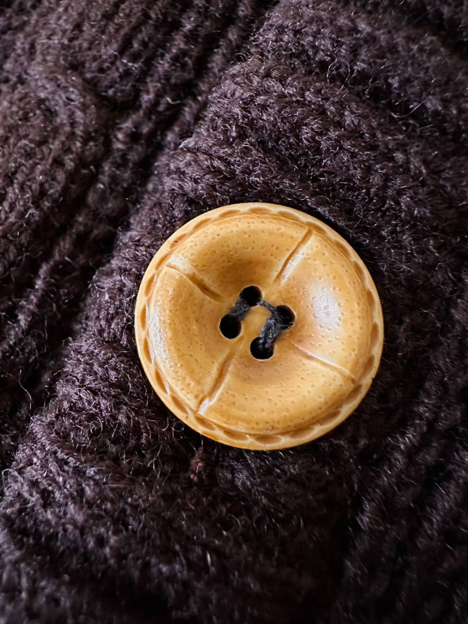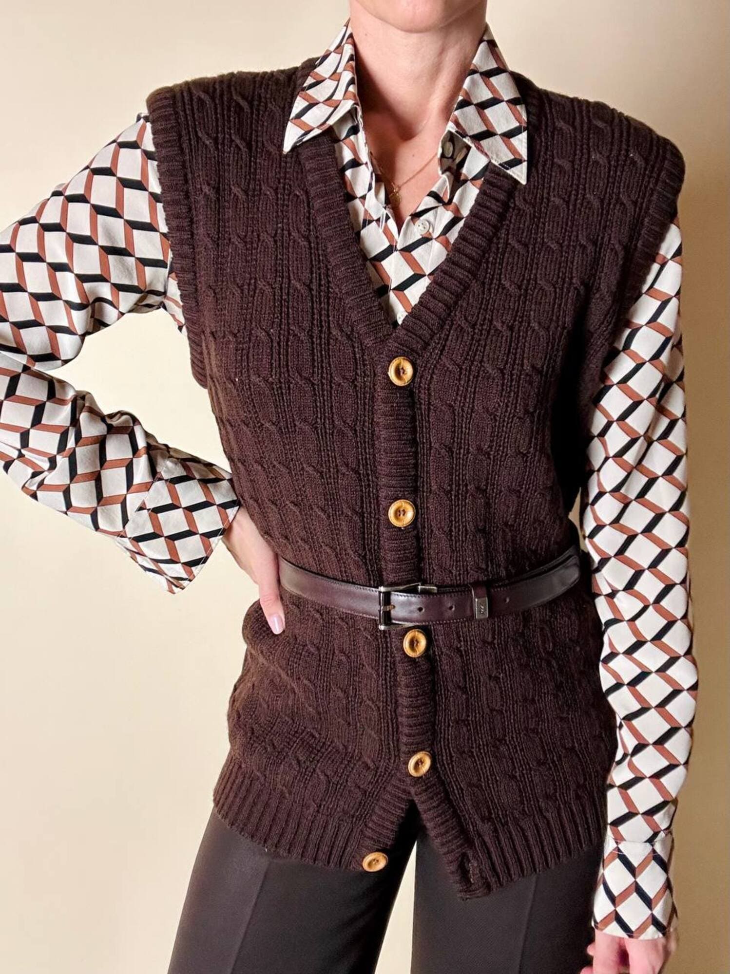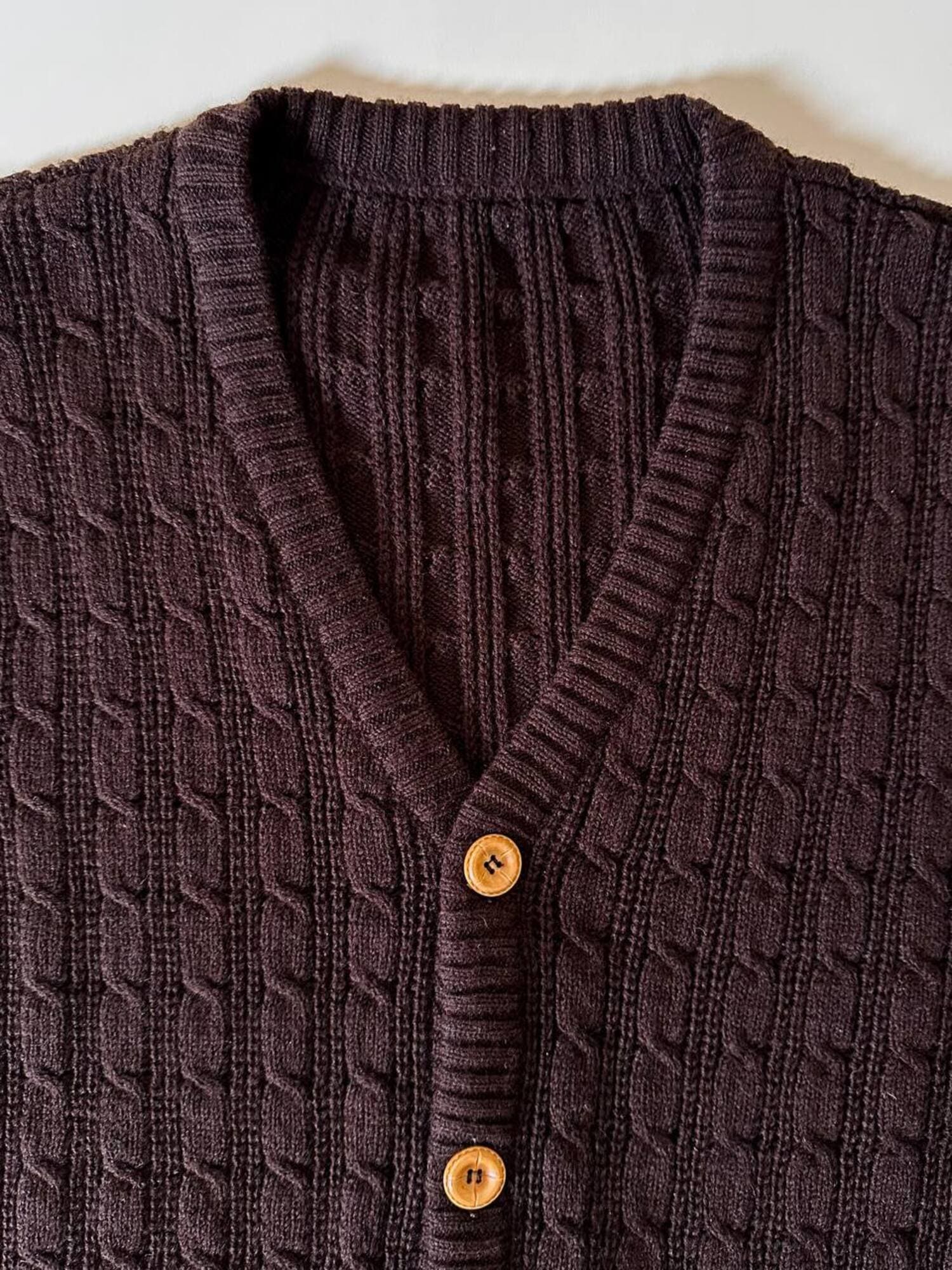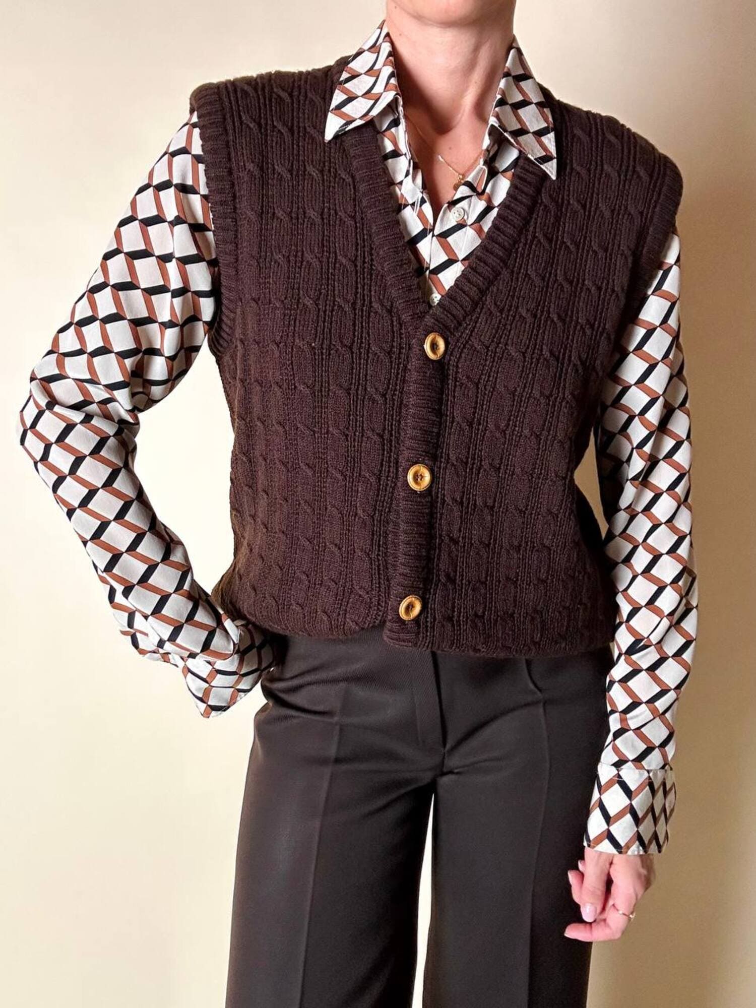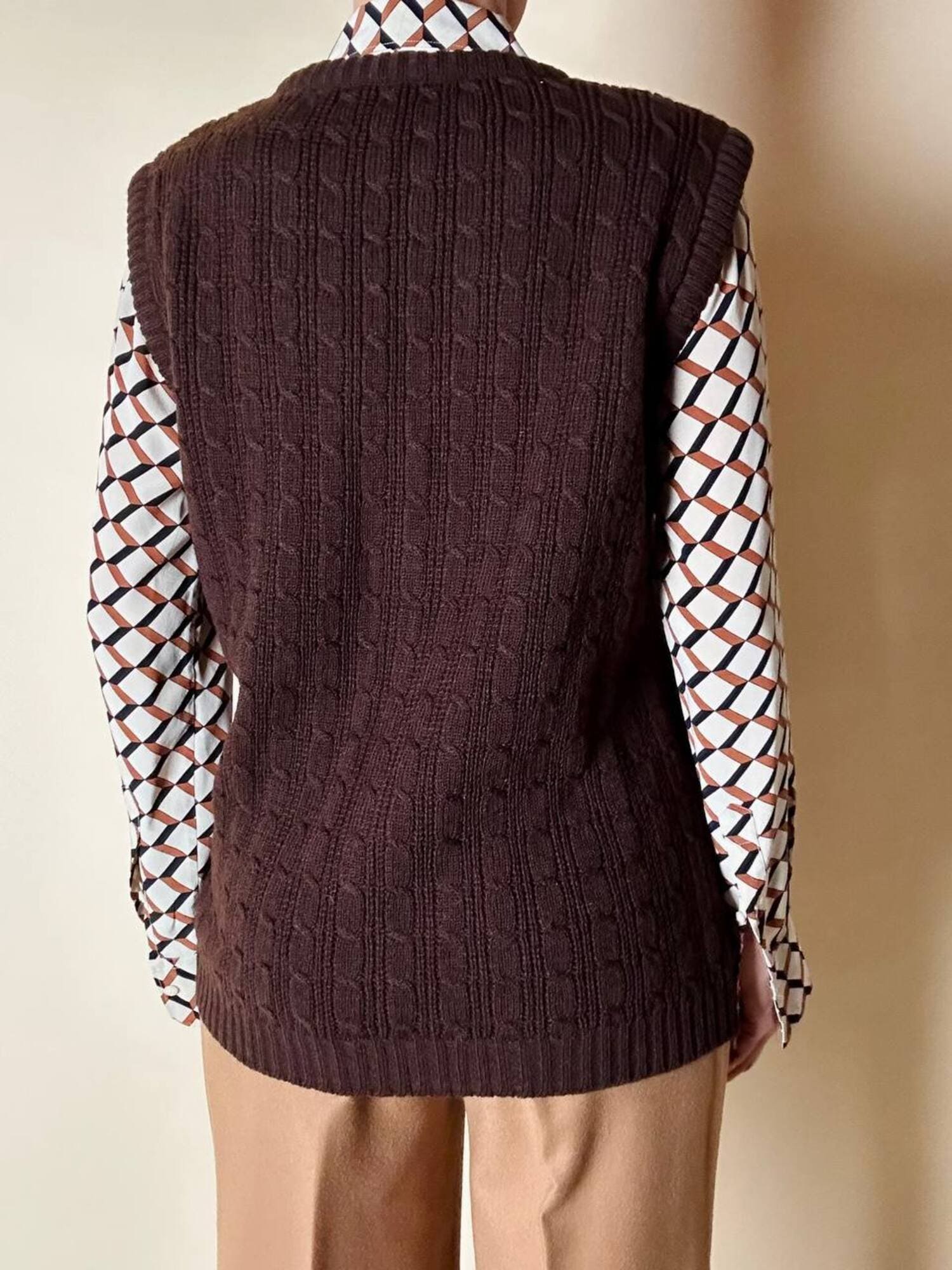 Questo gilet marrone lavorato a trecce è un autentico classico del guardaroba senza tempo. La lavorazione a maglia a trecce verticali dona profondità e carattere.