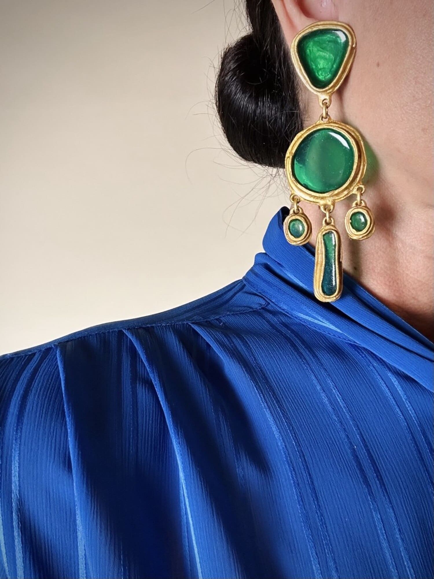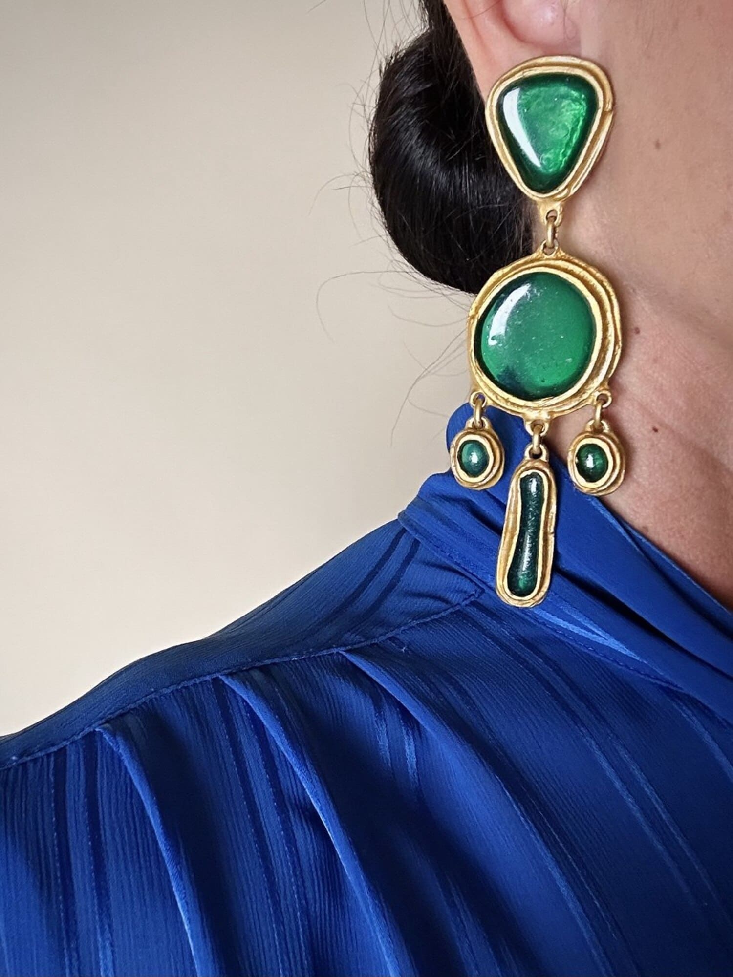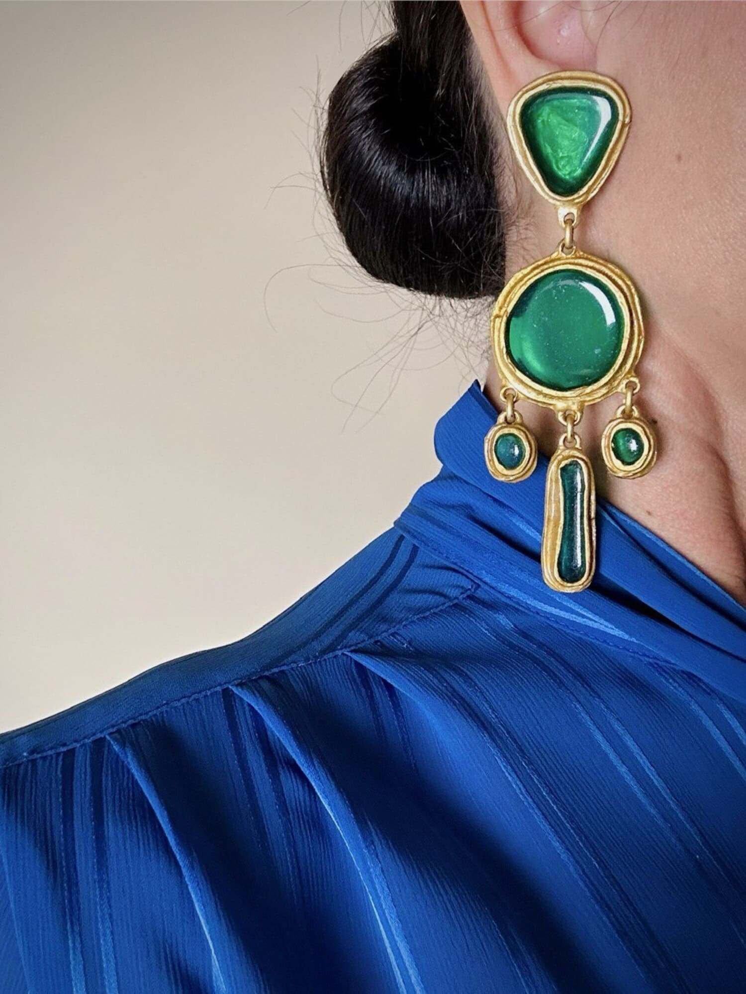 Questi maxi orecchini a clip pendenti, dalle montature dorate irregolari, sono impreziositi da cabochon in resina vitrea verde smeraldo di varie misure. La superficie lucida e trasparente delle pietre, come uno specchio d’acqua al tramonto, cattura e riflette la luce con bagliori che oscillano tra il verde intenso e il dorato caldo del metallo, rappresentando la fusione perfetta tra luce e materia. La clip posteriore è sicura e confortevole. Gioielli che trascendono il tempo, perfetti per valorizzare un abito da sera o per donare un tocco di sofisticata teatralità a un look minimal.