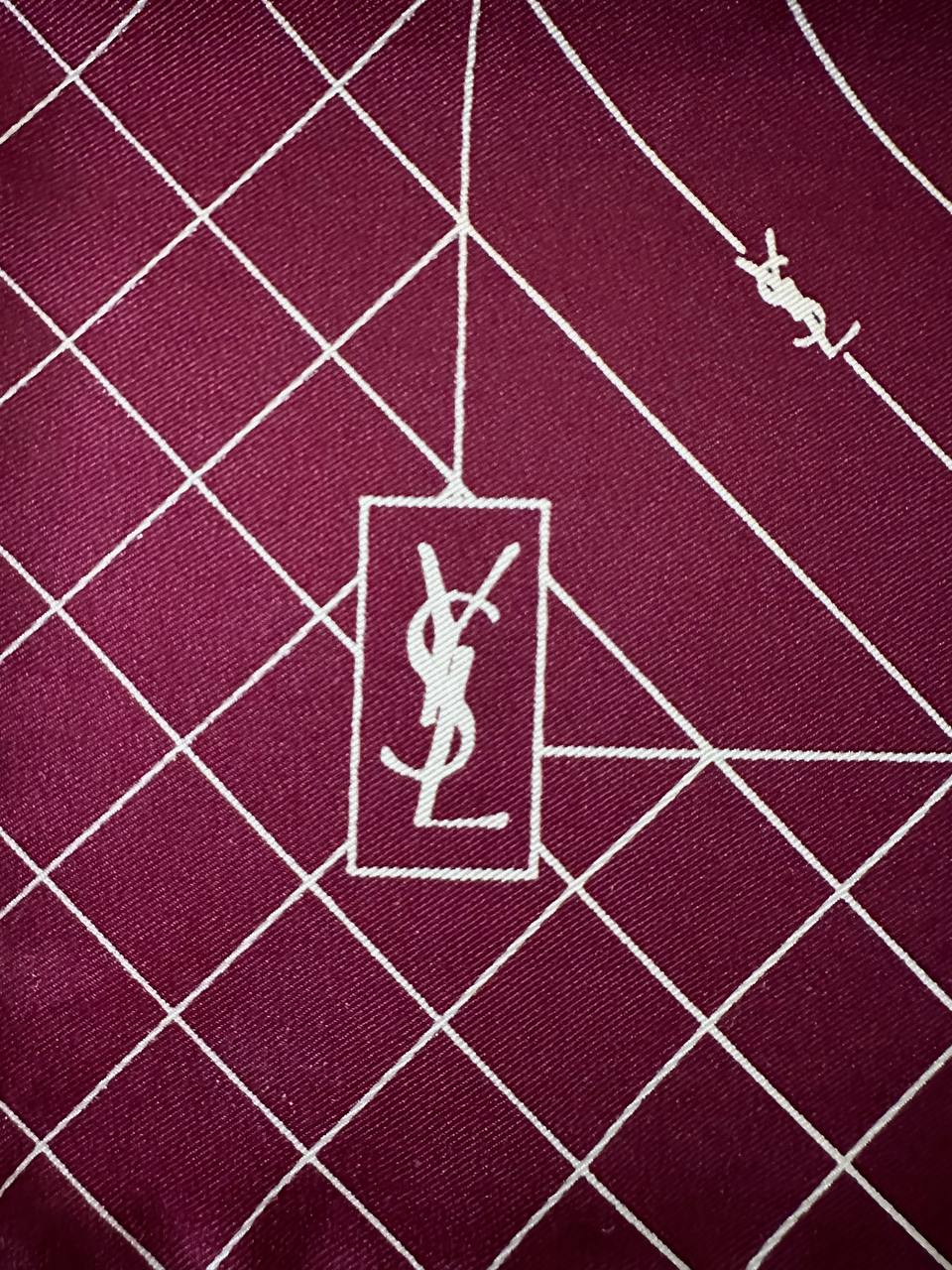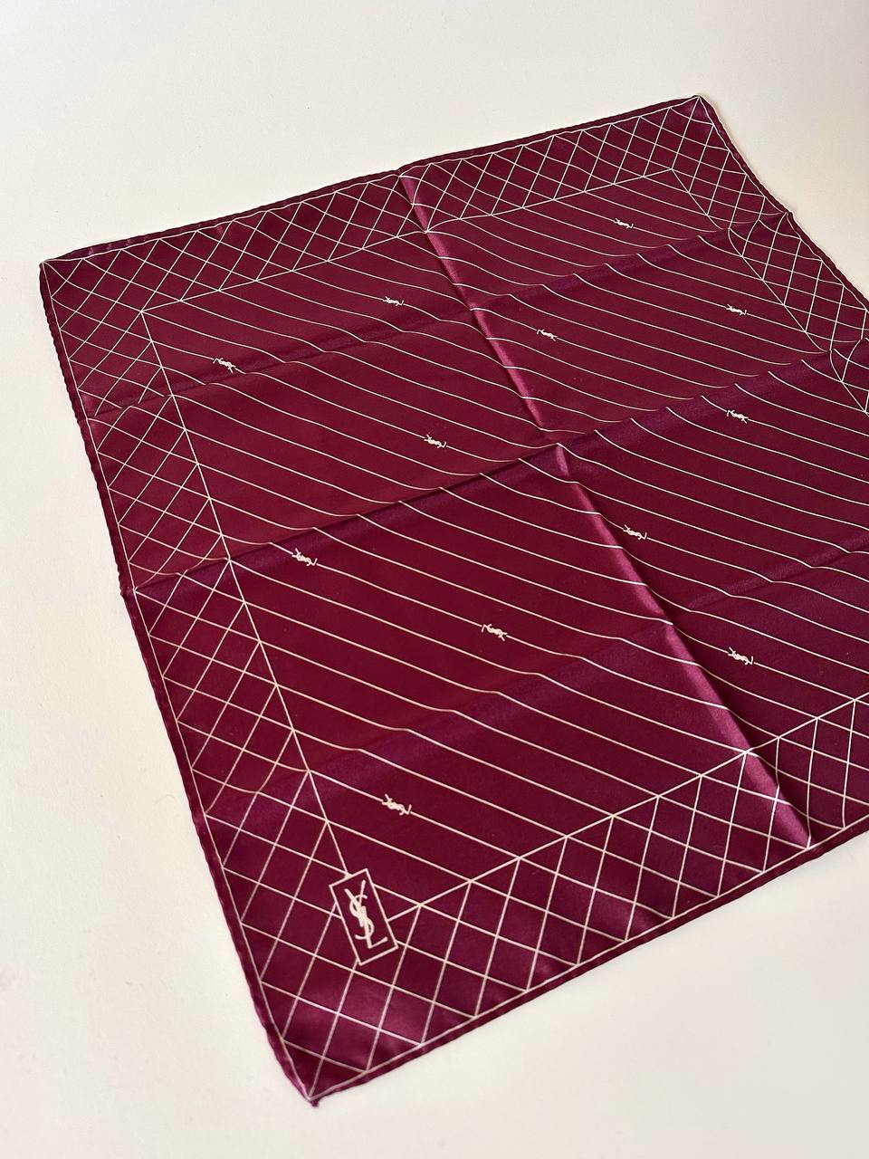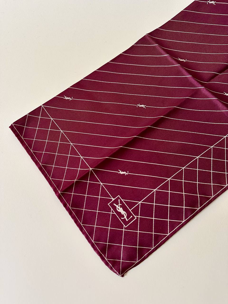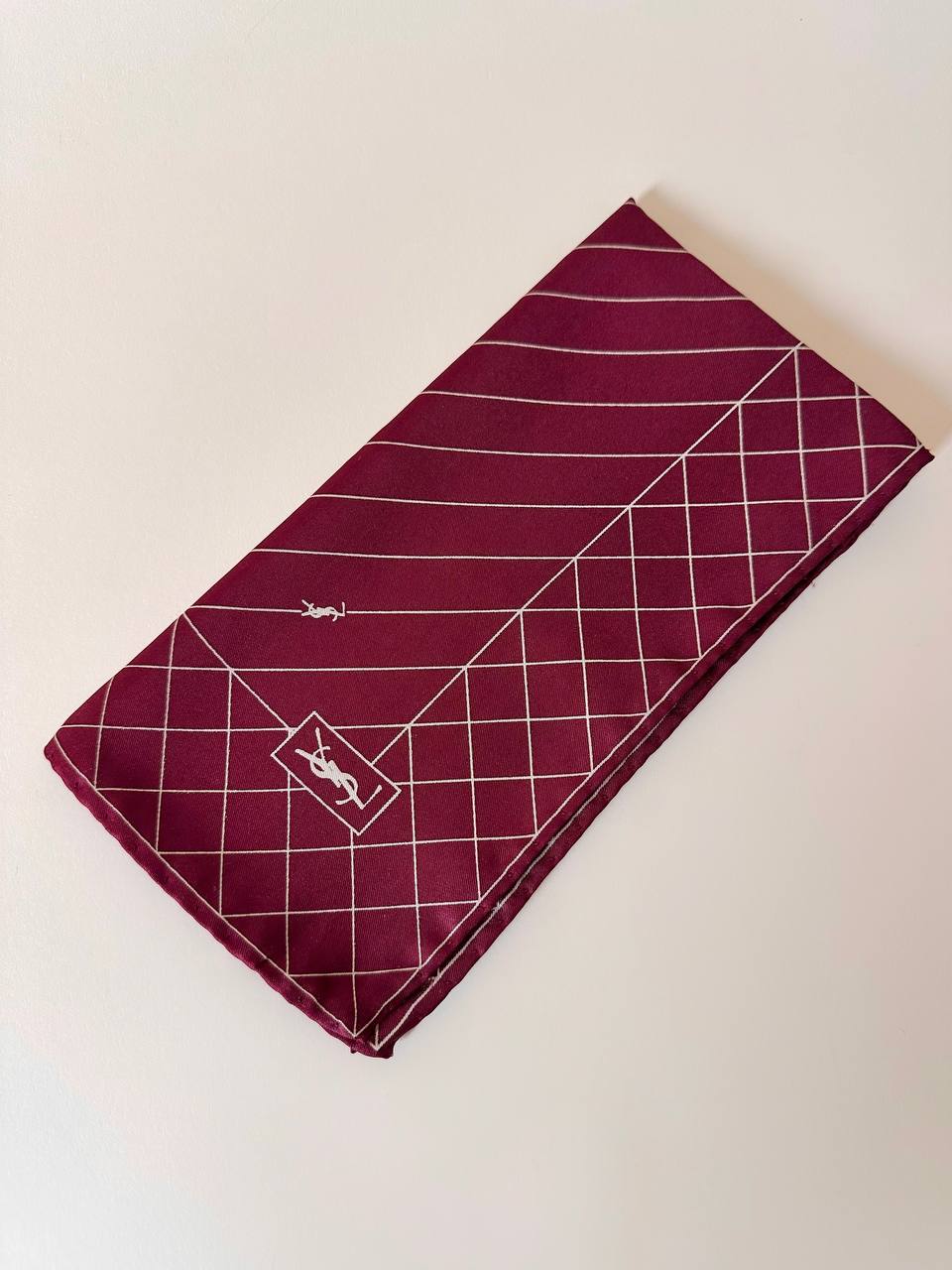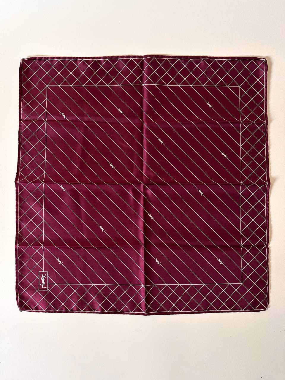 Mini foulard bordeaux con fantasia reticolata e loghi color avorio, firmato Yves Saint Laurent.