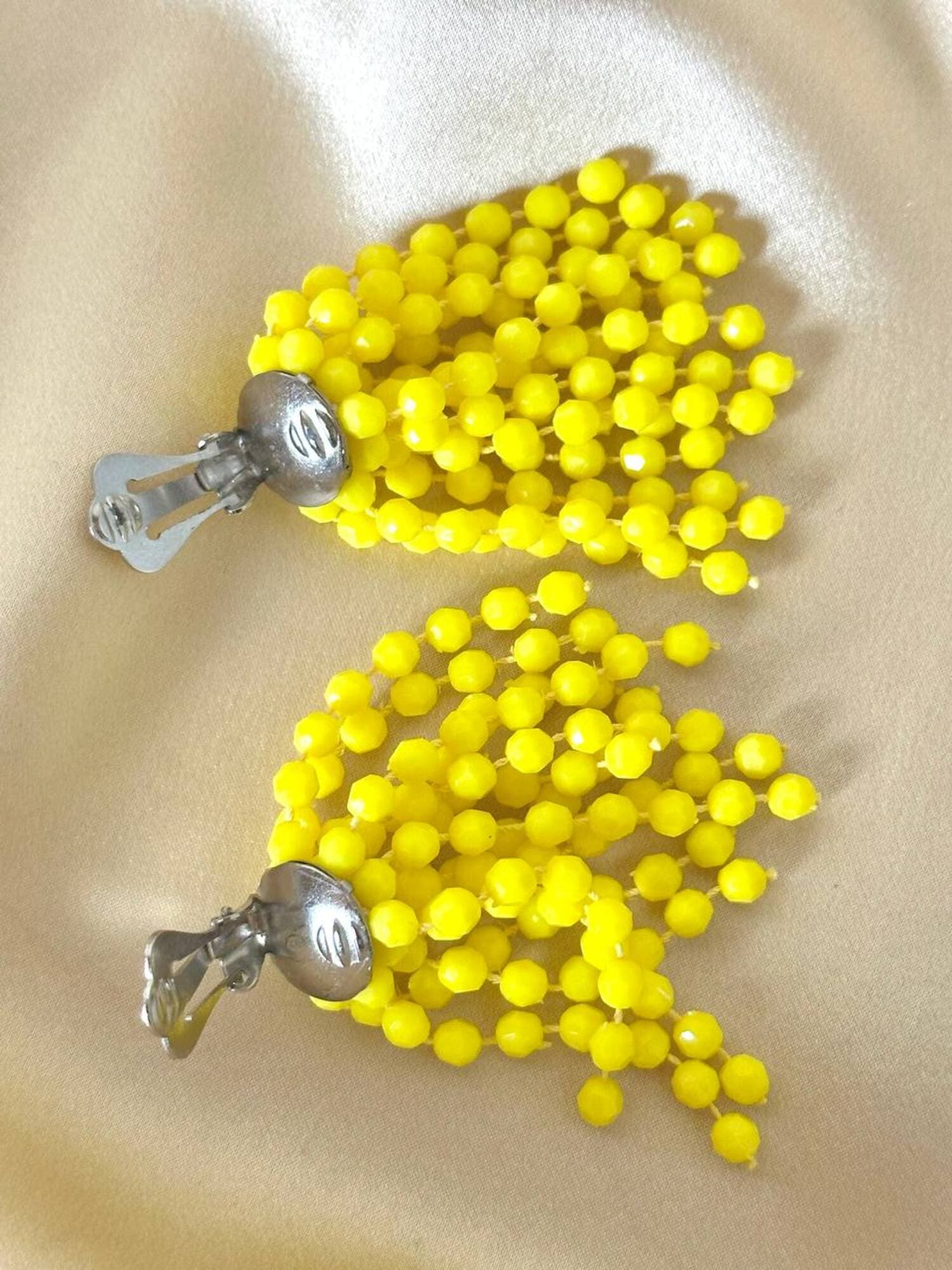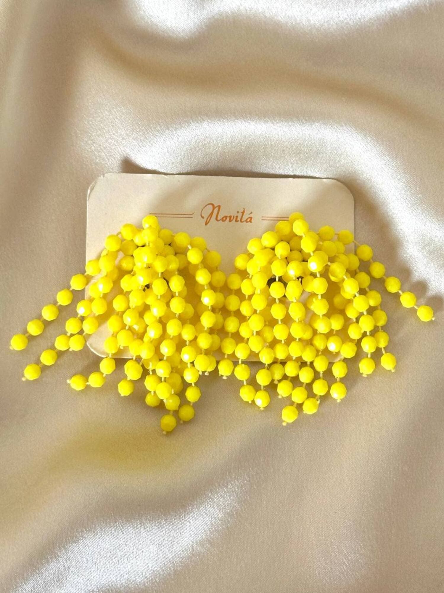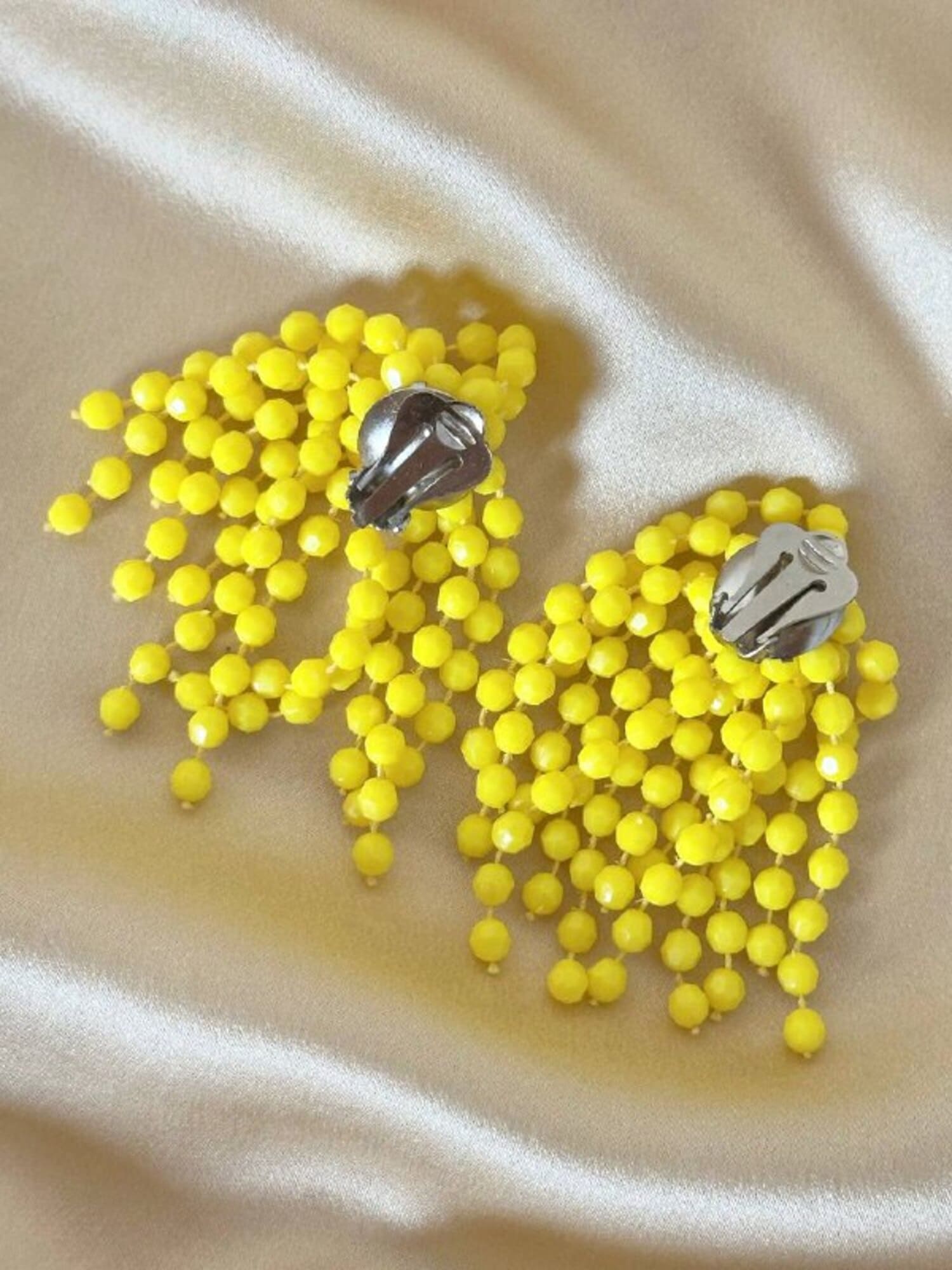 Orecchini a grappolo anni ’70, dal fascino vivace e senza tempo. Realizzate con fili di perline sfaccettate color lemon. La composizione a grappolo evoca il fiore di mimosa, mentre la clip a peletta silver garantisce comfort e tenuta impeccabile, anche per lobi non forati. Perfette per aggiungere un accento vivace a un look estivo.