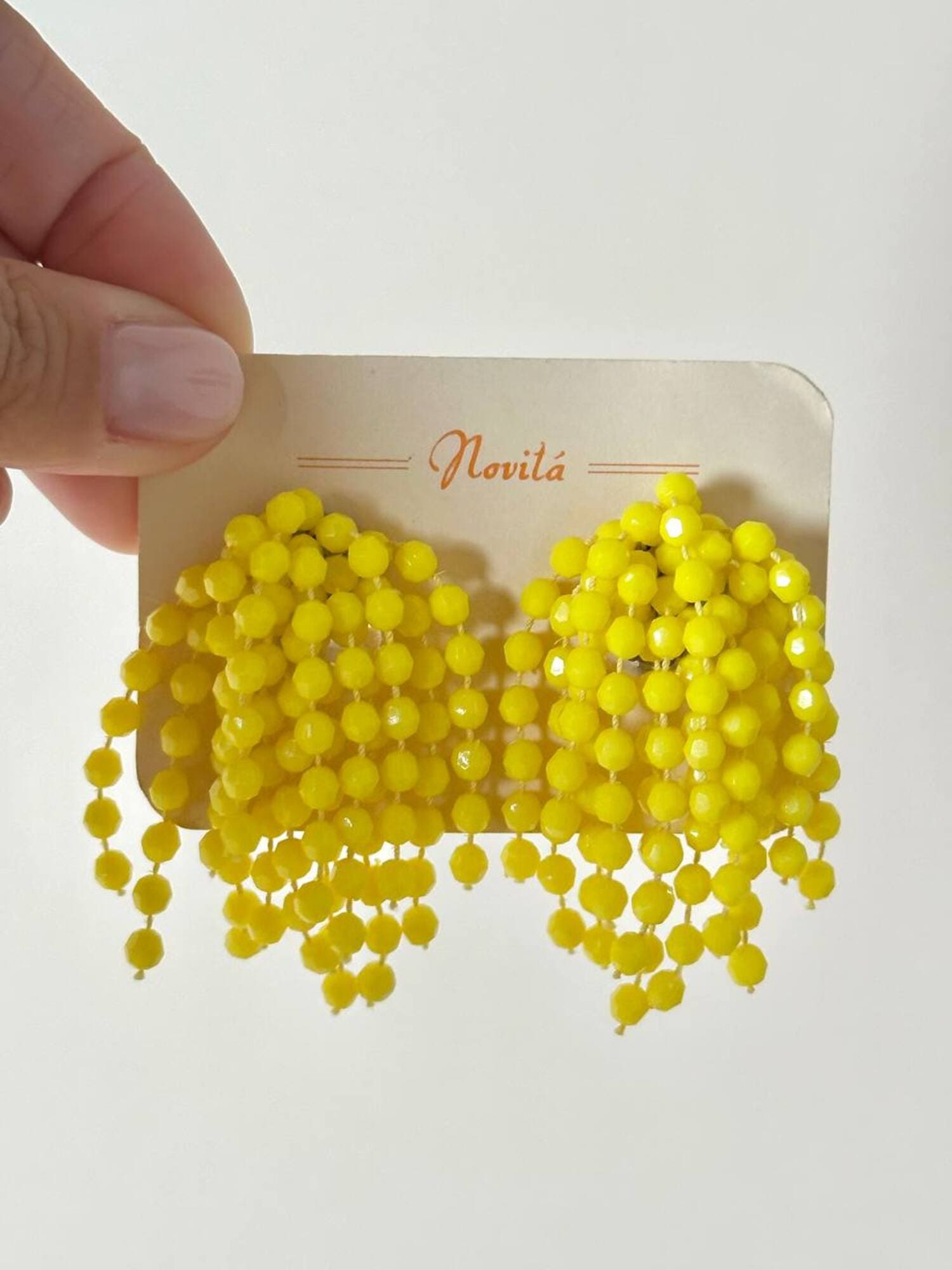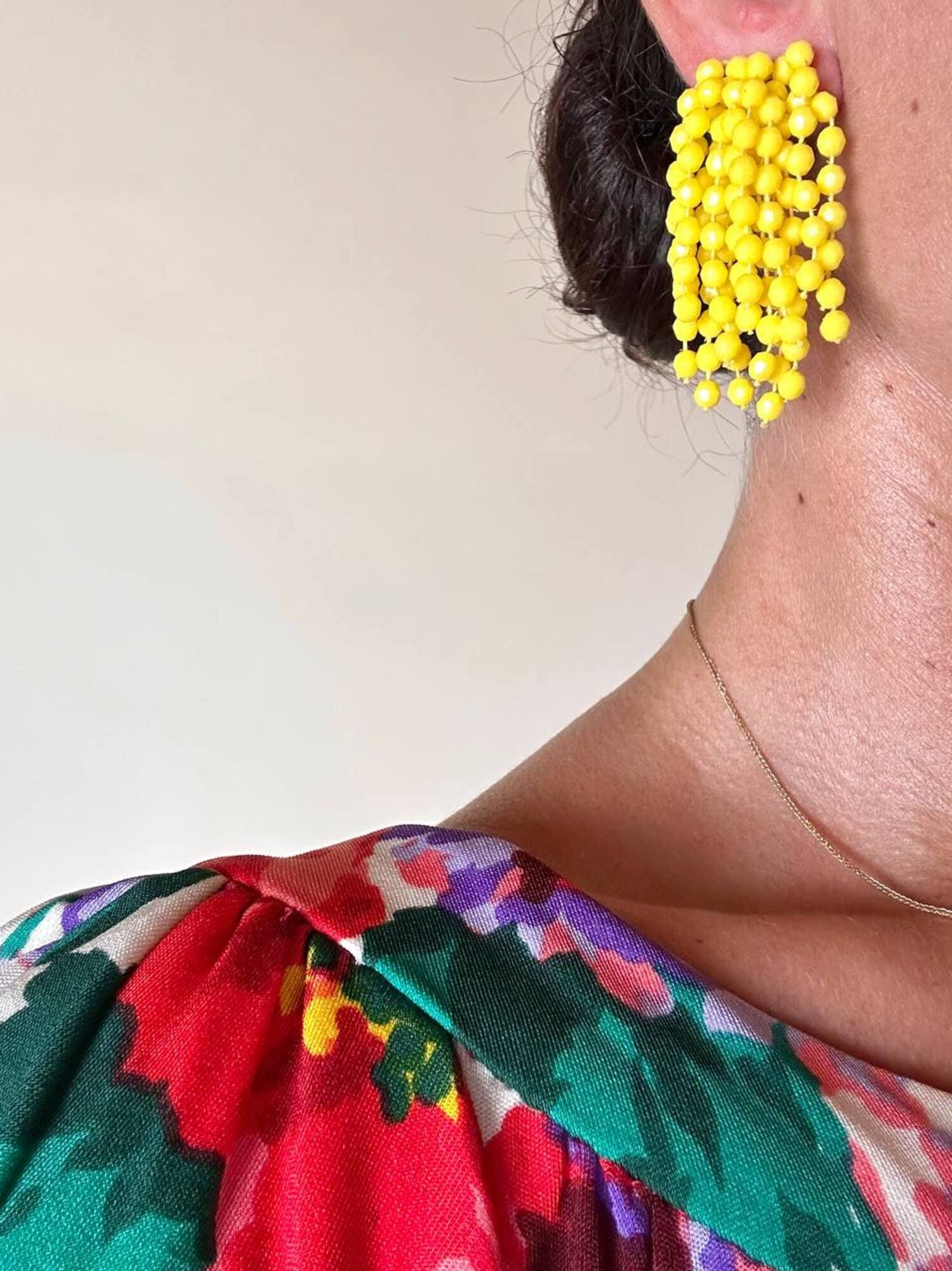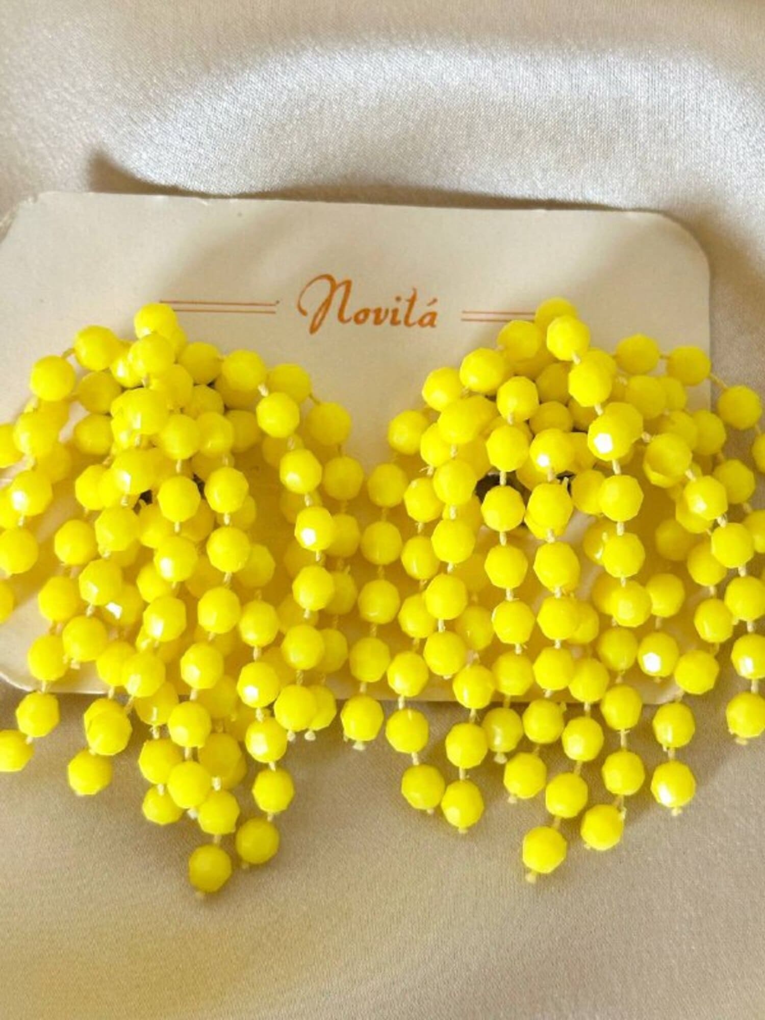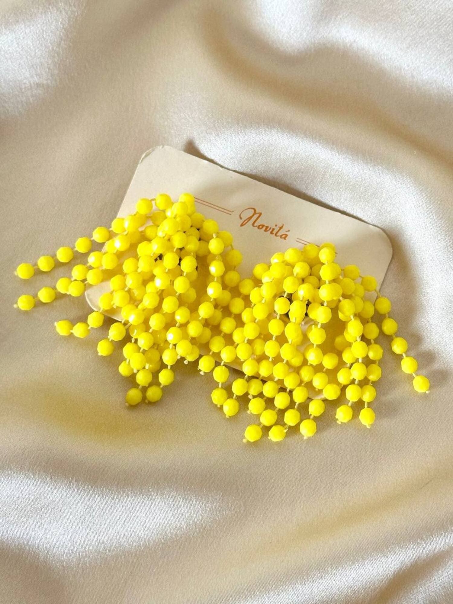 Orecchini a grappolo anni ’70, dal fascino vivace e senza tempo. Realizzate con fili di perline sfaccettate color lemon. La composizione a grappolo evoca il fiore di mimosa, mentre la clip a peletta silver garantisce comfort e tenuta impeccabile, anche per lobi non forati. Perfette per aggiungere un accento vivace a un look estivo.