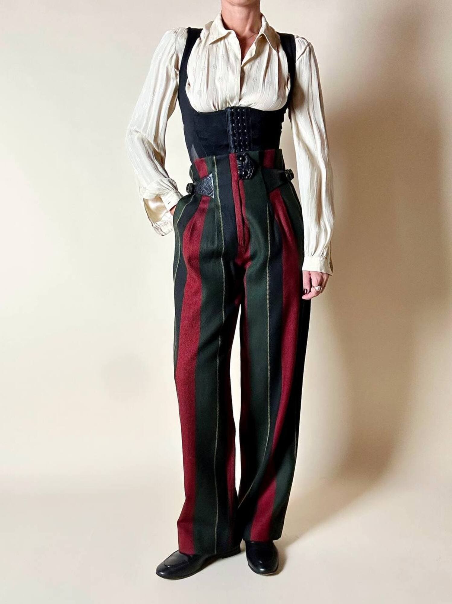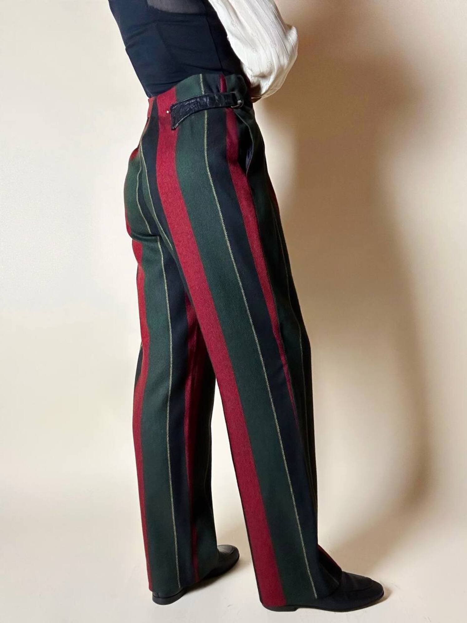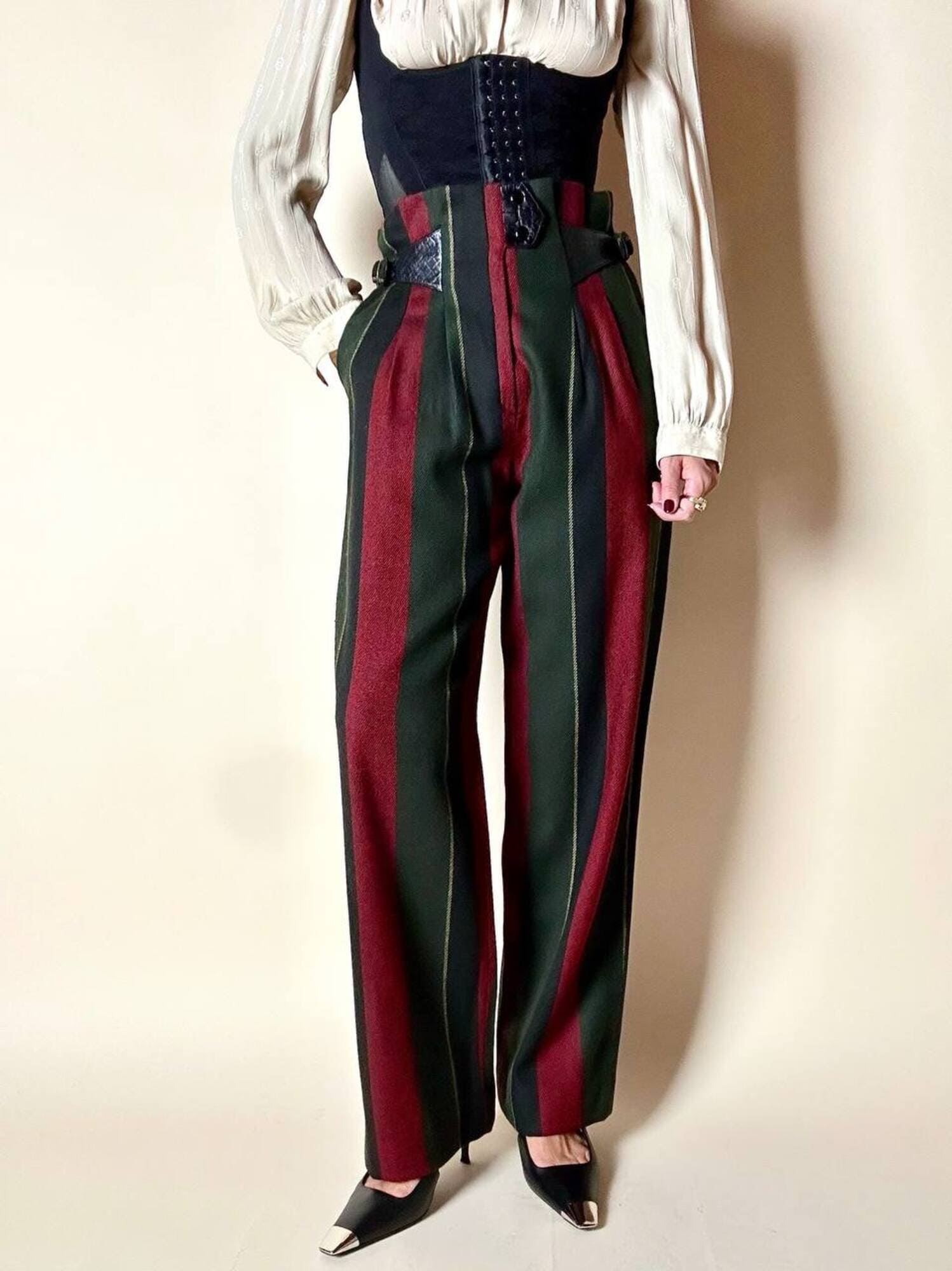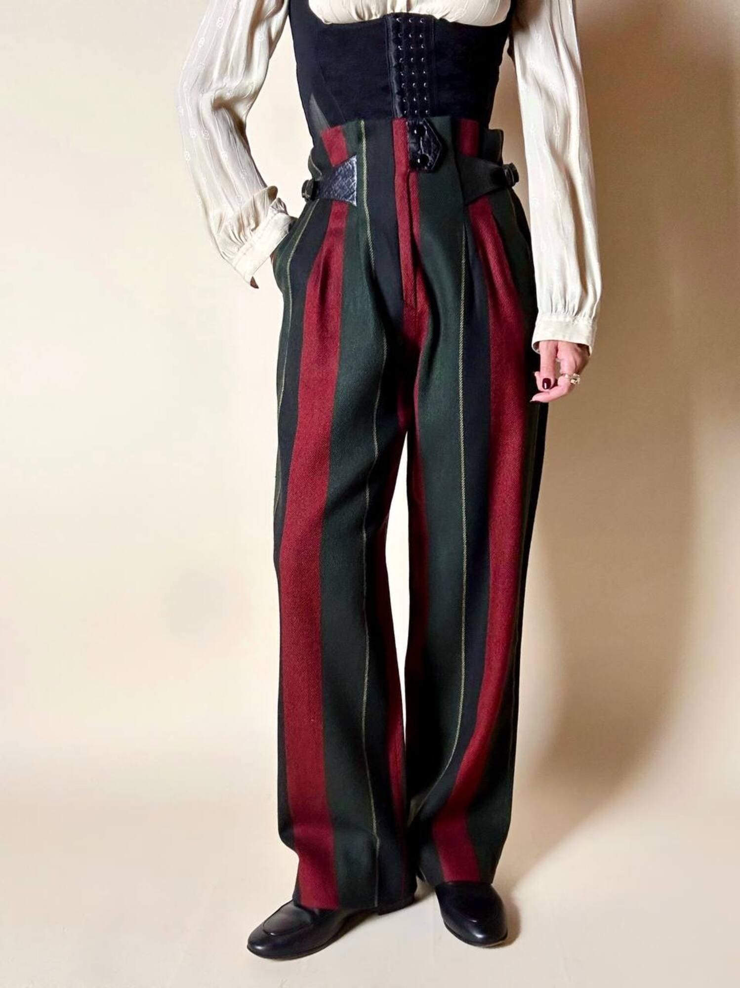 Questo pantalone a vita alta in lana jacquard a righe verticali reinterpreta i codici dell’eleganza sartoriale con un’estetica moderna e distintiva. Le righe verticali nei toni del rosso bordeaux, nero e verde bosco, valorizzano la silhouette slanciandola visivamente, mentre la lavorazione jacquard dona profondità materica e un tocco ricercato. La vita alta è costruita con pince all’inglese e definita da due cinturini laterali in pelle nera bottolata, e dotati di piccoli anelli scorsoi che permettono di modulare la vestibilità. Un dettaglio funzionale che diventa elemento ricercato di stile. La gamba dritta presenta un taglio comodo e versatile, ideale sia per look eleganti sia per outfit daily dall’allure sofisticata. L’apertura frontale con zip e due bottoni a pressione con testa in smalto nero aggiunge una nota contemporanea e pulita. Un pantalone dal design ricercato e sofisticato, perfetto per chi cerca un capo dall’anima forte, capace di caratterizzare il look con equilibrio tra rigore sartoriale e modernità.