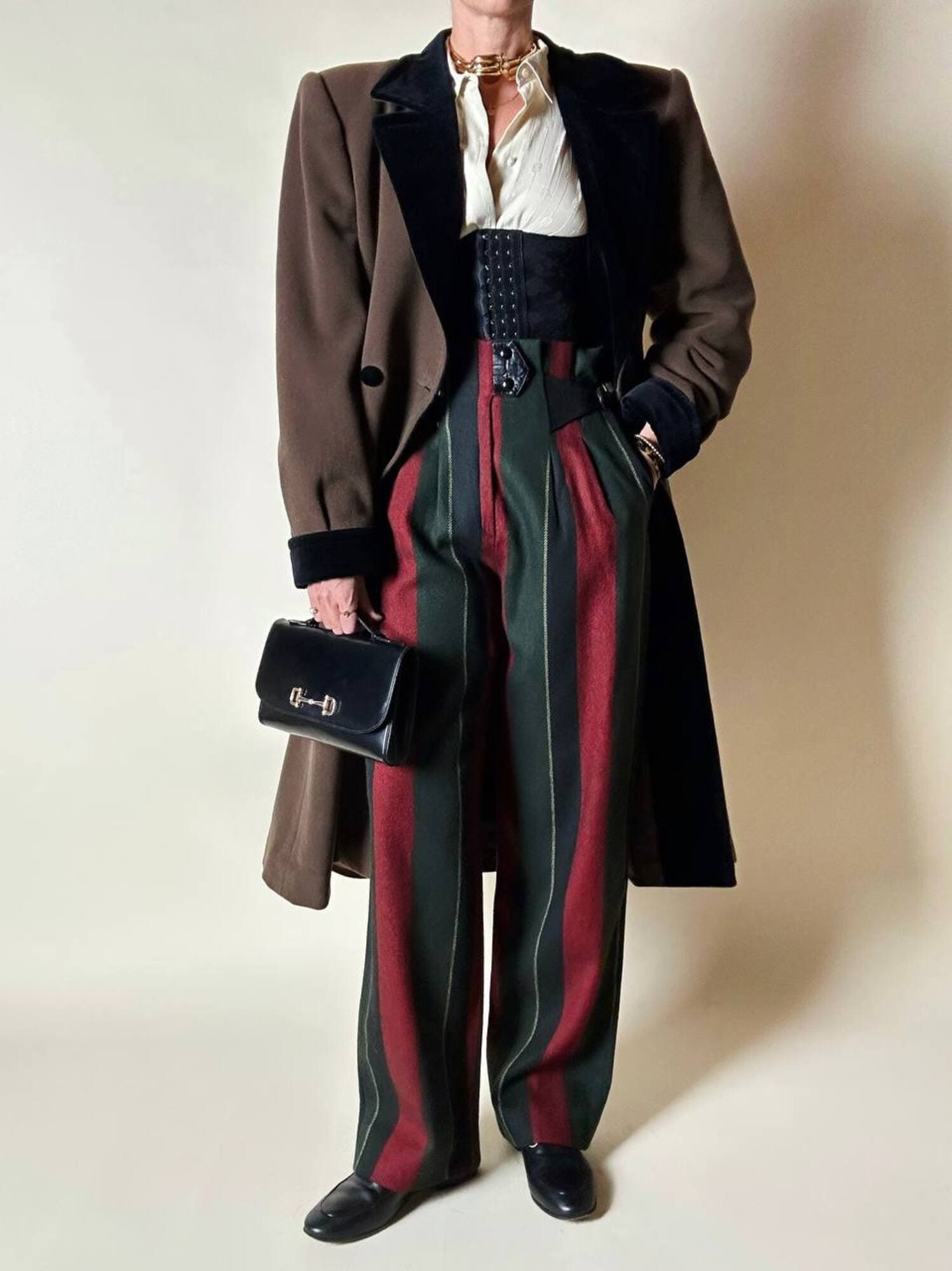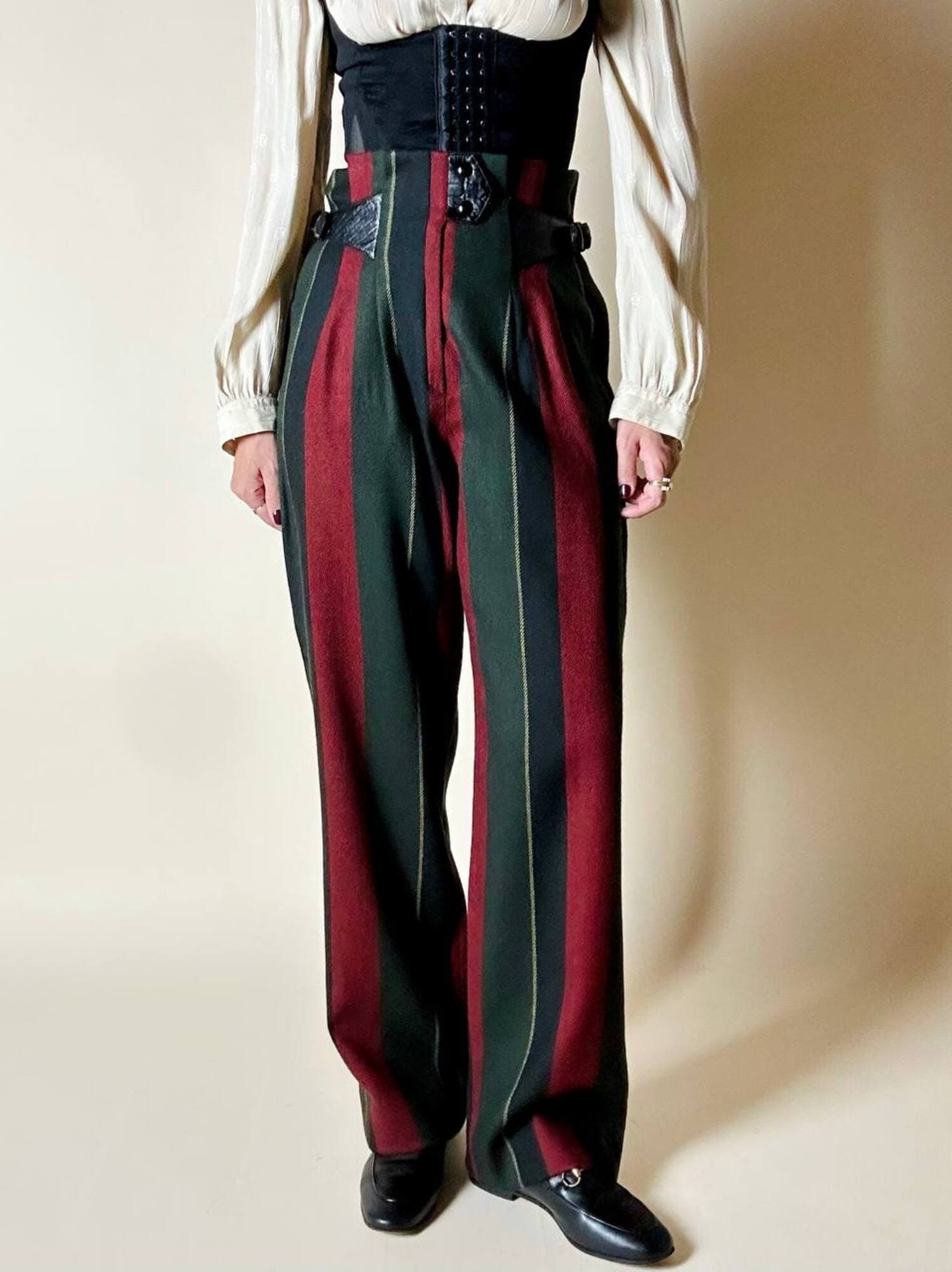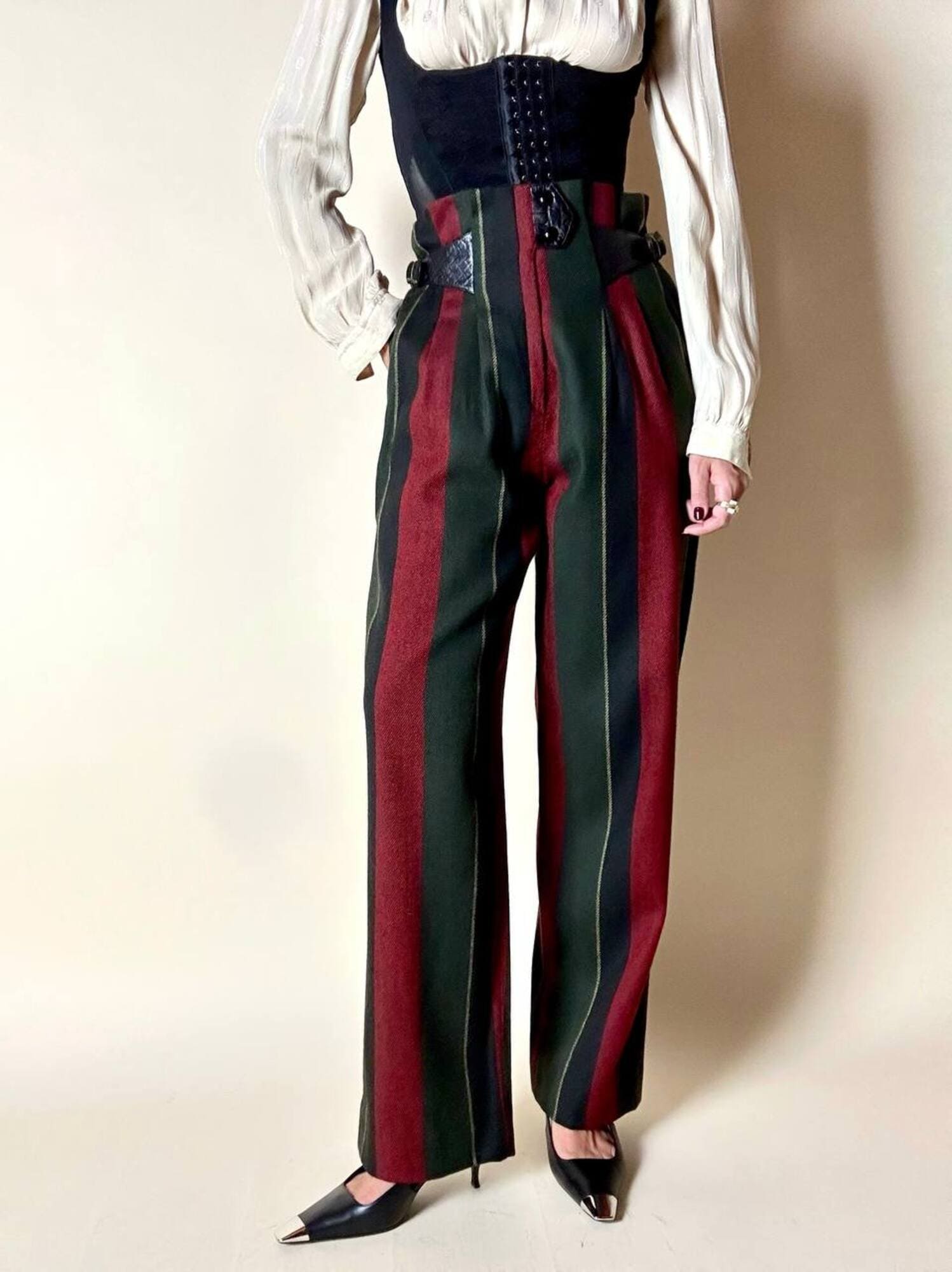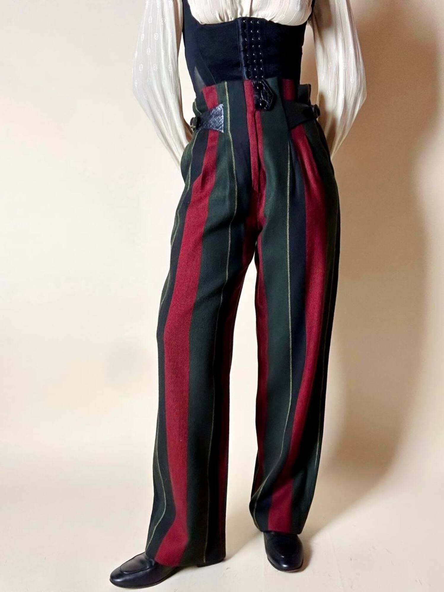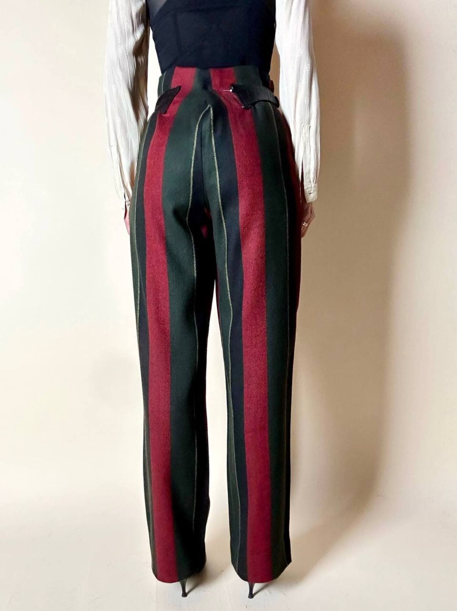 Questo pantalone a vita alta in lana jacquard a righe verticali reinterpreta i codici dell’eleganza sartoriale con un’estetica moderna e distintiva. Le righe verticali nei toni del rosso bordeaux, nero e verde bosco, valorizzano la silhouette slanciandola visivamente, mentre la lavorazione jacquard dona profondità materica e un tocco ricercato. La vita alta è costruita con pince all’inglese e definita da due cinturini laterali in pelle nera bottolata, e dotati di piccoli anelli scorsoi che permettono di modulare la vestibilità. Un dettaglio funzionale che diventa elemento ricercato di stile. La gamba dritta presenta un taglio comodo e versatile, ideale sia per look eleganti sia per outfit daily dall’allure sofisticata. L’apertura frontale con zip e due bottoni a pressione con testa in smalto nero aggiunge una nota contemporanea e pulita. Un pantalone dal design ricercato e sofisticato, perfetto per chi cerca un capo dall’anima forte, capace di caratterizzare il look con equilibrio tra rigore sartoriale e modernità.