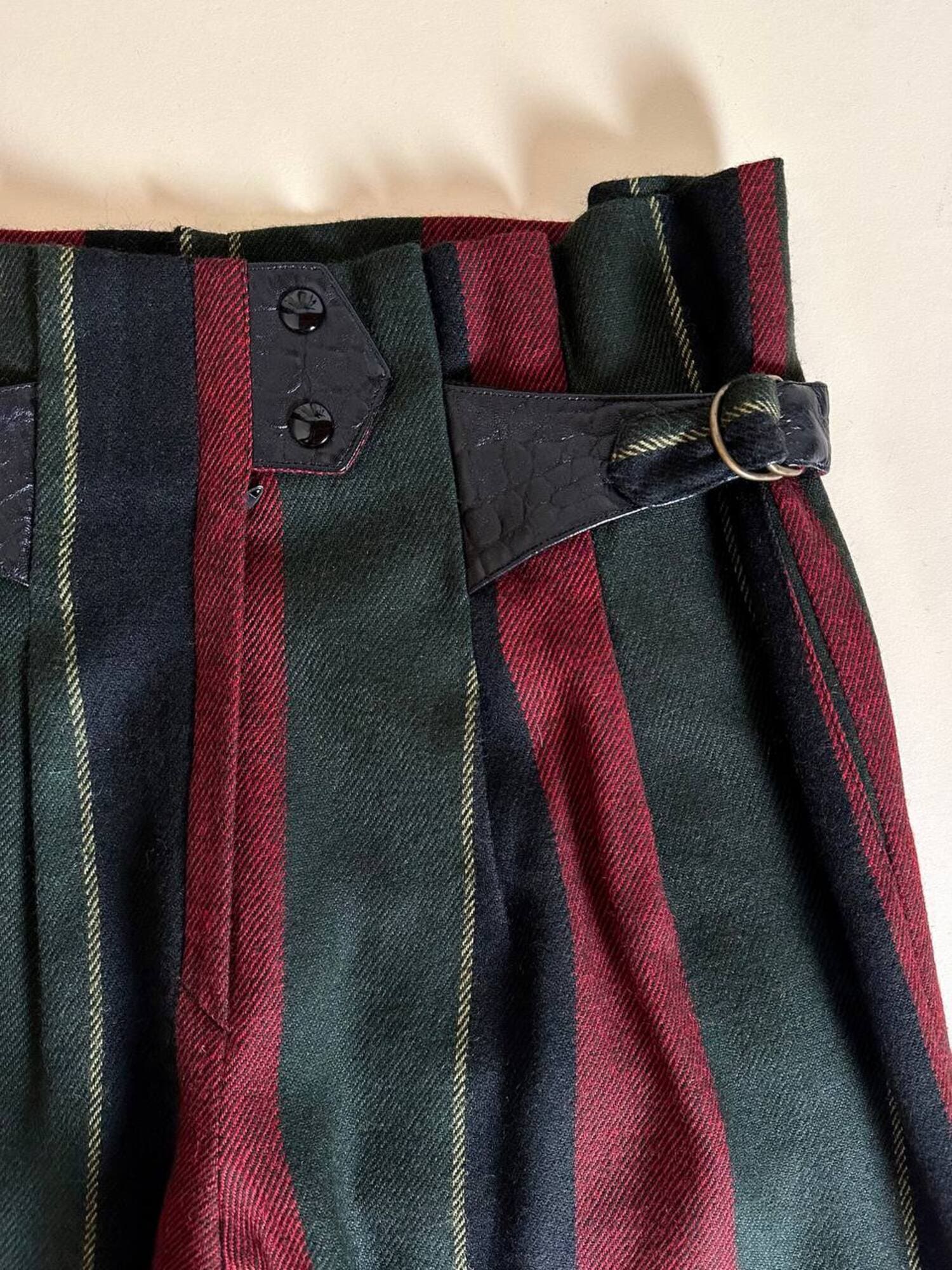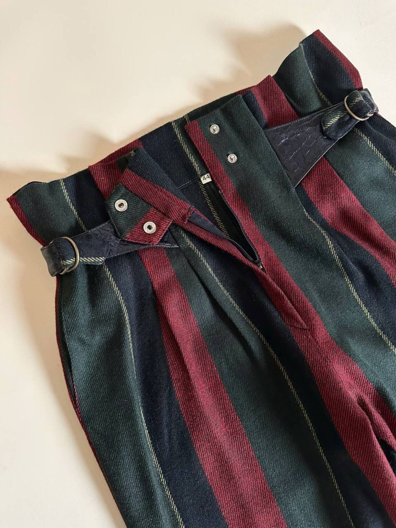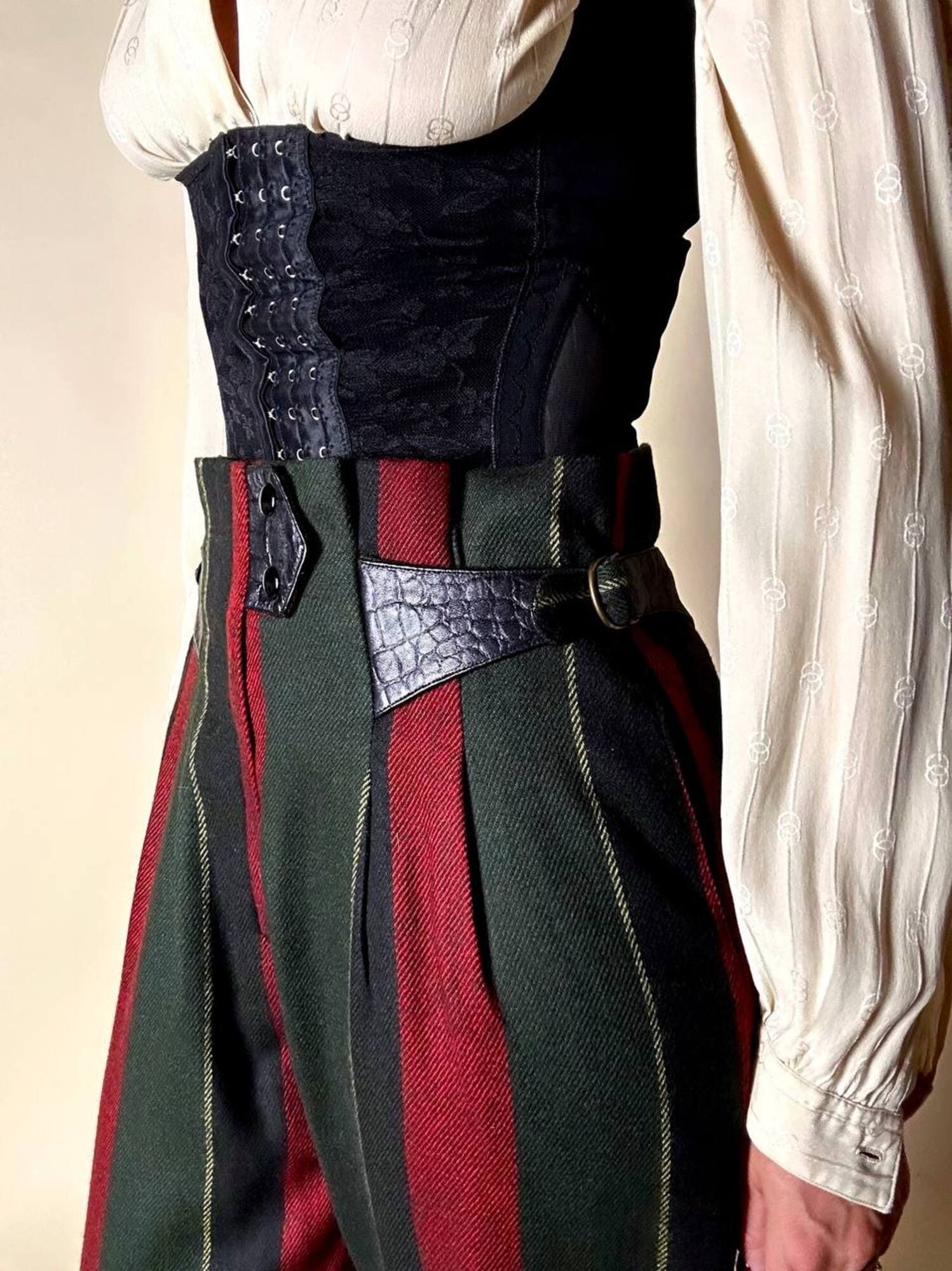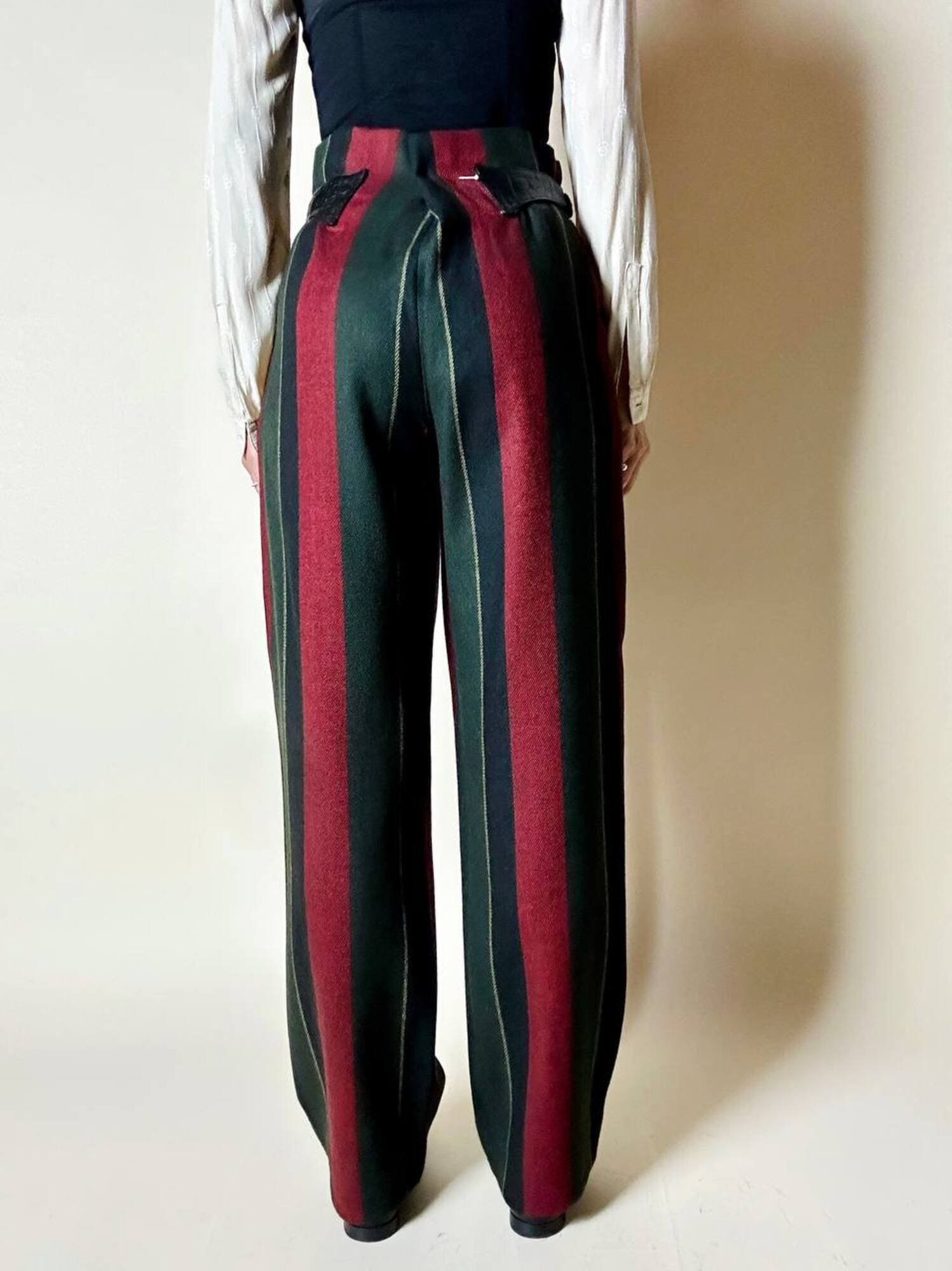 Questo pantalone a vita alta in lana jacquard a righe verticali reinterpreta i codici dell’eleganza sartoriale con un’estetica moderna e distintiva. Le righe verticali nei toni del rosso bordeaux, nero e verde bosco, valorizzano la silhouette slanciandola visivamente, mentre la lavorazione jacquard dona profondità materica e un tocco ricercato. La vita alta è costruita con pince all’inglese e definita da due cinturini laterali in pelle nera bottolata, e dotati di piccoli anelli scorsoi che permettono di modulare la vestibilità. Un dettaglio funzionale che diventa elemento ricercato di stile. La gamba dritta presenta un taglio comodo e versatile, ideale sia per look eleganti sia per outfit daily dall’allure sofisticata. L’apertura frontale con zip e due bottoni a pressione con testa in smalto nero aggiunge una nota contemporanea e pulita. Un pantalone dal design ricercato e sofisticato, perfetto per chi cerca un capo dall’anima forte, capace di caratterizzare il look con equilibrio tra rigore sartoriale e modernità.