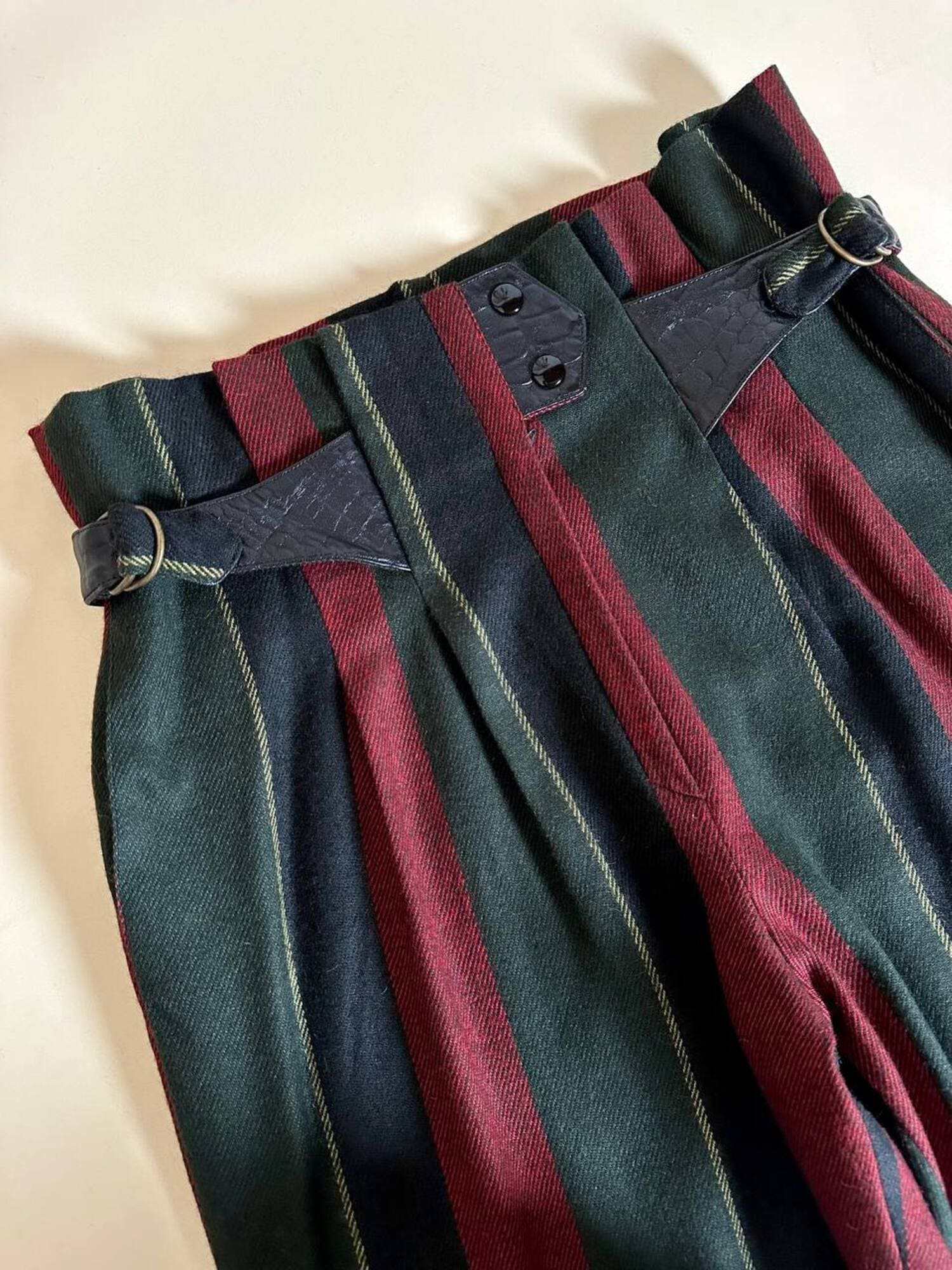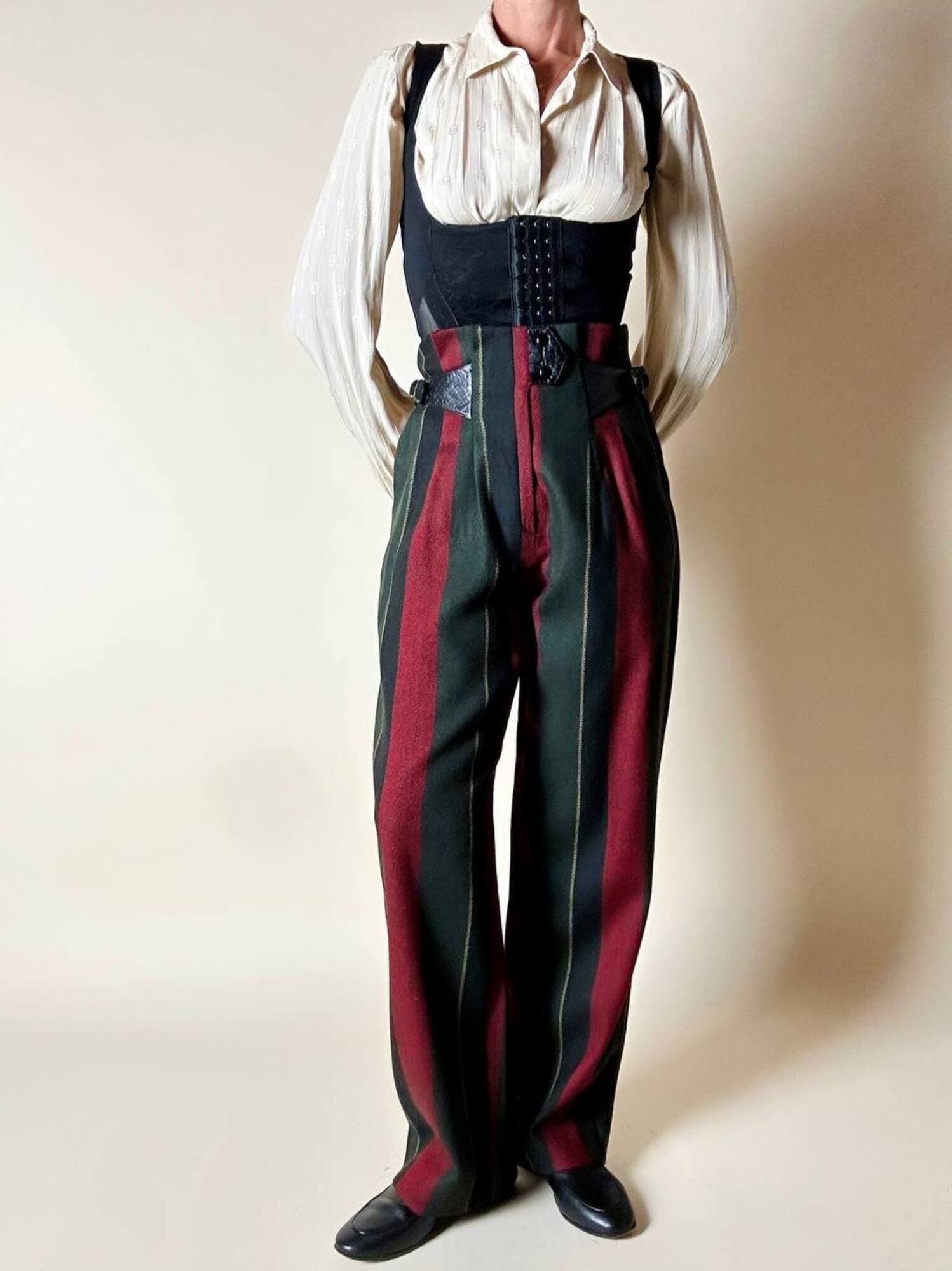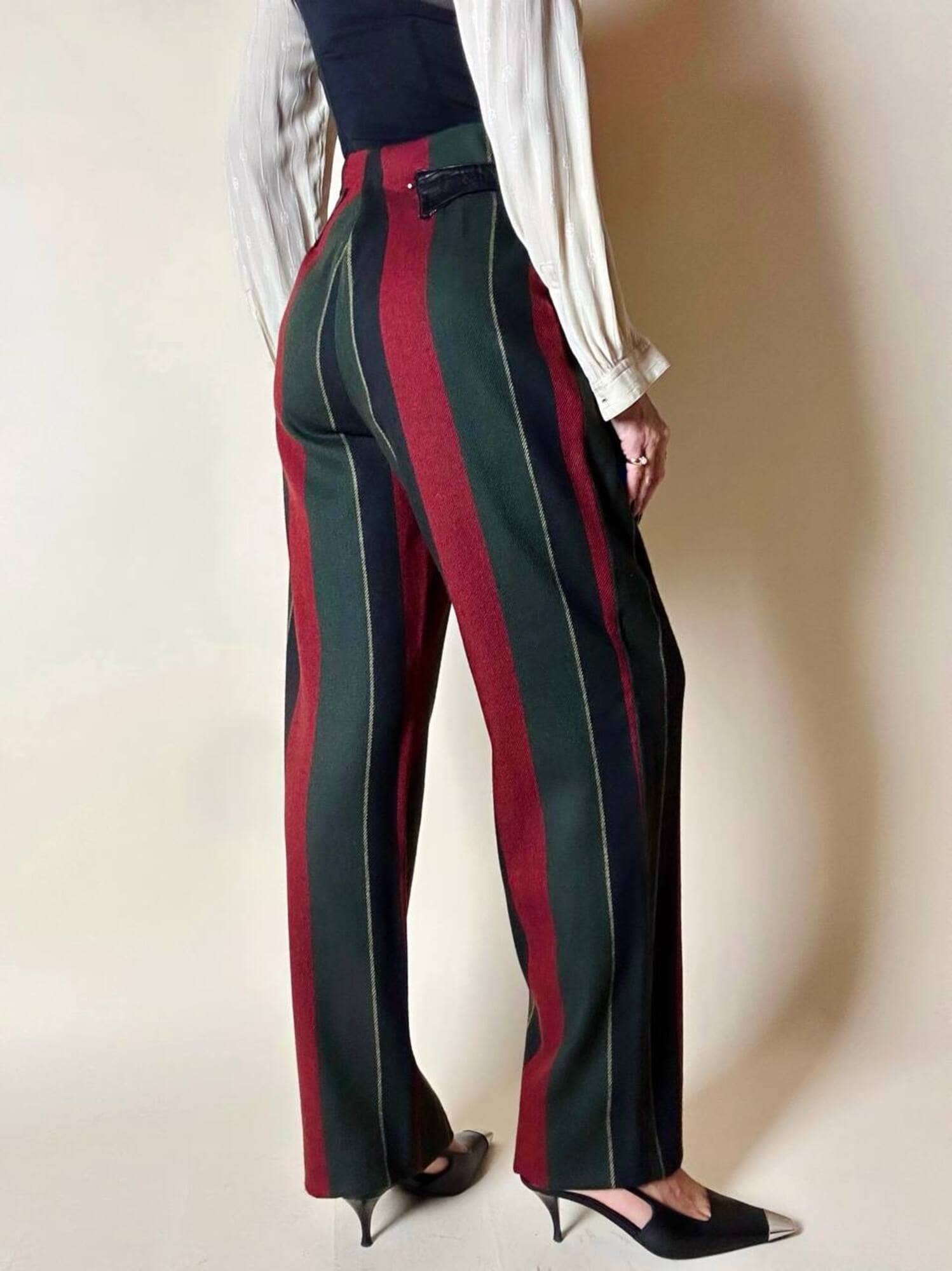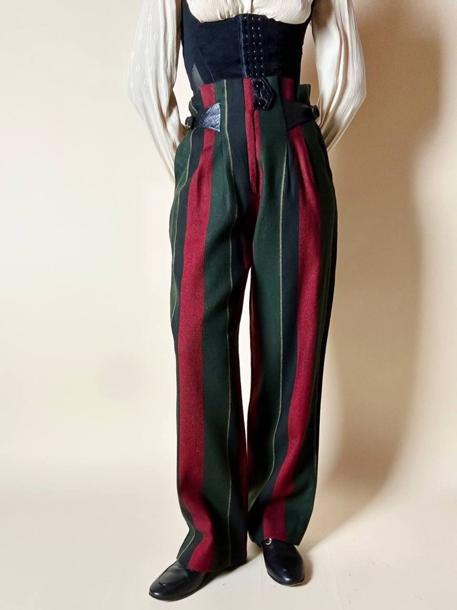 Questo pantalone a vita alta in lana jacquard a righe verticali reinterpreta i codici dell’eleganza sartoriale con un’estetica moderna e distintiva. Le righe verticali nei toni del rosso bordeaux, nero e verde bosco, valorizzano la silhouette slanciandola visivamente, mentre la lavorazione jacquard dona profondità materica e un tocco ricercato. La vita alta è costruita con pince all’inglese e definita da due cinturini laterali in pelle nera bottolata, e dotati di piccoli anelli scorsoi che permettono di modulare la vestibilità. Un dettaglio funzionale che diventa elemento ricercato di stile. La gamba dritta presenta un taglio comodo e versatile, ideale sia per look eleganti sia per outfit daily dall’allure sofisticata. L’apertura frontale con zip e due bottoni a pressione con testa in smalto nero aggiunge una nota contemporanea e pulita. Un pantalone dal design ricercato e sofisticato, perfetto per chi cerca un capo dall’anima forte, capace di caratterizzare il look con equilibrio tra rigore sartoriale e modernità.