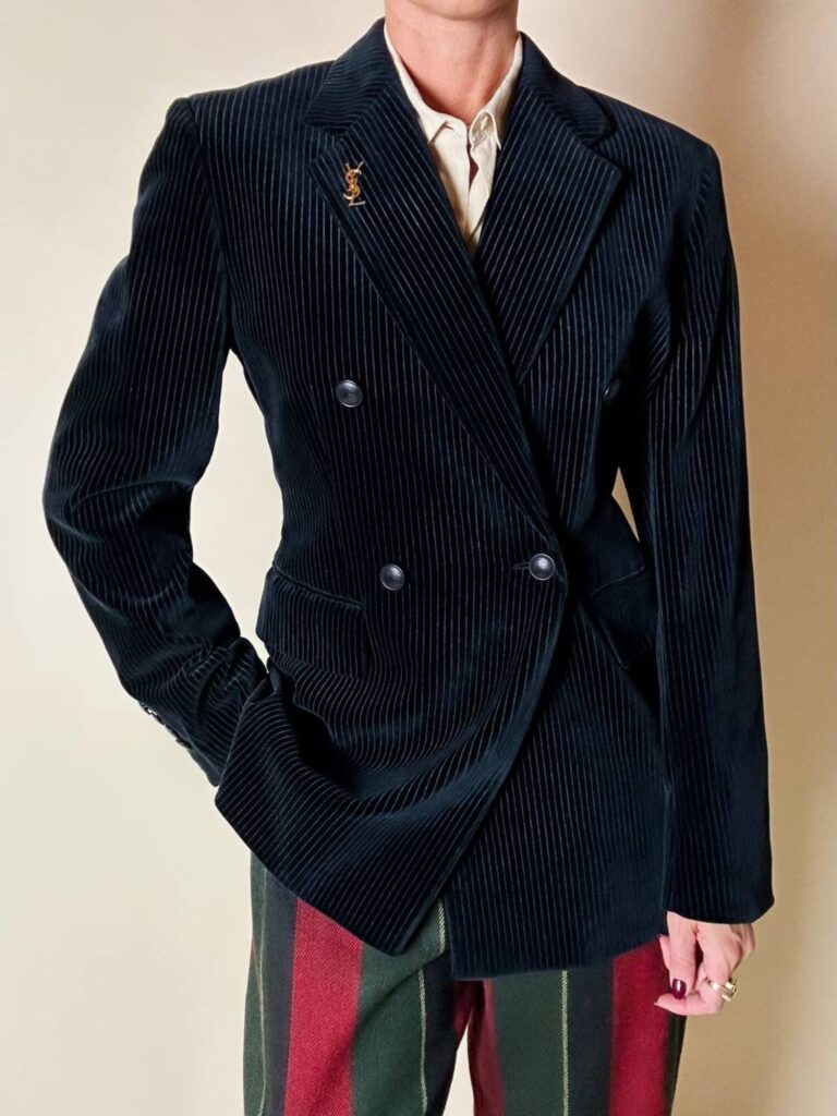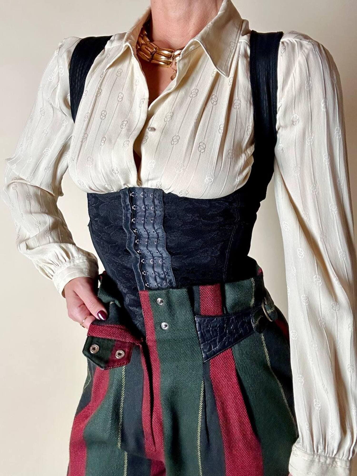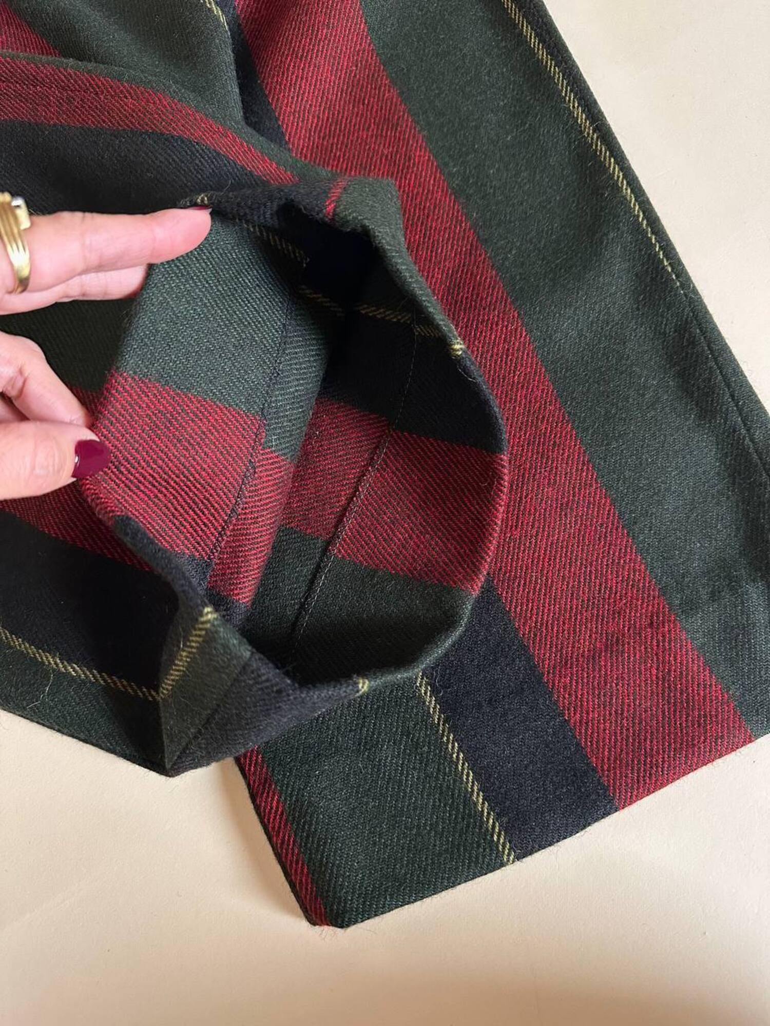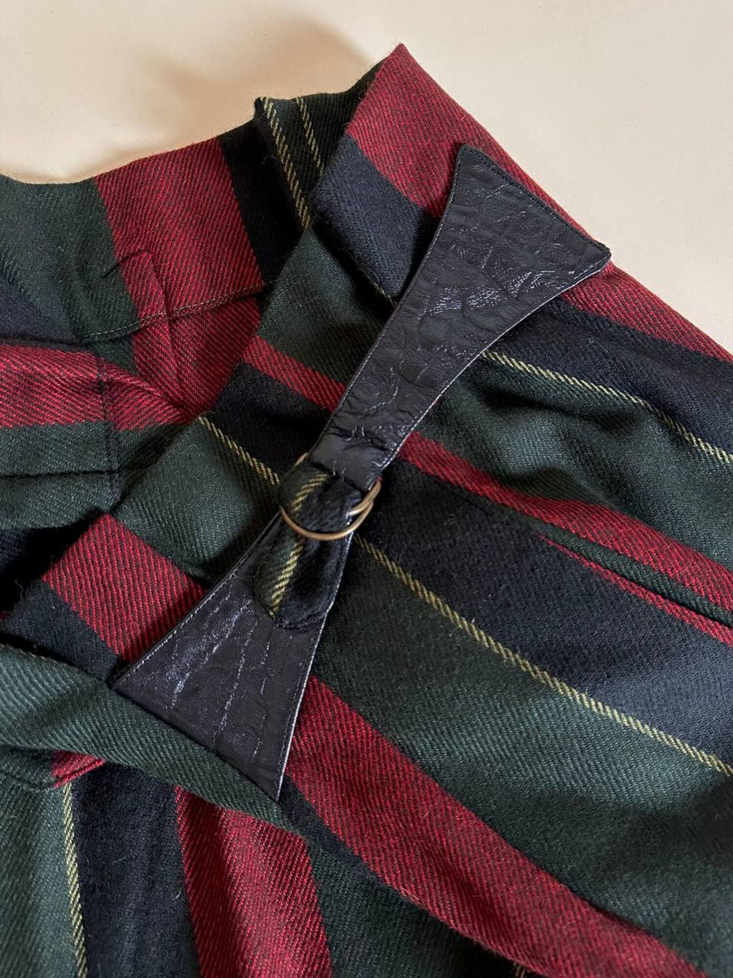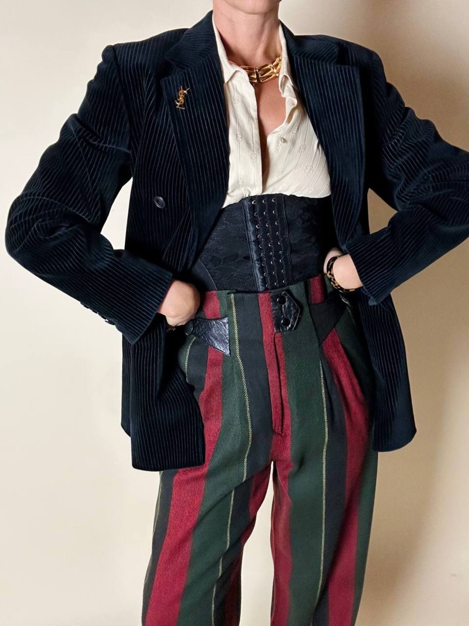 Questo pantalone a vita alta in lana jacquard a righe verticali reinterpreta i codici dell’eleganza sartoriale con un’estetica moderna e distintiva. Le righe verticali nei toni del rosso bordeaux, nero e verde bosco, valorizzano la silhouette slanciandola visivamente, mentre la lavorazione jacquard dona profondità materica e un tocco ricercato. La vita alta è costruita con pince all’inglese e definita da due cinturini laterali in pelle nera bottolata, e dotati di piccoli anelli scorsoi che permettono di modulare la vestibilità. Un dettaglio funzionale che diventa elemento ricercato di stile. La gamba dritta presenta un taglio comodo e versatile, ideale sia per look eleganti sia per outfit daily dall’allure sofisticata. L’apertura frontale con zip e due bottoni a pressione con testa in smalto nero aggiunge una nota contemporanea e pulita. Un pantalone dal design ricercato e sofisticato, perfetto per chi cerca un capo dall’anima forte, capace di caratterizzare il look con equilibrio tra rigore sartoriale e modernità.