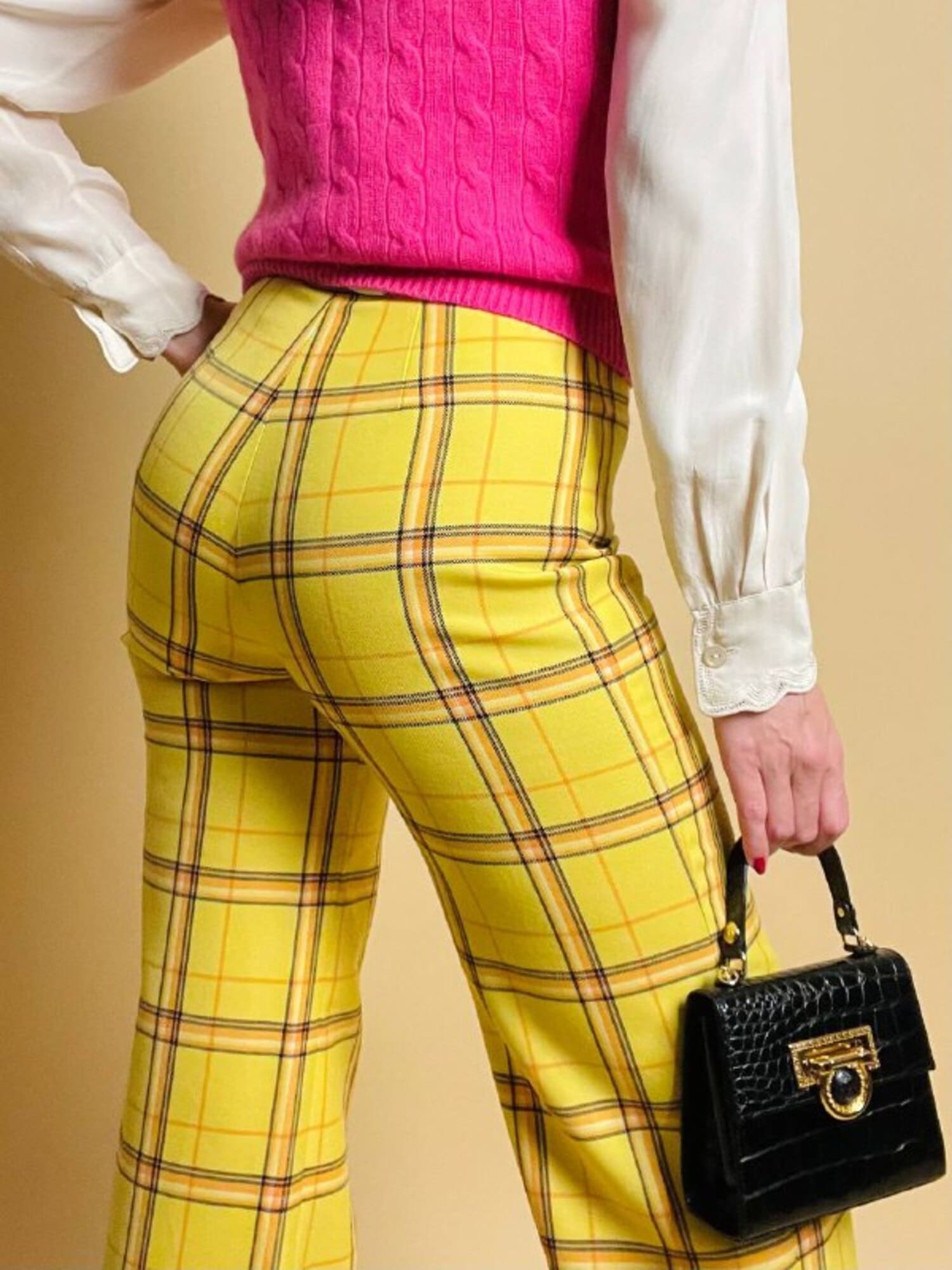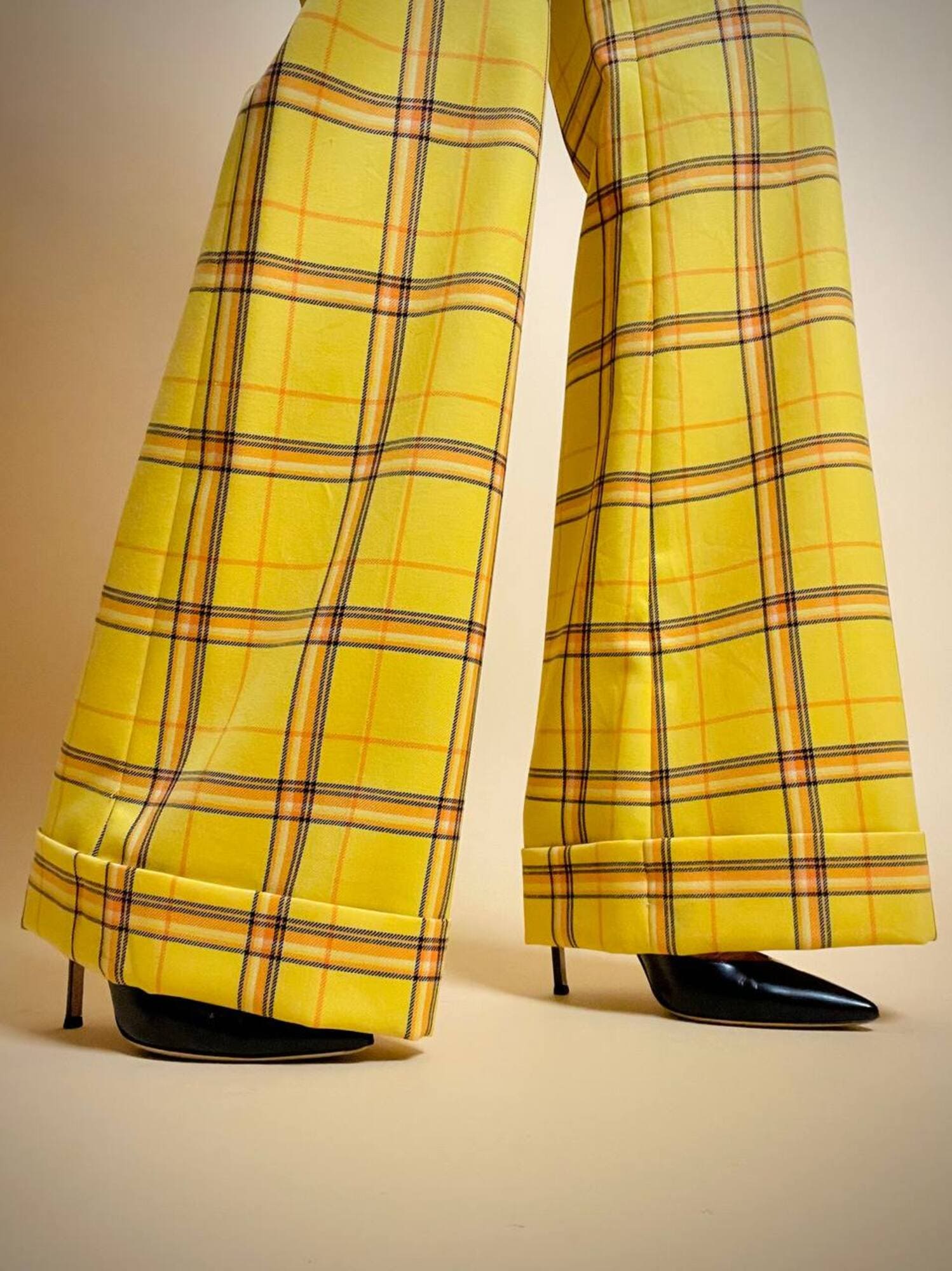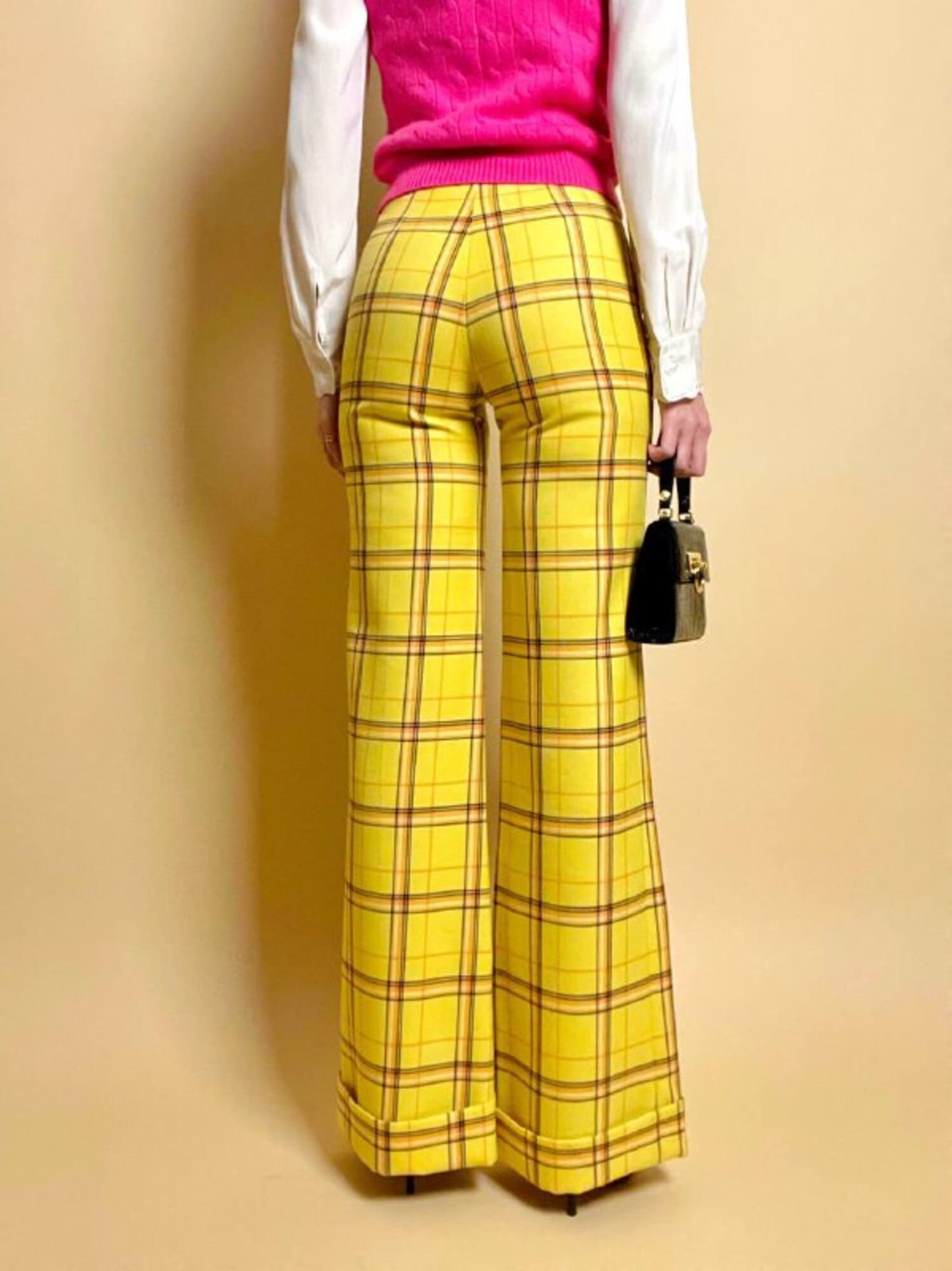 Pantalone a zampa giallo scuolabus fantasia tartan by “Trevira”. Vita alta, gamba molto svasata con risvolto sul fondo. Si apre con zip e bottone a pressione sul davanti.