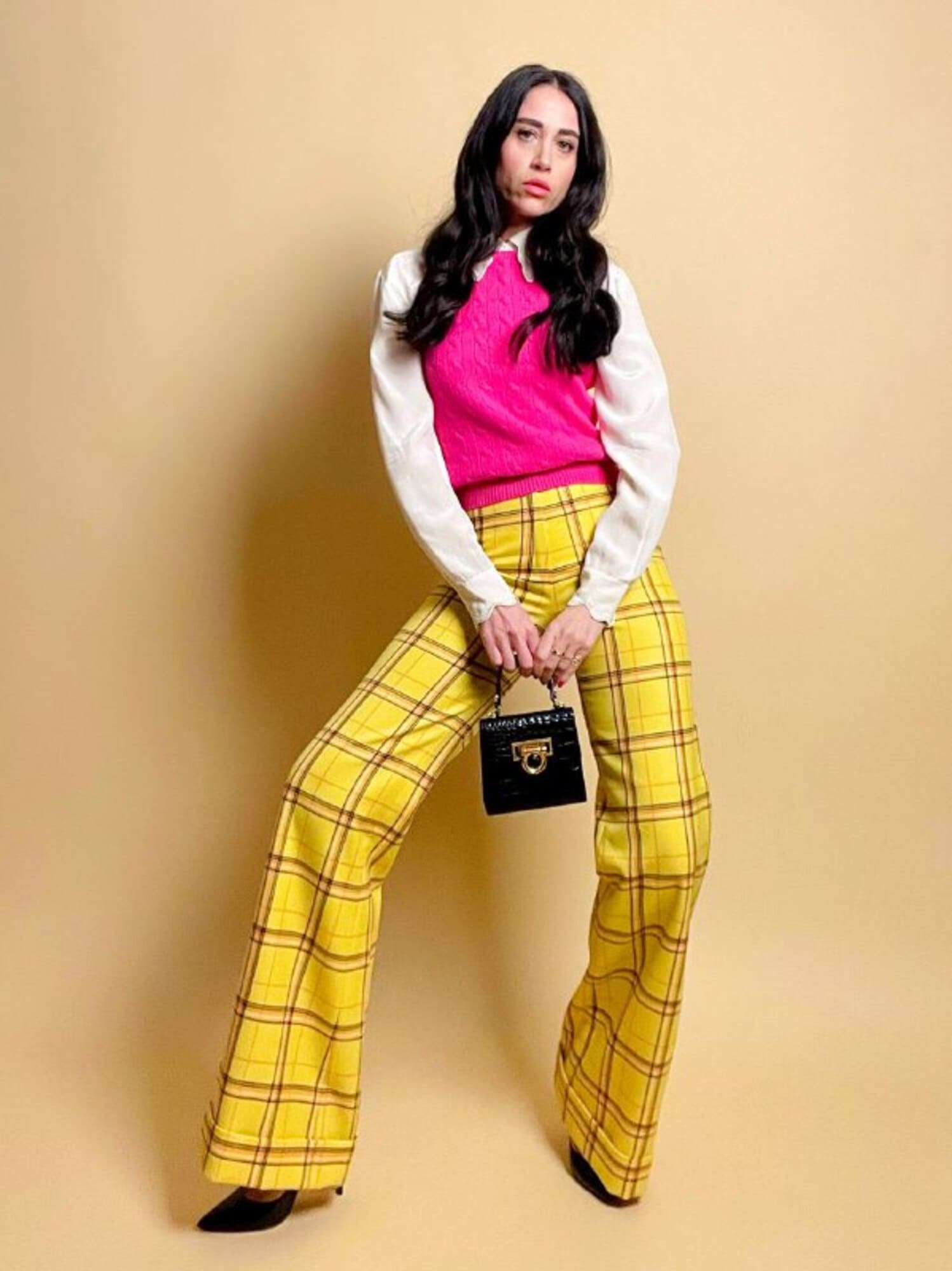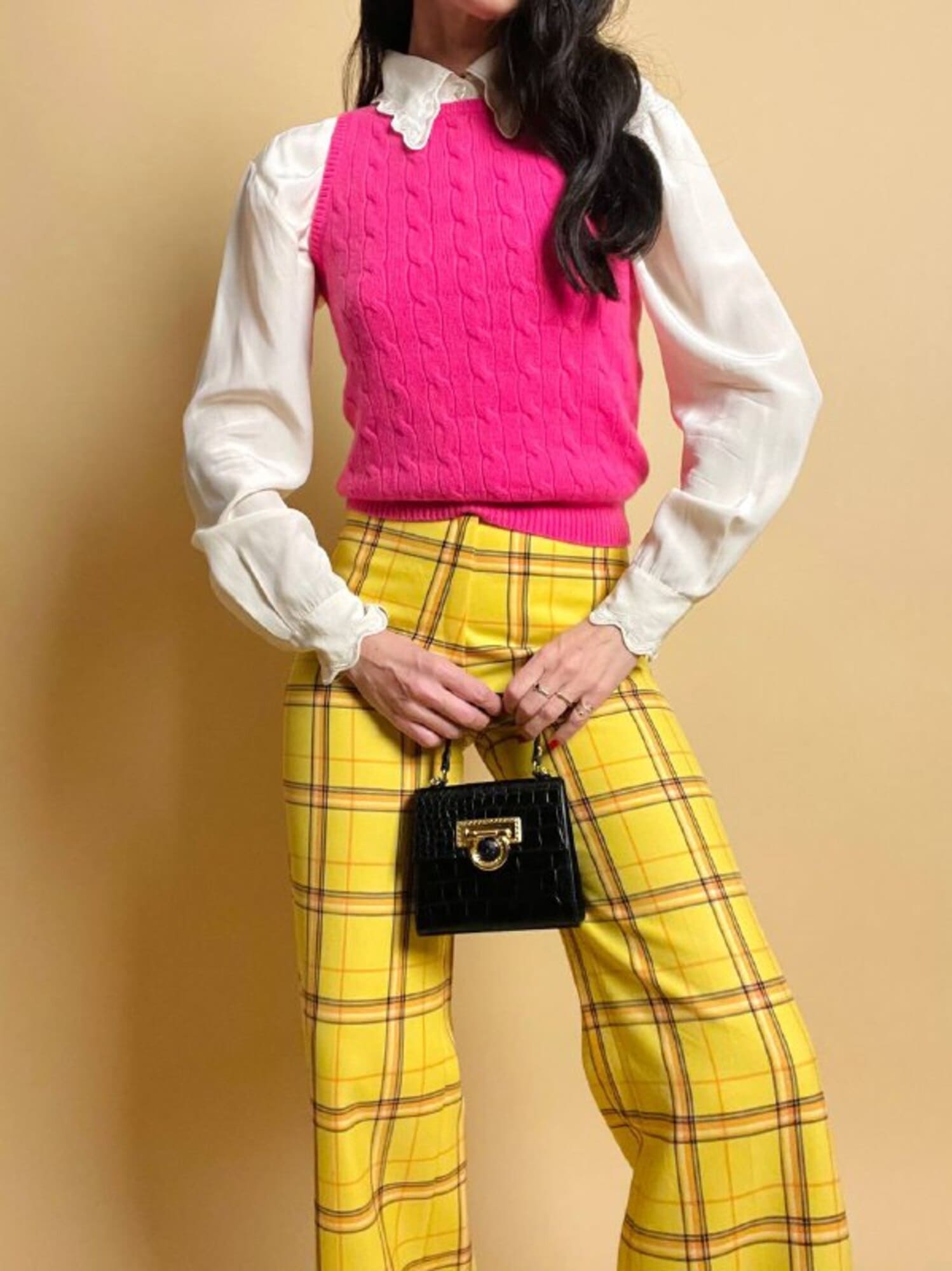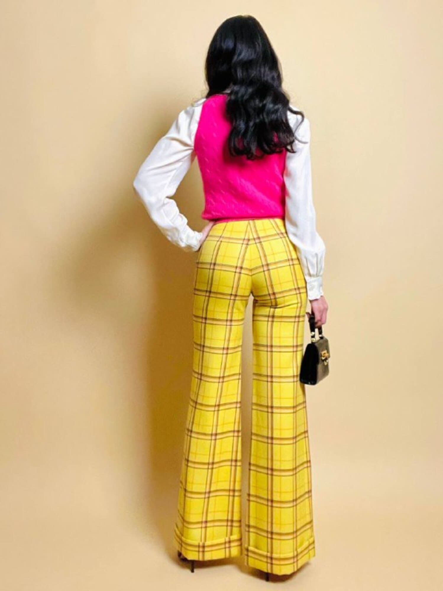 Pantalone a zampa giallo scuolabus fantasia tartan by “Trevira”. Vita alta, gamba molto svasata con risvolto sul fondo. Si apre con zip e bottone a pressione sul davanti.