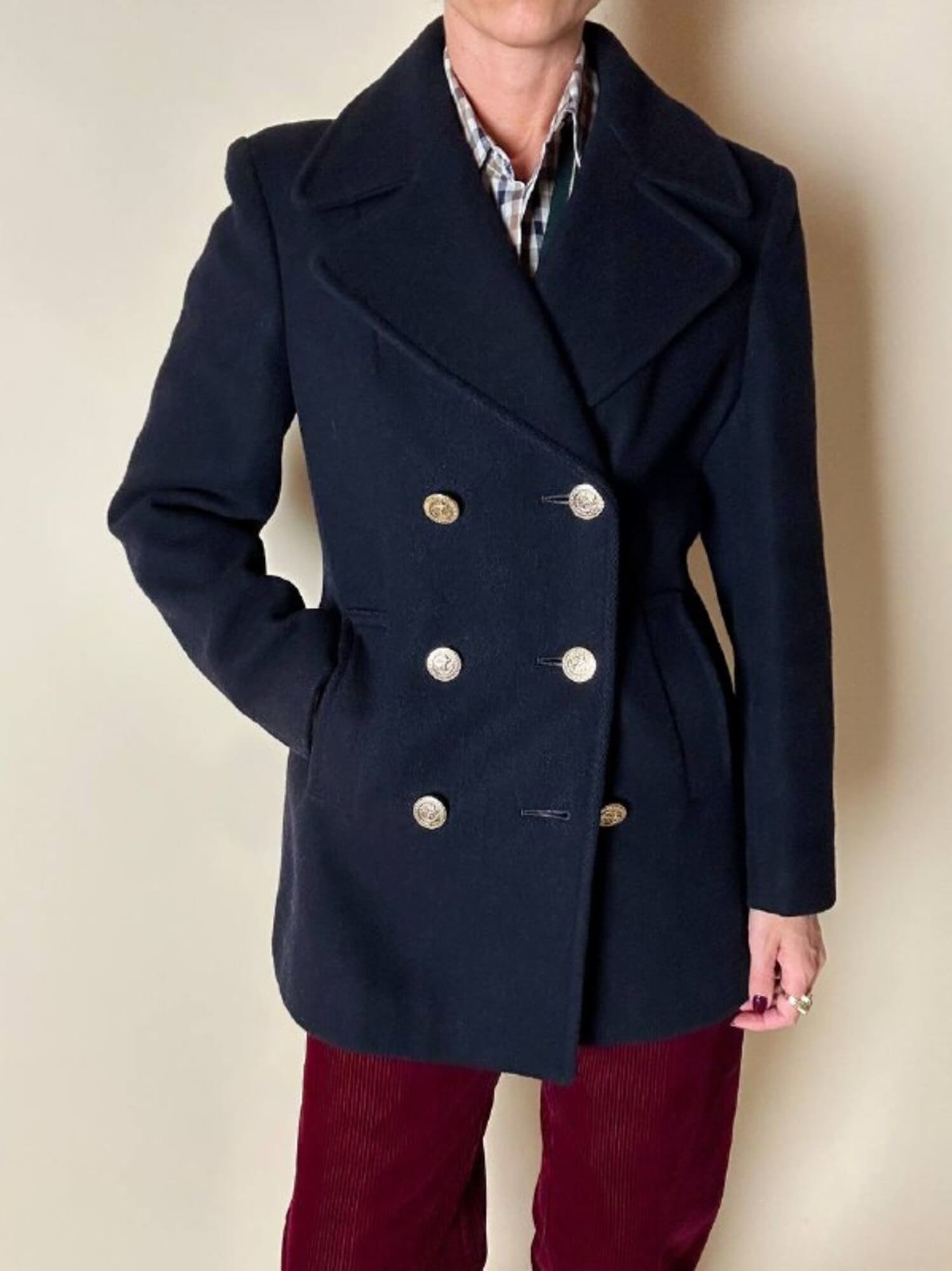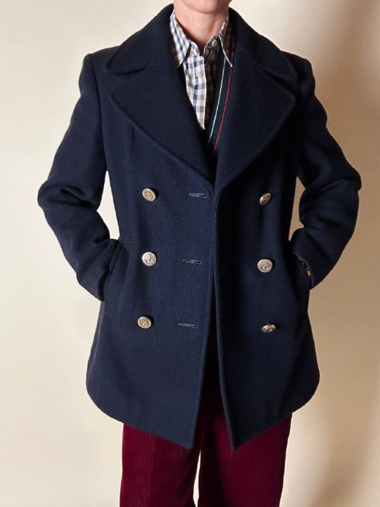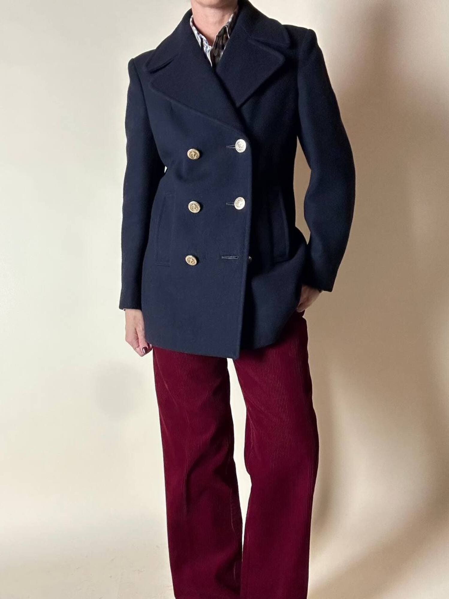 Questo peacoat Gloverall in lana blu notte rappresenta l’essenza del classico capospalla navy reinterpretato con la cura sartoriale e la qualità distintiva del Made in England. Realizzato in pregiata lana inglese, offre calore, struttura e un’eleganza sobria che attraversa le epoche senza perdere stile e carattere. Il taglio classico con ampi rever richiama l’eredità marinaresca del modello, mentre le tasche verticali enfatizzano il design pulito e funzionale. I bottoni dorati, impreziositi da firma Gloverall e ancora centrale, aggiungono una nota luminosa e iconica che definisce immediatamente lo stile del capo. Completamente foderato in tinta garantisce comfort e una vestibilità impeccabile. Un must-have senza tempo: essenziale, raffinato, autentico. Il peacoat che non può mancare nel guardaroba di chi ama la tradizione sartoriale con un tocco distintivo.