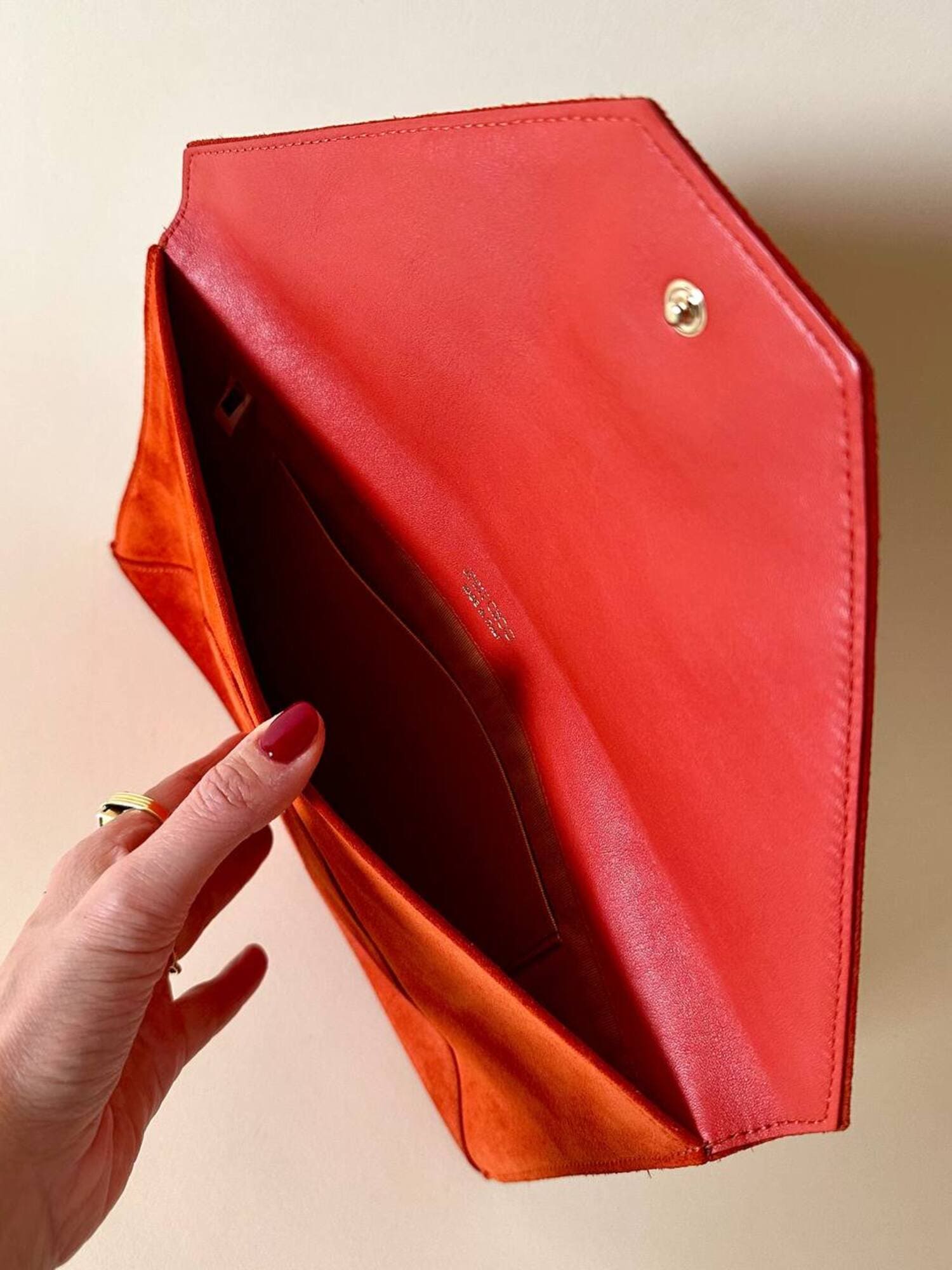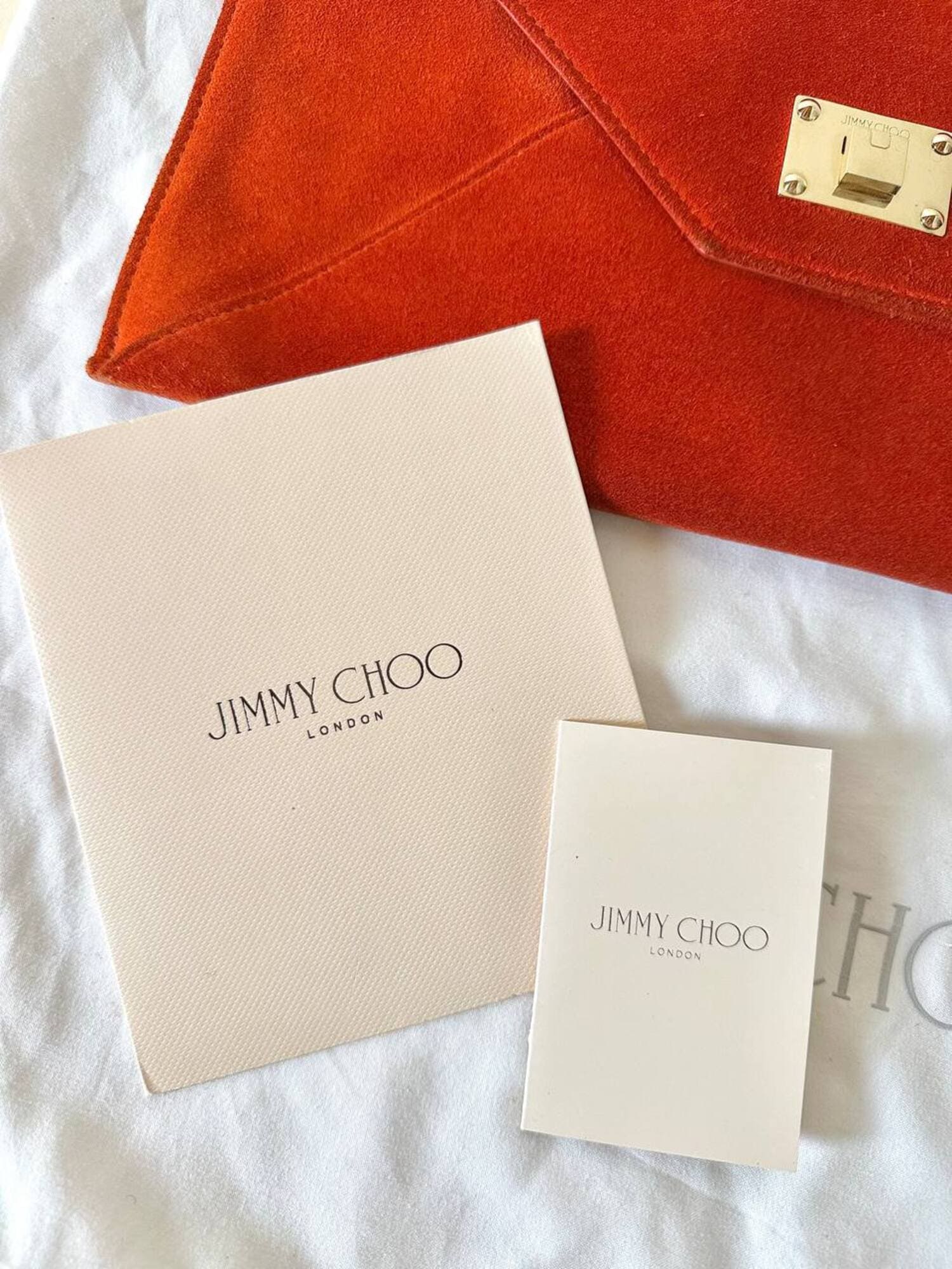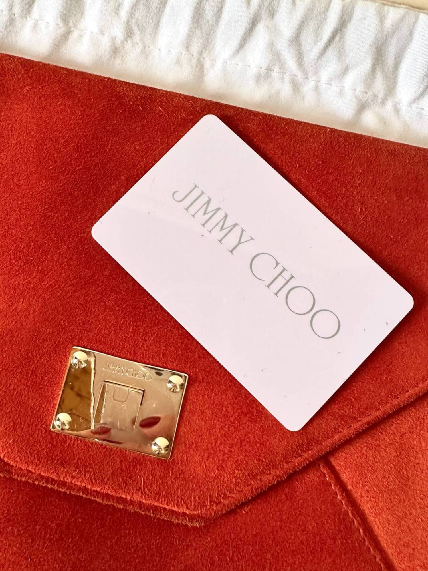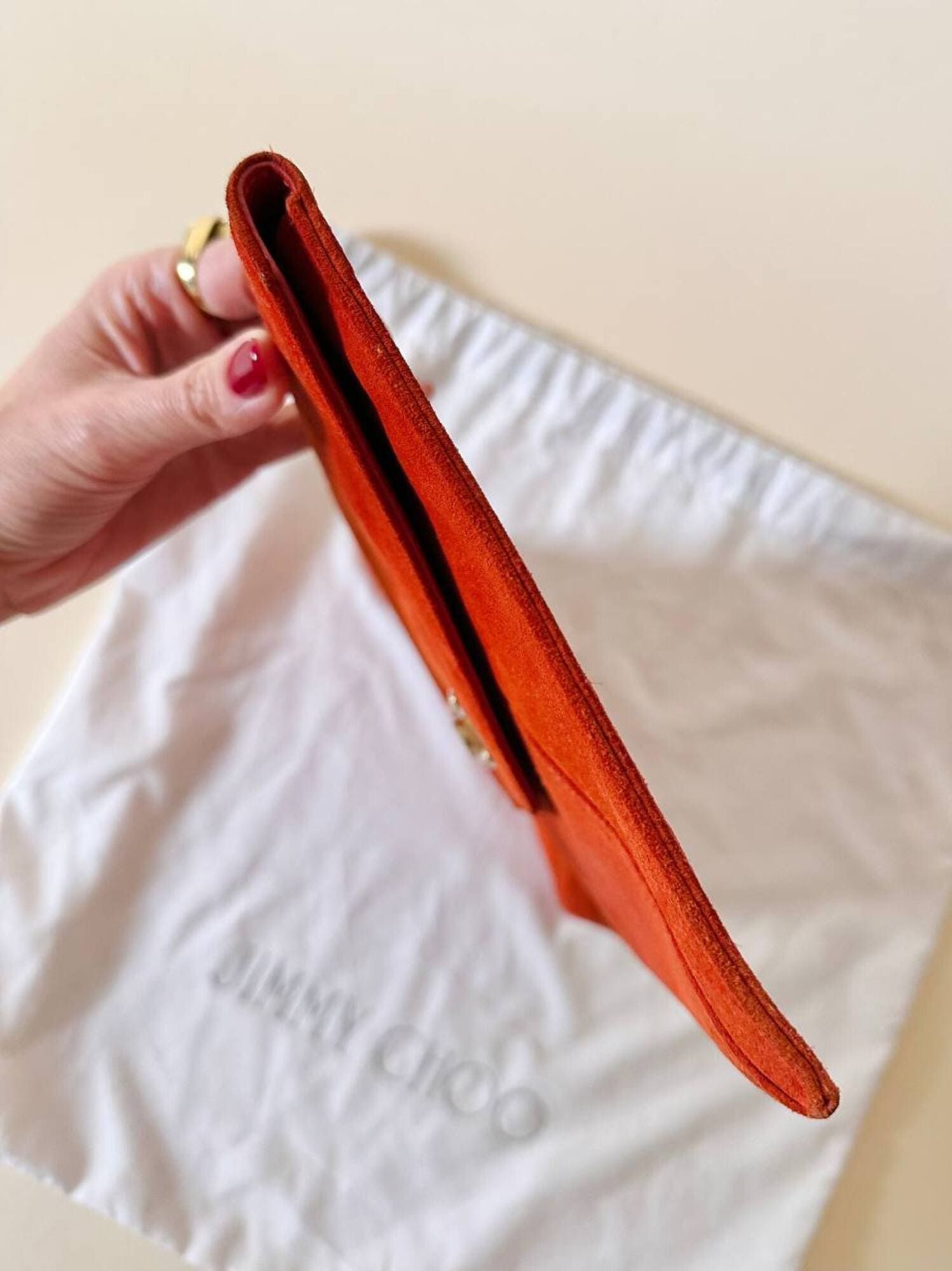 Questa pochette Jimmy Choo è realizzata in camoscio color aragosta, una tonalità intensa e luminosa che dona carattere immediato al modello. Il design piatto da portare a mano è impreziosito sulla patta da una placca metallica dorata dalle linee geometriche, con firma incisa, elemento distintivo della Maison. La chiusura è affidata a un bottone a pressione nascosto, per una silhouette pulita ed essenziale. L’interno della patta è rifinito in pelle liscia tono su tono con firma a caldo in foil oro. Il design è completato con una raffinata fodera in gros grain color salmone che accoglie un pratico taschino laterale. Completa di dustbag, certificato e scontrino d’acquisto originale (gennaio 2015, boutique monomarca di Roma), è un accessorio esclusivo, perfetto per eventi serali e occasioni speciali.