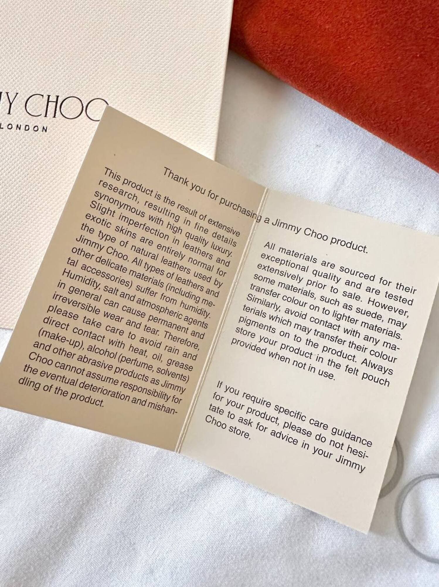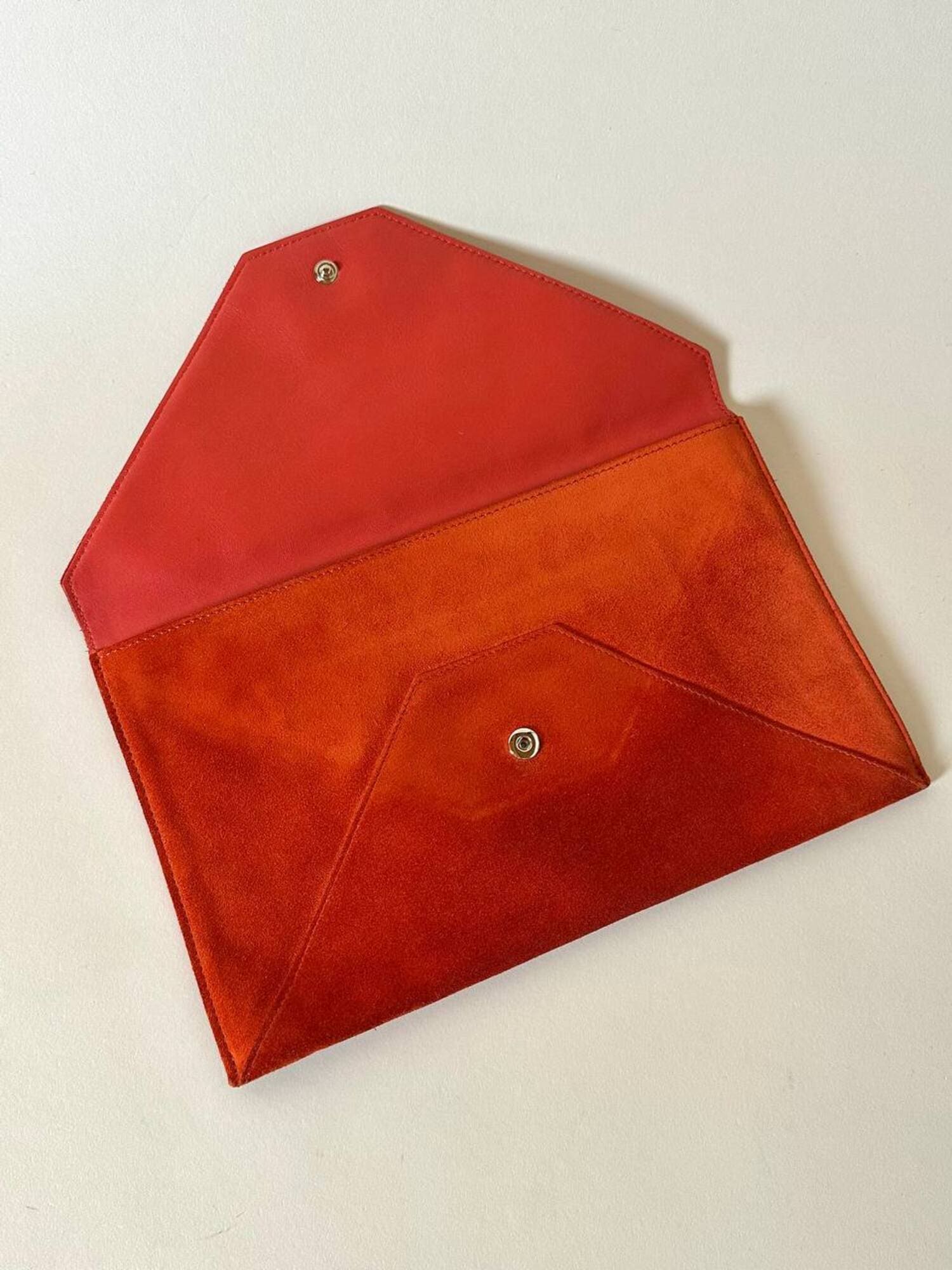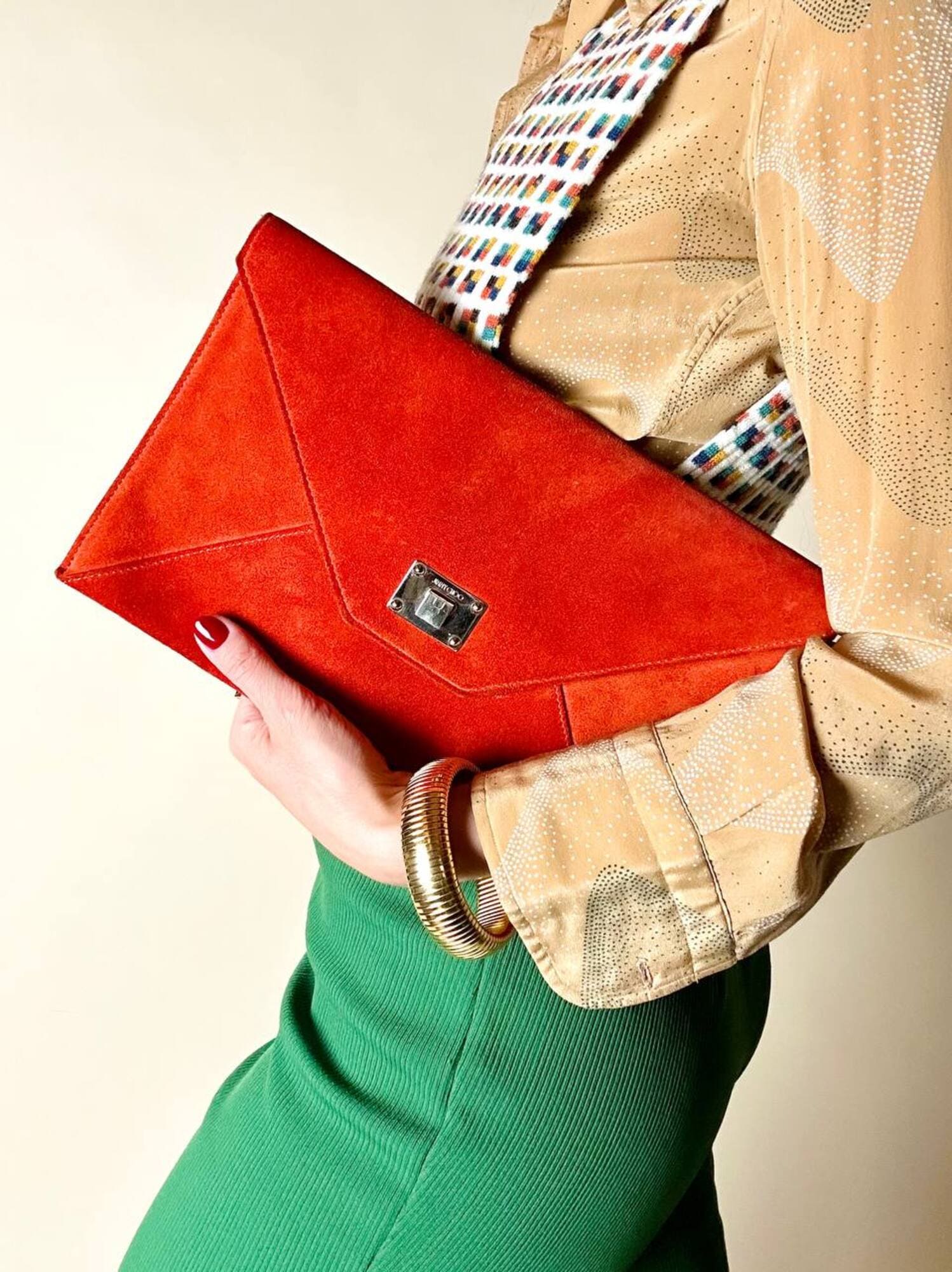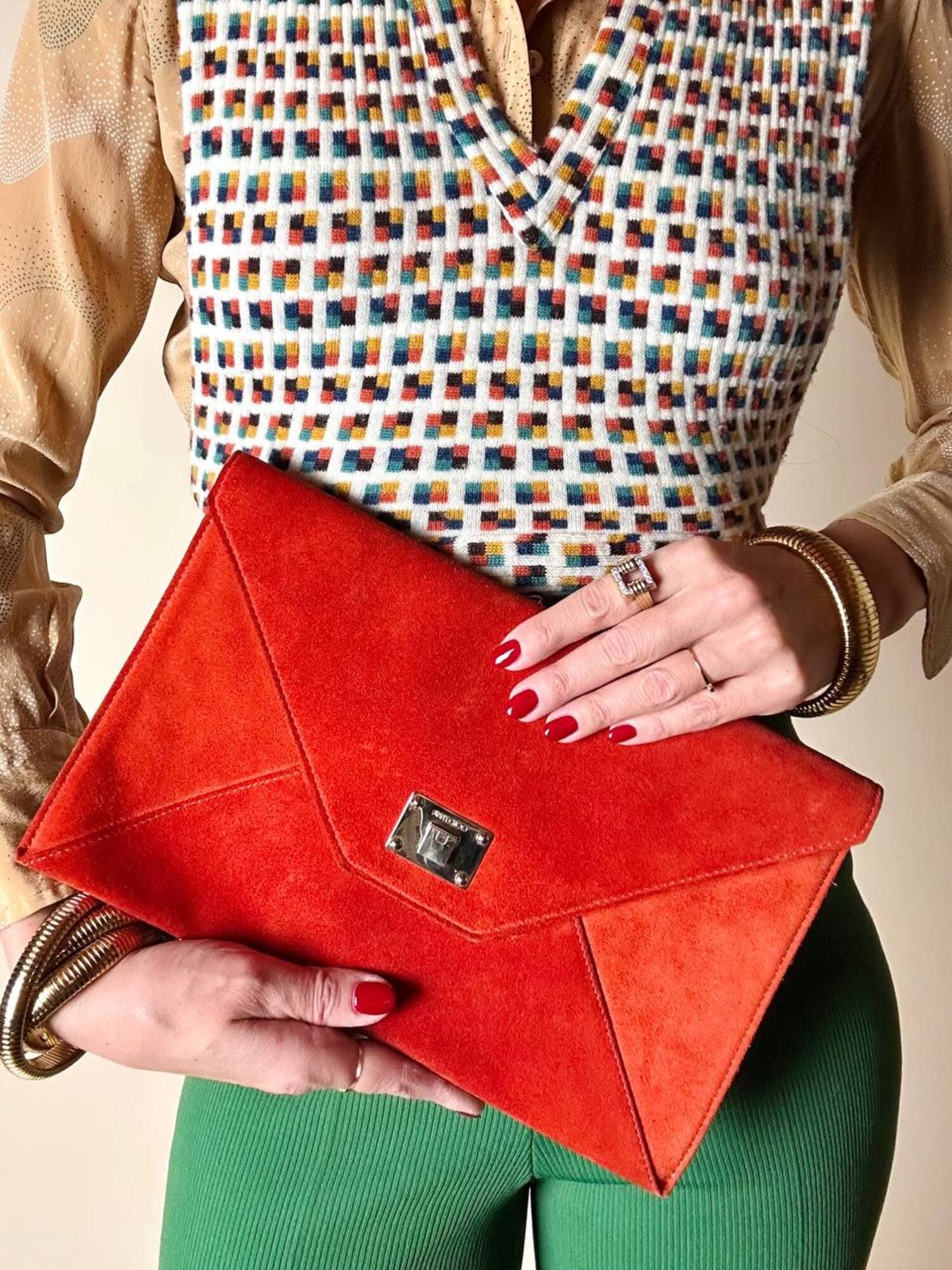 Questa pochette Jimmy Choo è realizzata in camoscio color aragosta, una tonalità intensa e luminosa che dona carattere immediato al modello. Il design piatto da portare a mano è impreziosito sulla patta da una placca metallica dorata dalle linee geometriche, con firma incisa, elemento distintivo della Maison. La chiusura è affidata a un bottone a pressione nascosto, per una silhouette pulita ed essenziale. L’interno della patta è rifinito in pelle liscia tono su tono con firma a caldo in foil oro. Il design è completato con una raffinata fodera in gros grain color salmone che accoglie un pratico taschino laterale. Completa di dustbag, certificato e scontrino d’acquisto originale (gennaio 2015, boutique monomarca di Roma), è un accessorio esclusivo, perfetto per eventi serali e occasioni speciali.