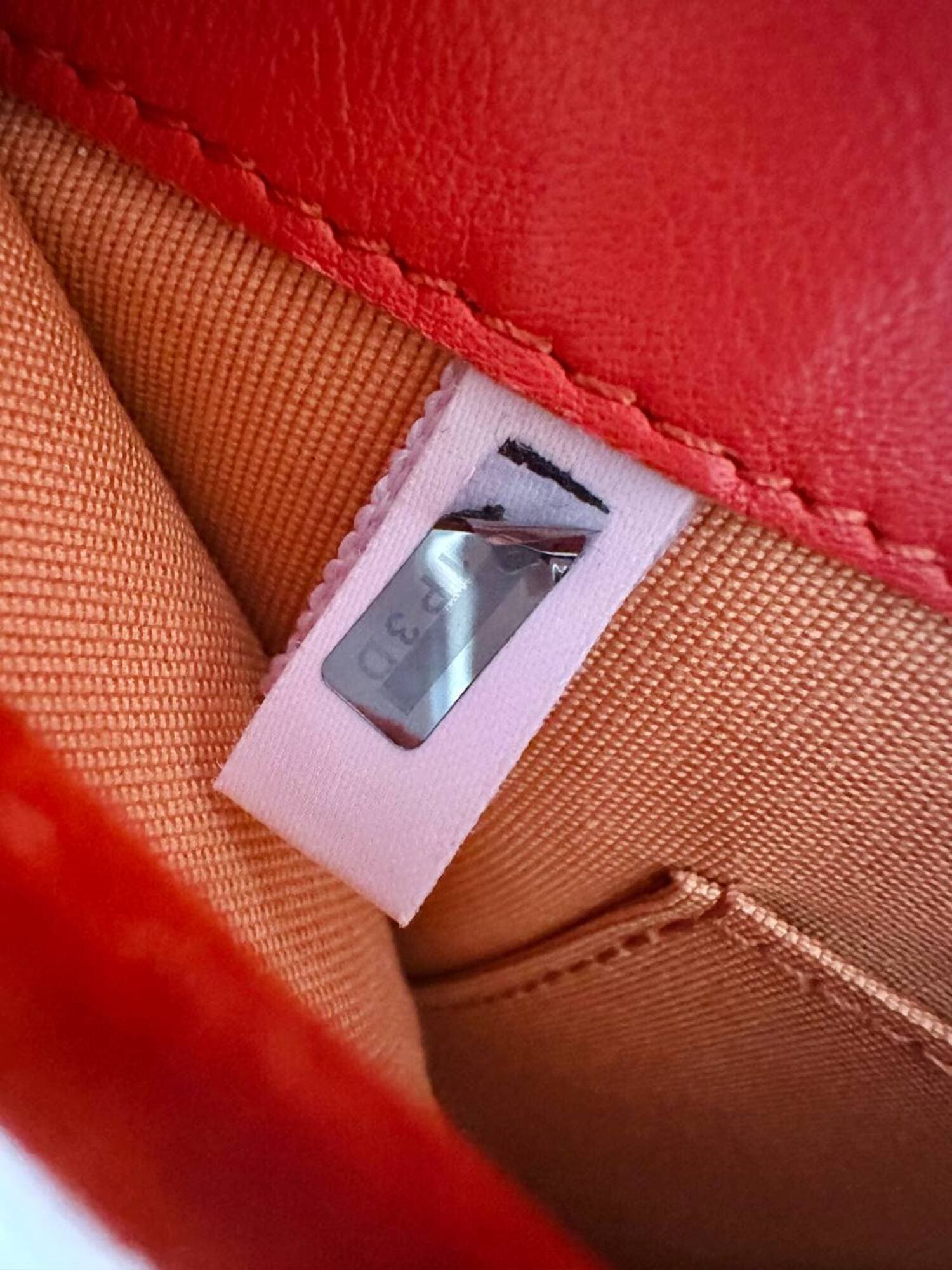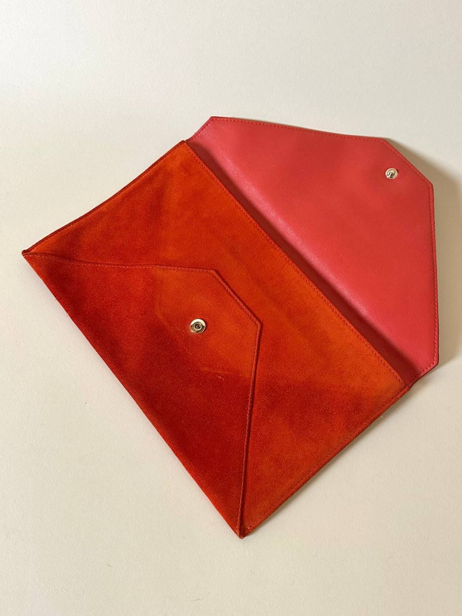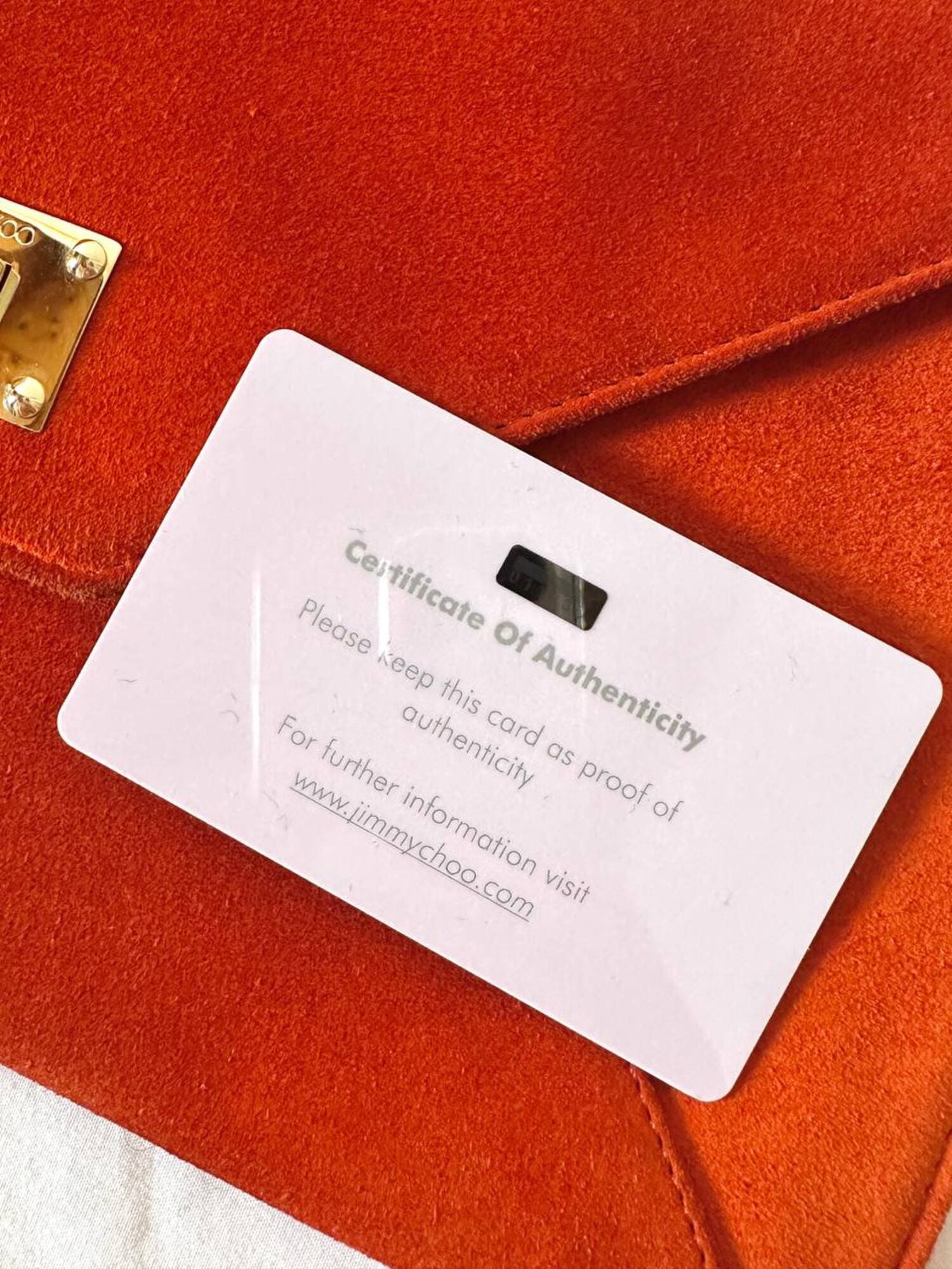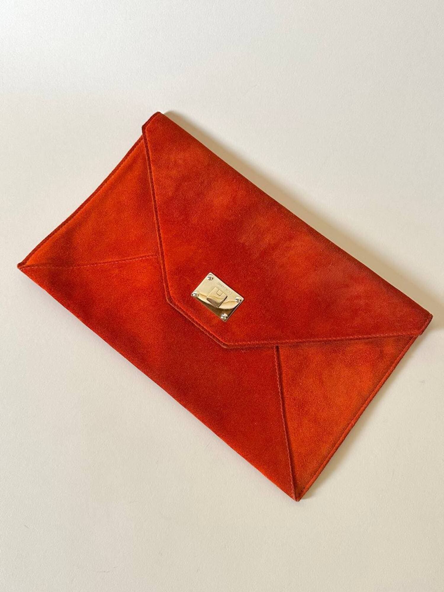 Questa pochette Jimmy Choo è realizzata in camoscio color aragosta, una tonalità intensa e luminosa che dona carattere immediato al modello. Il design piatto da portare a mano è impreziosito sulla patta da una placca metallica dorata dalle linee geometriche, con firma incisa, elemento distintivo della Maison. La chiusura è affidata a un bottone a pressione nascosto, per una silhouette pulita ed essenziale. L’interno della patta è rifinito in pelle liscia tono su tono con firma a caldo in foil oro. Il design è completato con una raffinata fodera in gros grain color salmone che accoglie un pratico taschino laterale. Completa di dustbag, certificato e scontrino d’acquisto originale (gennaio 2015, boutique monomarca di Roma), è un accessorio esclusivo, perfetto per eventi serali e occasioni speciali.