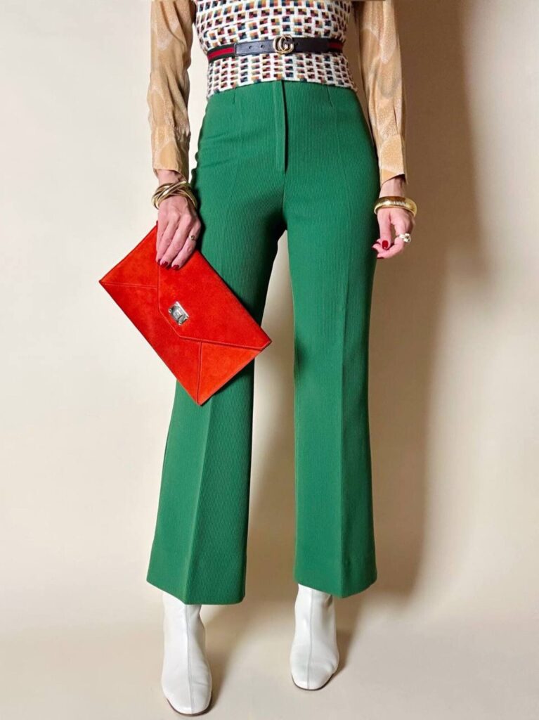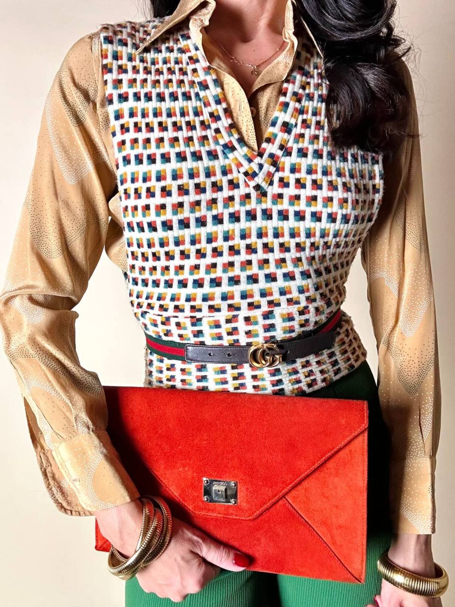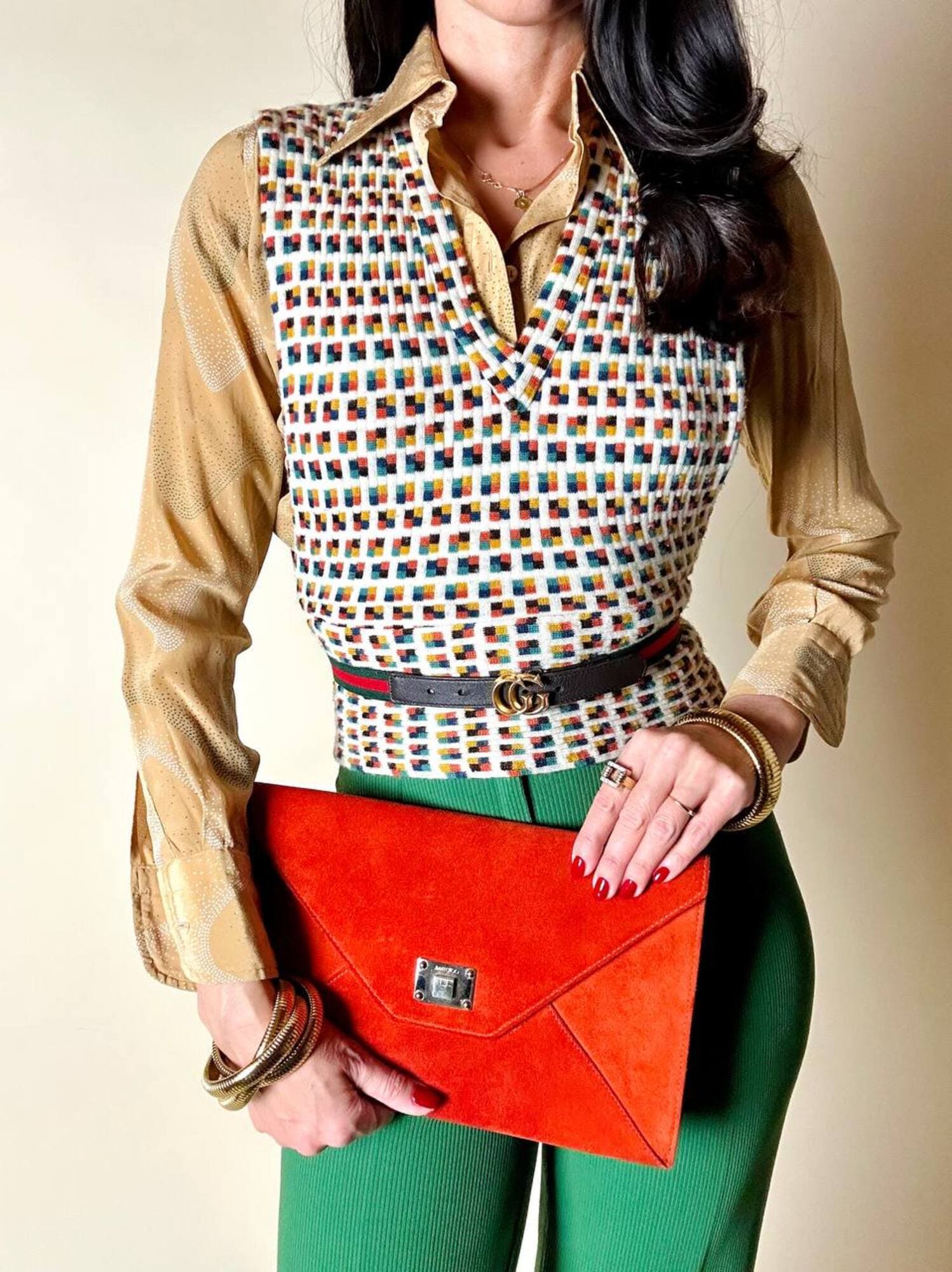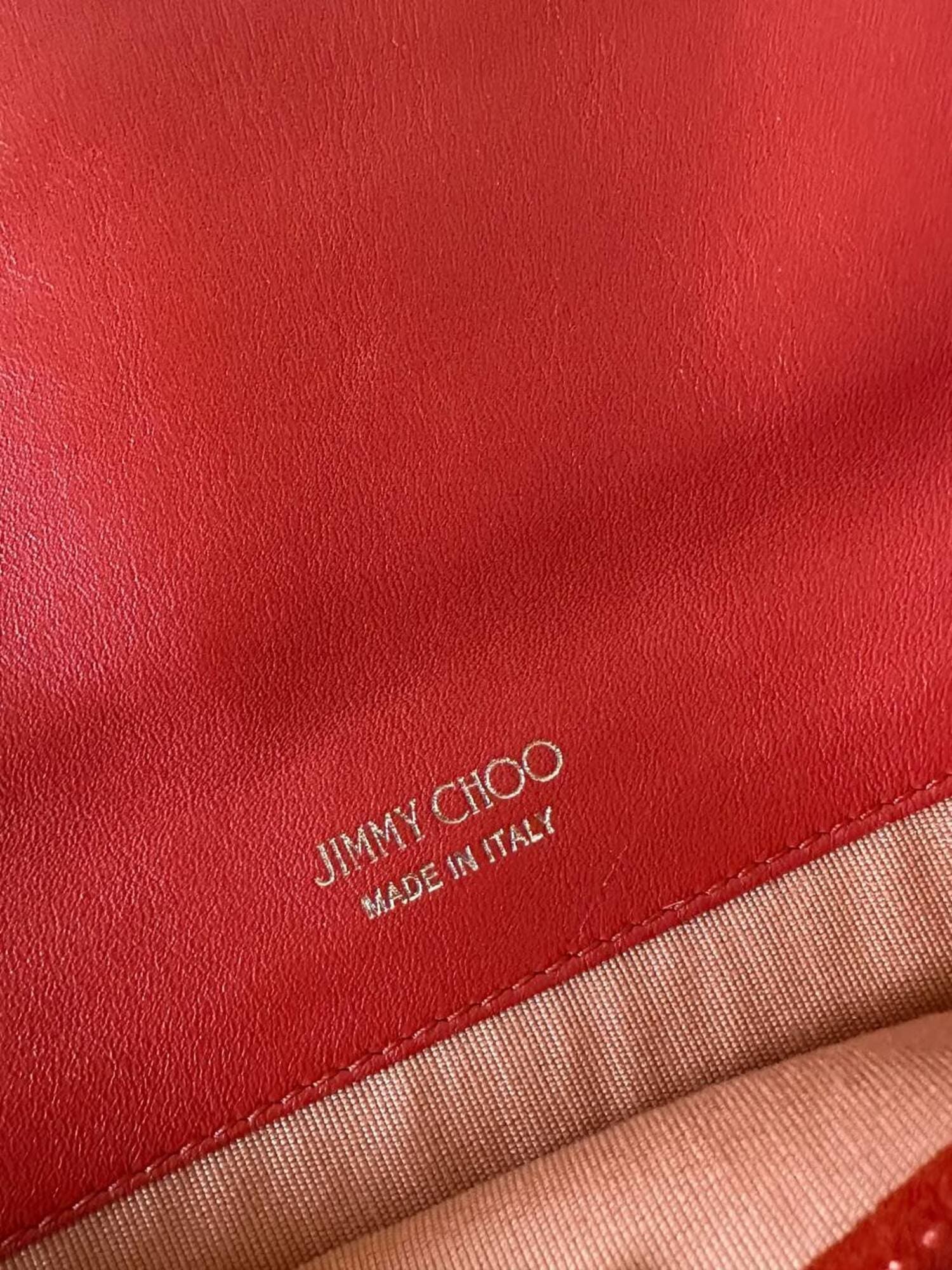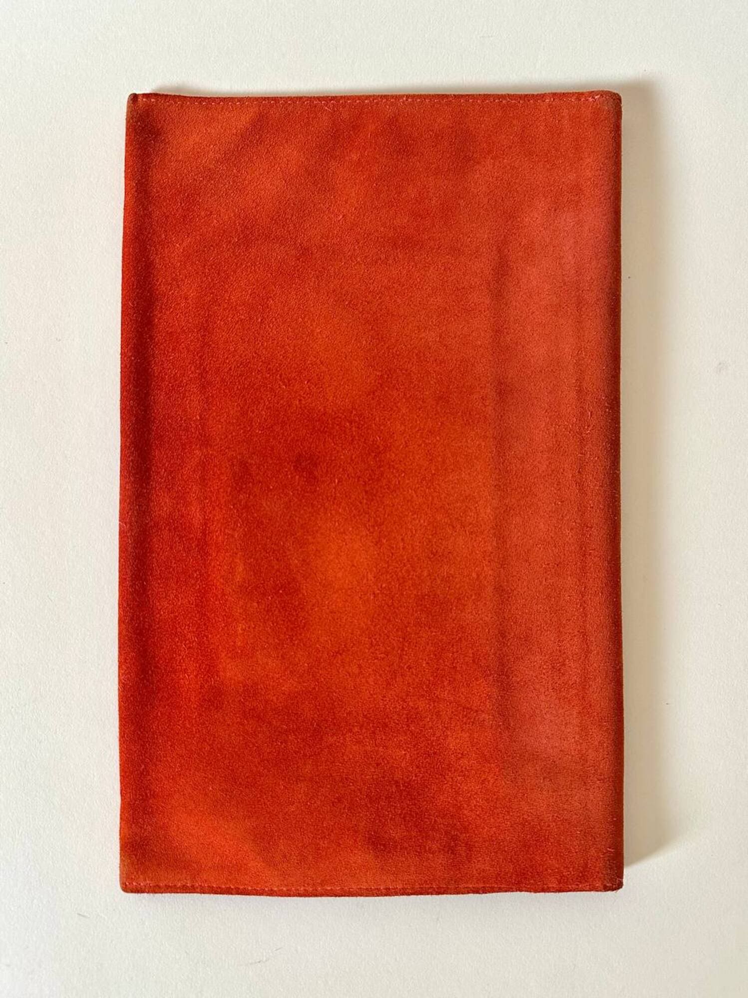 Questa pochette Jimmy Choo è realizzata in camoscio color aragosta, una tonalità intensa e luminosa che dona carattere immediato al modello. Il design piatto da portare a mano è impreziosito sulla patta da una placca metallica dorata dalle linee geometriche, con firma incisa, elemento distintivo della Maison. La chiusura è affidata a un bottone a pressione nascosto, per una silhouette pulita ed essenziale. L’interno della patta è rifinito in pelle liscia tono su tono con firma a caldo in foil oro. Il design è completato con una raffinata fodera in gros grain color salmone che accoglie un pratico taschino laterale. Completa di dustbag, certificato e scontrino d’acquisto originale (gennaio 2015, boutique monomarca di Roma), è un accessorio esclusivo, perfetto per eventi serali e occasioni speciali.