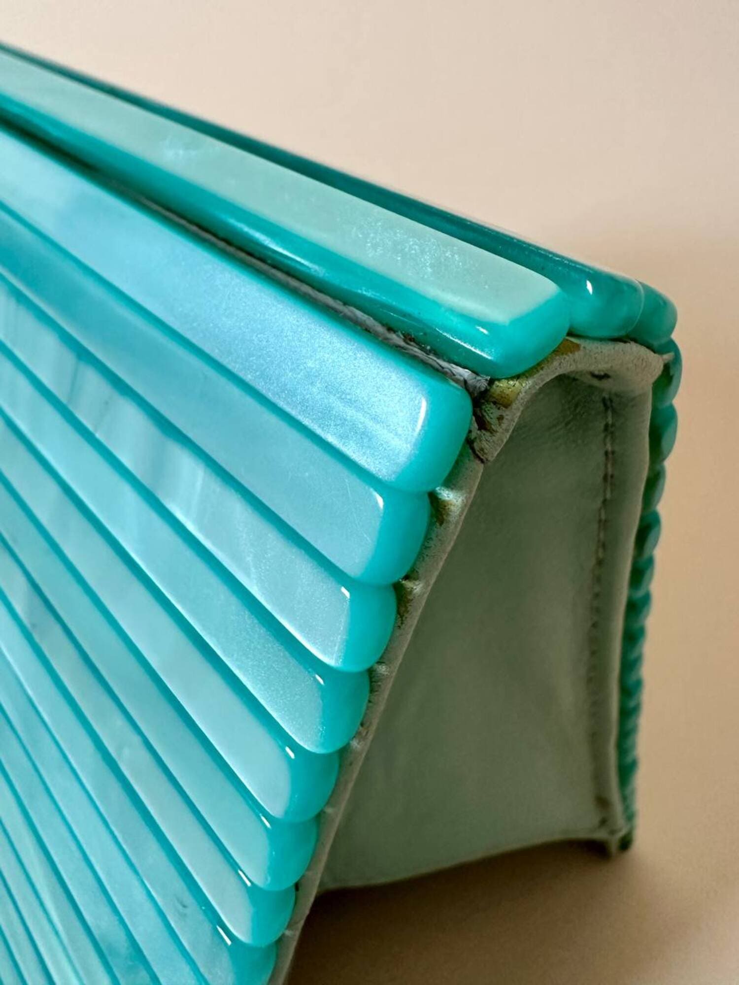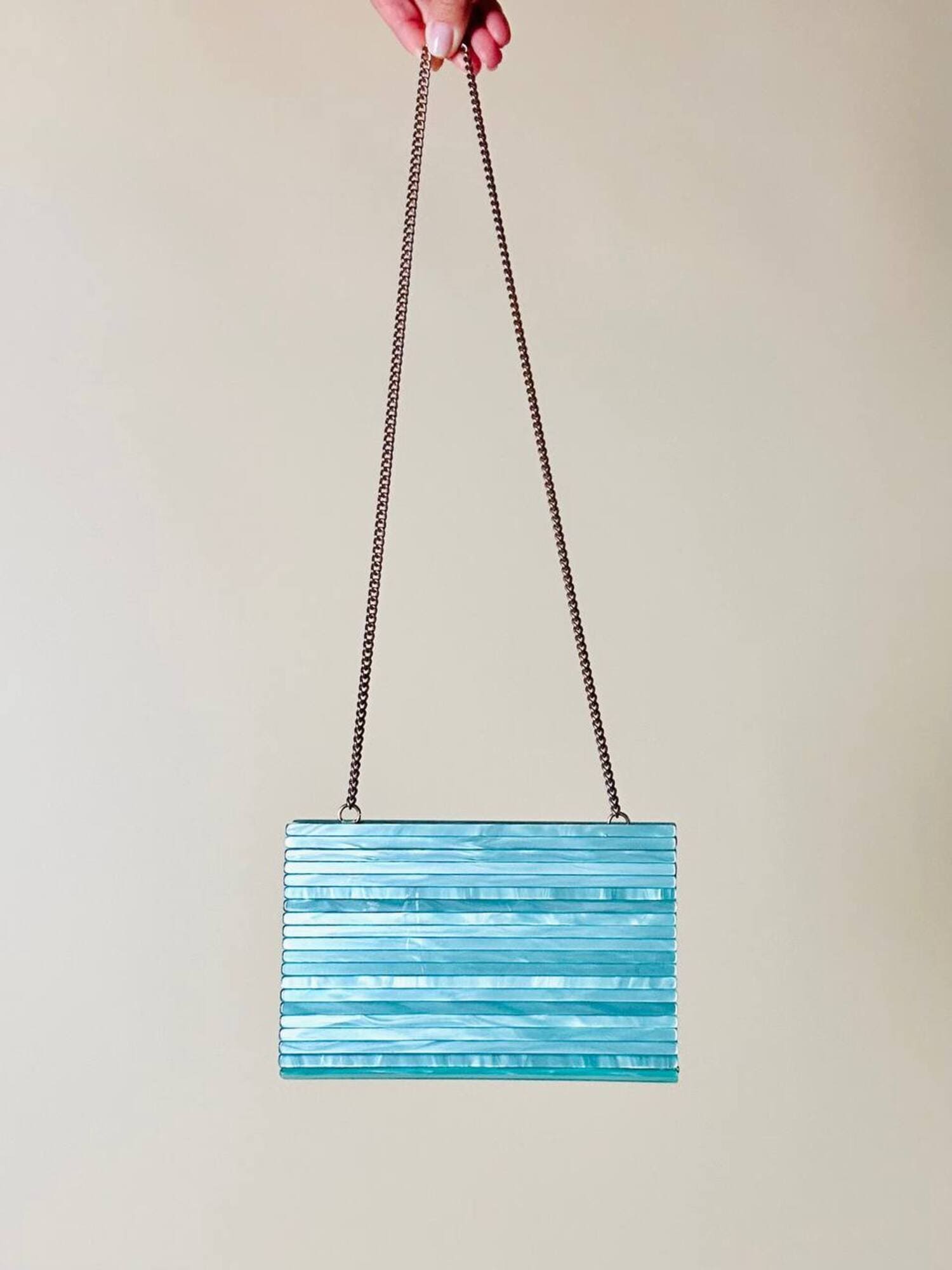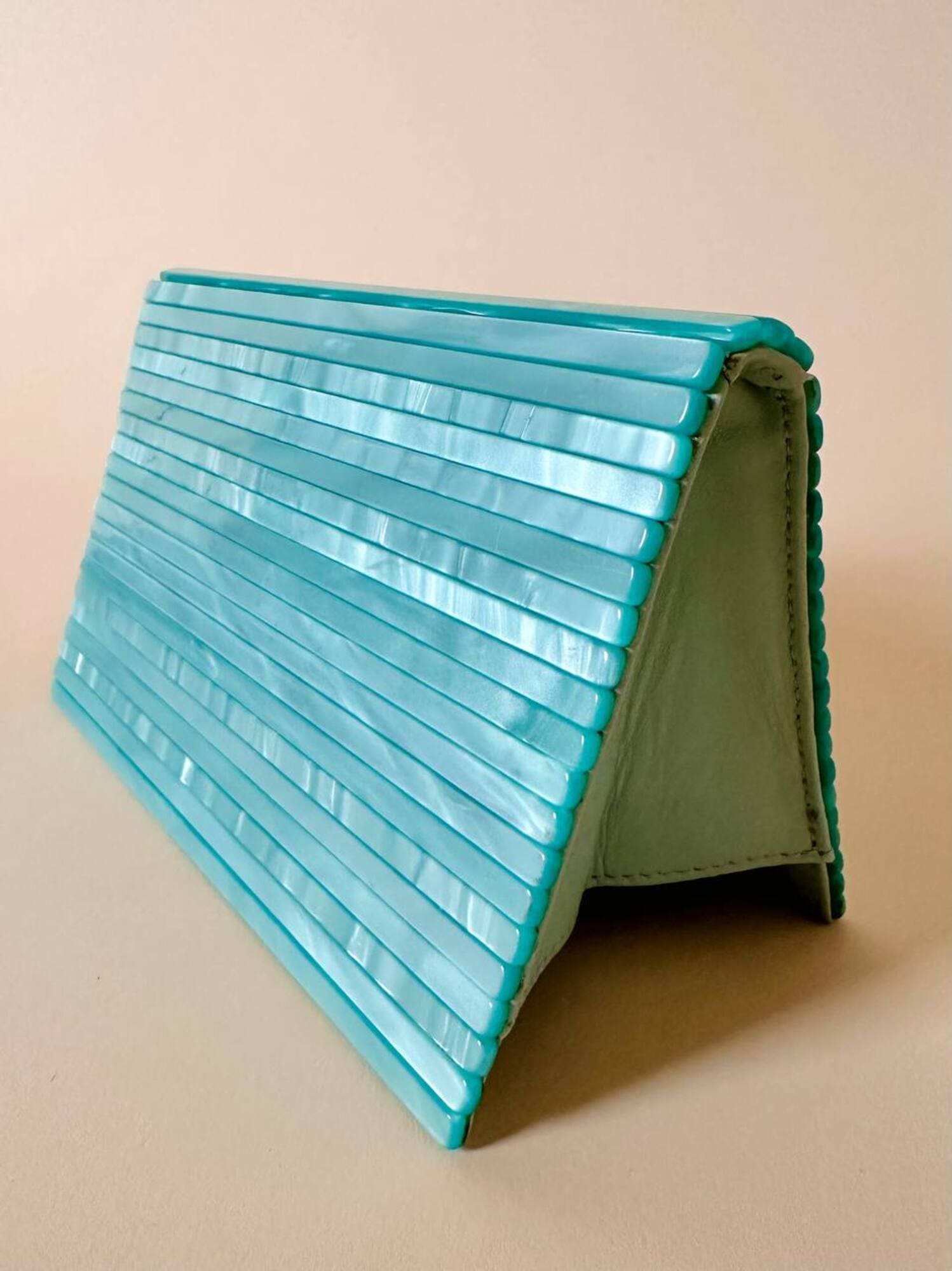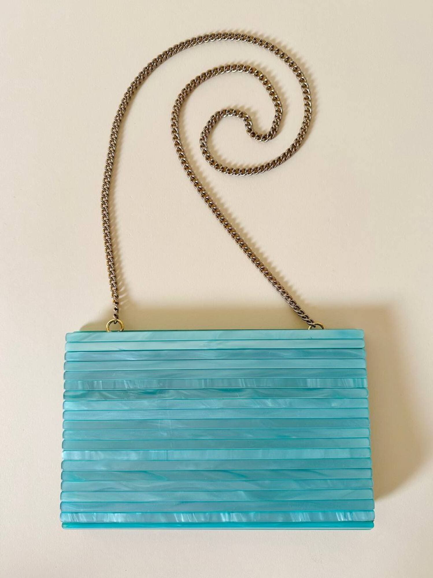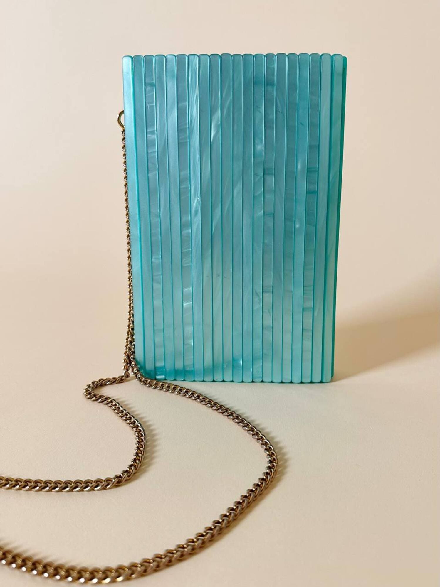 Dal design scultoreo e sofisticato, questa pochette in lucite color acquamarina è realizzata con un’elegante lavorazione a listelli rigidi, che crea giochi di luce e riflessi unici. Dotata di una pratica tracolla in catena metallica e di una discreta chiusura con bottoni automatici, è foderata internamente in pelle tono su tono. Versatile e chic, può essere portata a mano o a spalla. Un accessorio statement, perfetto per completare outfit da cerimonia, cocktail o eventi speciali.