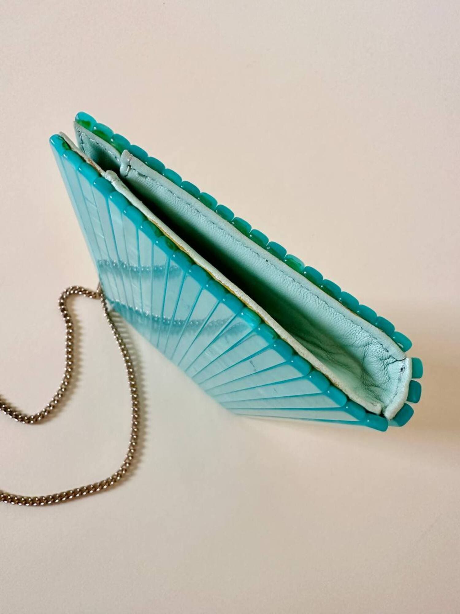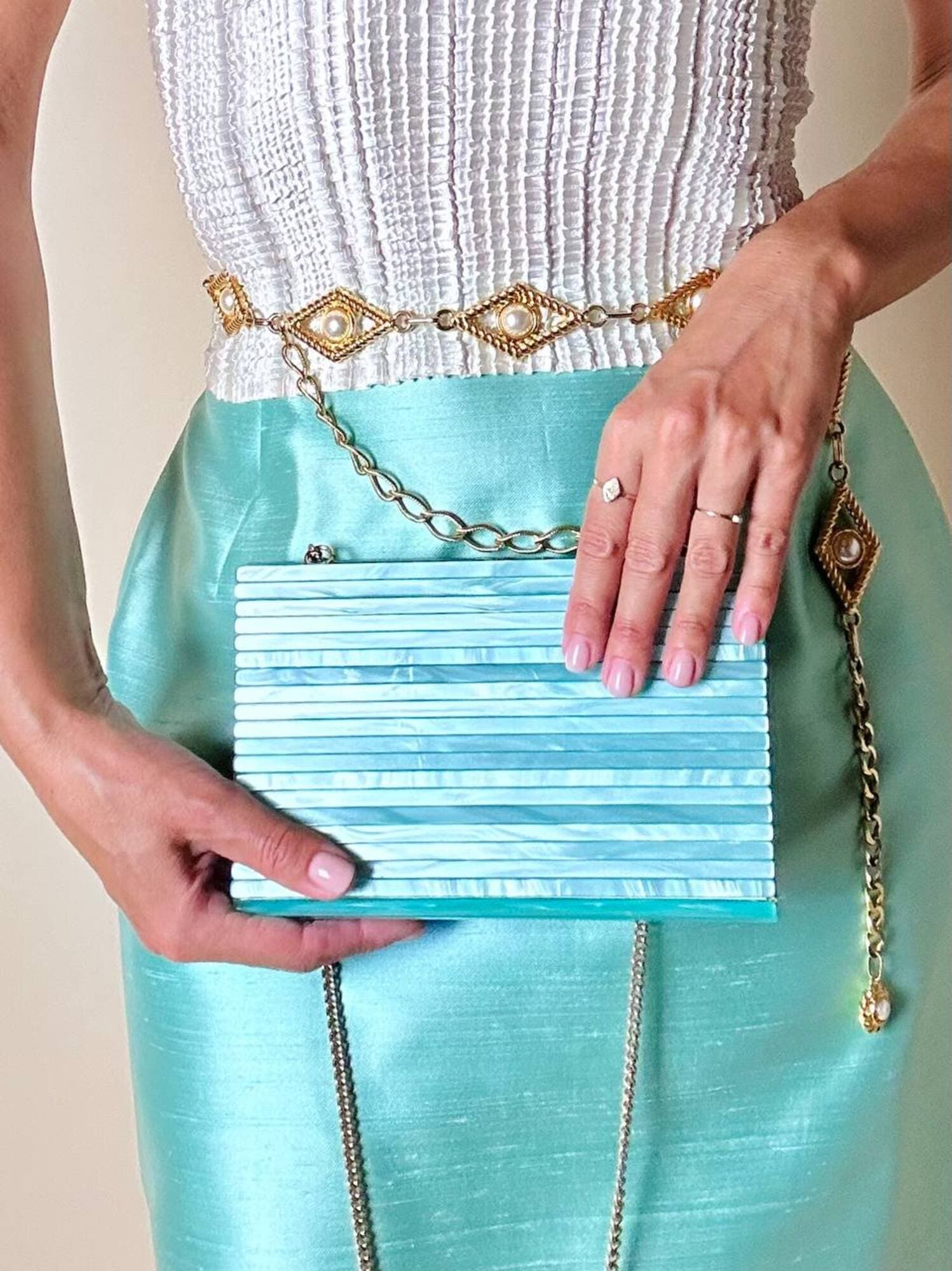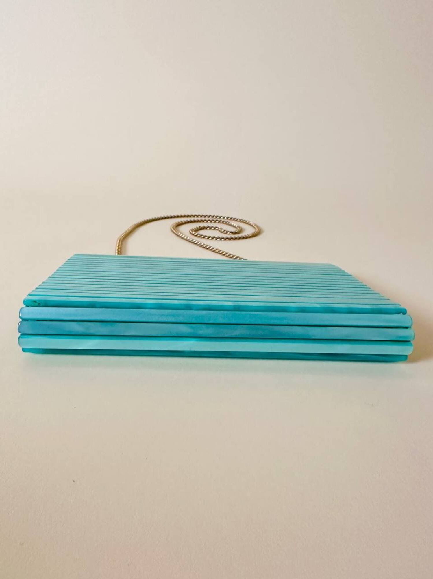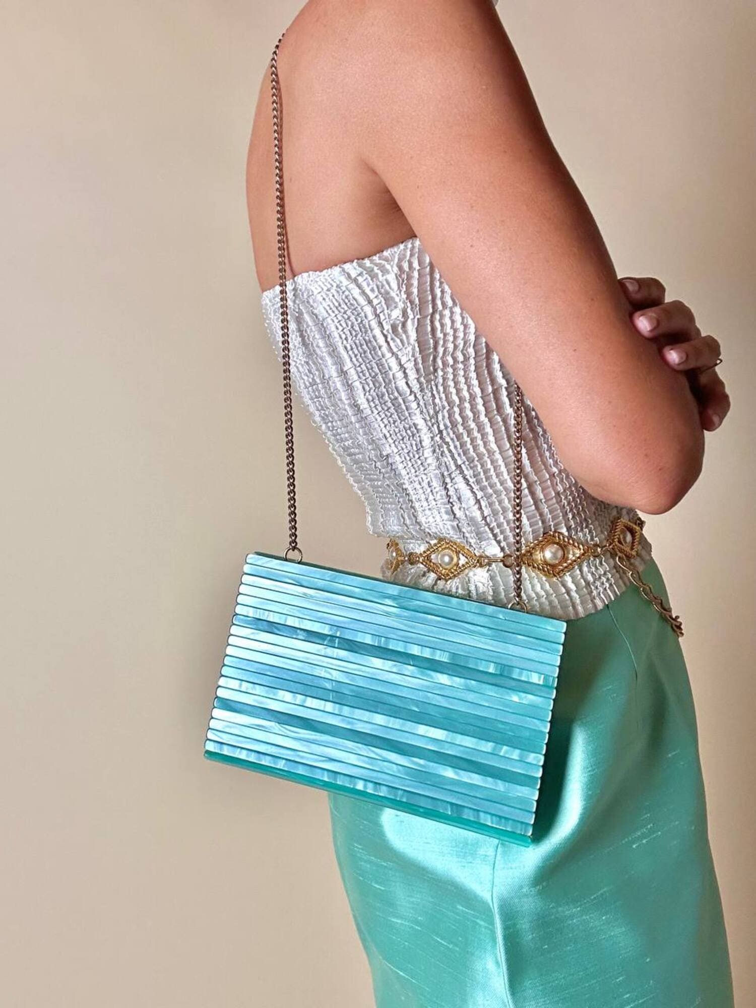 Dal design scultoreo e sofisticato, questa pochette in lucite color acquamarina è realizzata con un’elegante lavorazione a listelli rigidi, che crea giochi di luce e riflessi unici. Dotata di una pratica tracolla in catena metallica e di una discreta chiusura con bottoni automatici, è foderata internamente in pelle tono su tono. Versatile e chic, può essere portata a mano o a spalla. Un accessorio statement, perfetto per completare outfit da cerimonia, cocktail o eventi speciali.