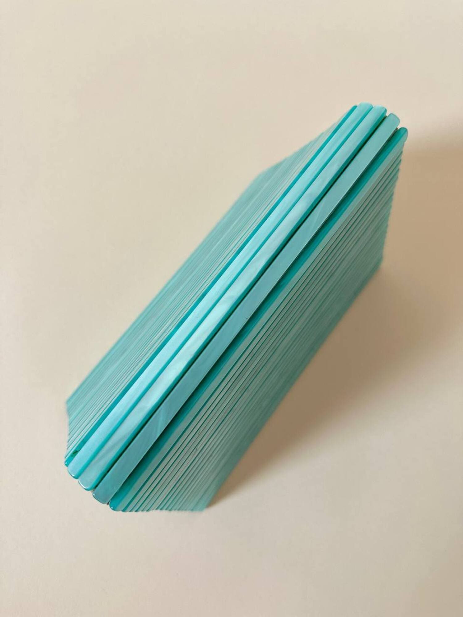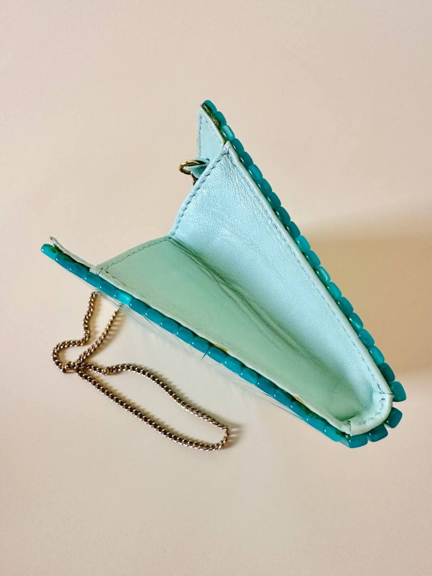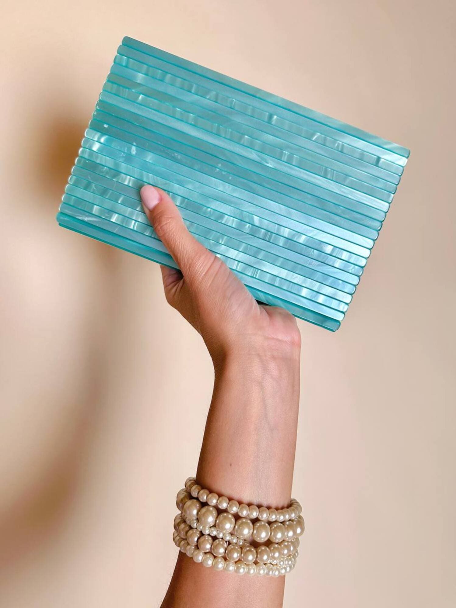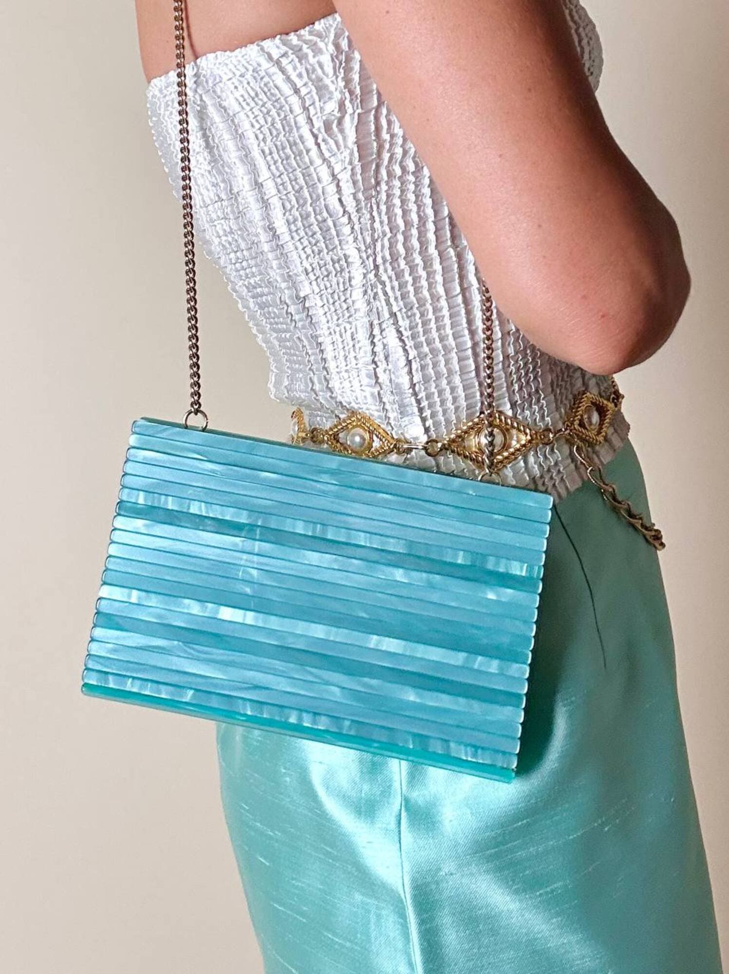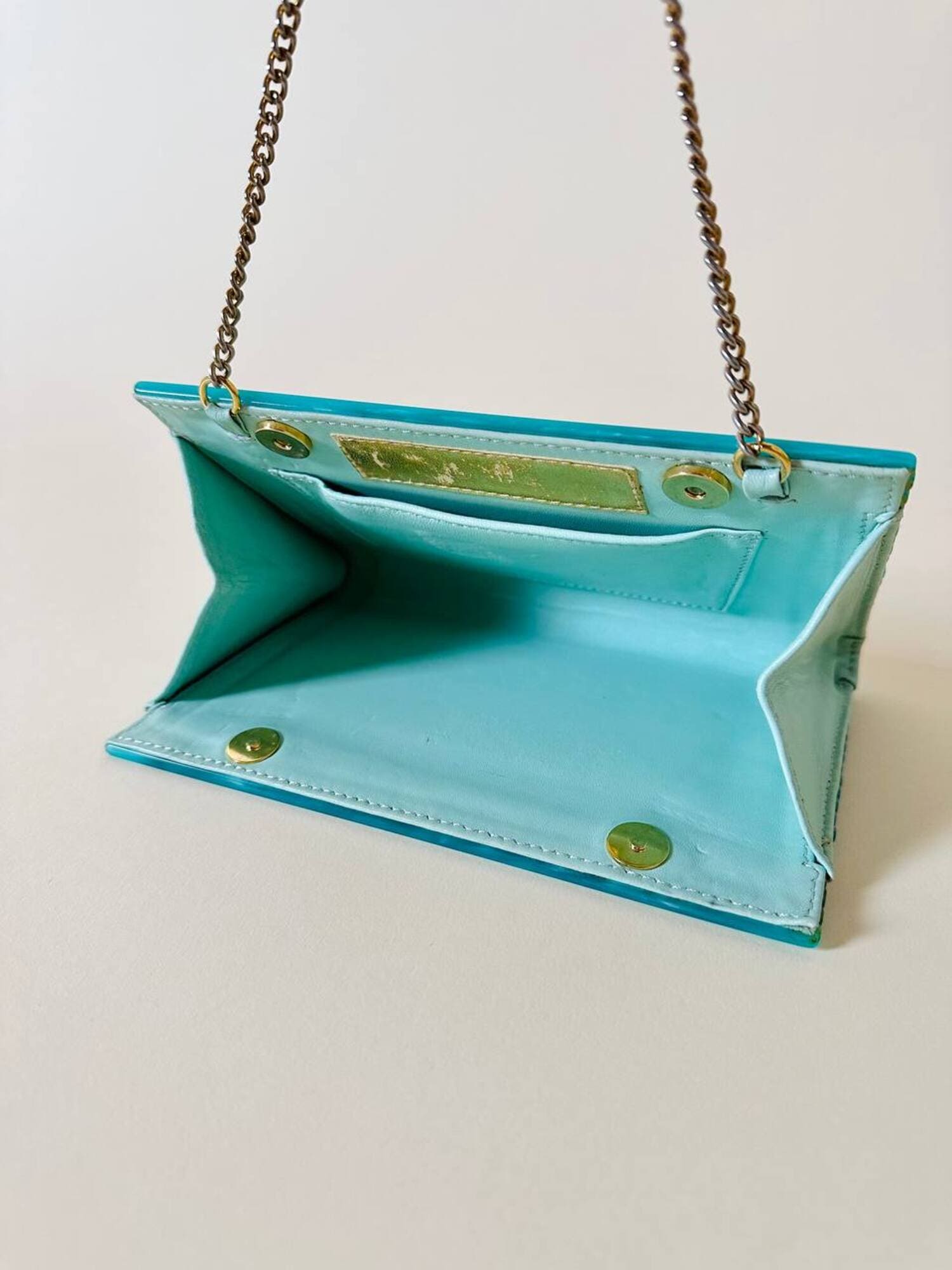 Dal design scultoreo e sofisticato, questa pochette in lucite color acquamarina è realizzata con un’elegante lavorazione a listelli rigidi, che crea giochi di luce e riflessi unici. Dotata di una pratica tracolla in catena metallica e di una discreta chiusura con bottoni automatici, è foderata internamente in pelle tono su tono. Versatile e chic, può essere portata a mano o a spalla. Un accessorio statement, perfetto per completare outfit da cerimonia, cocktail o eventi speciali.