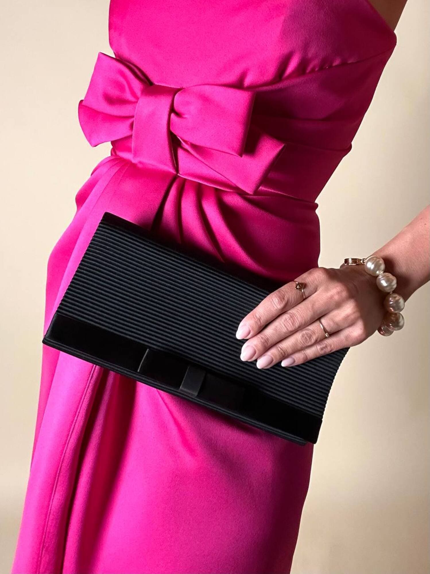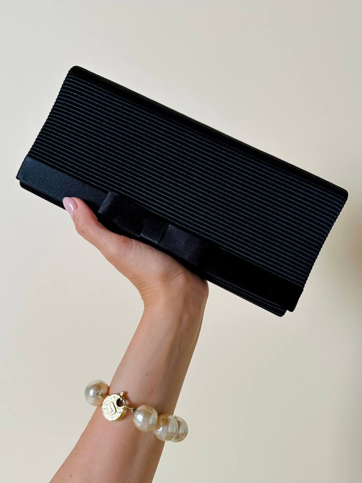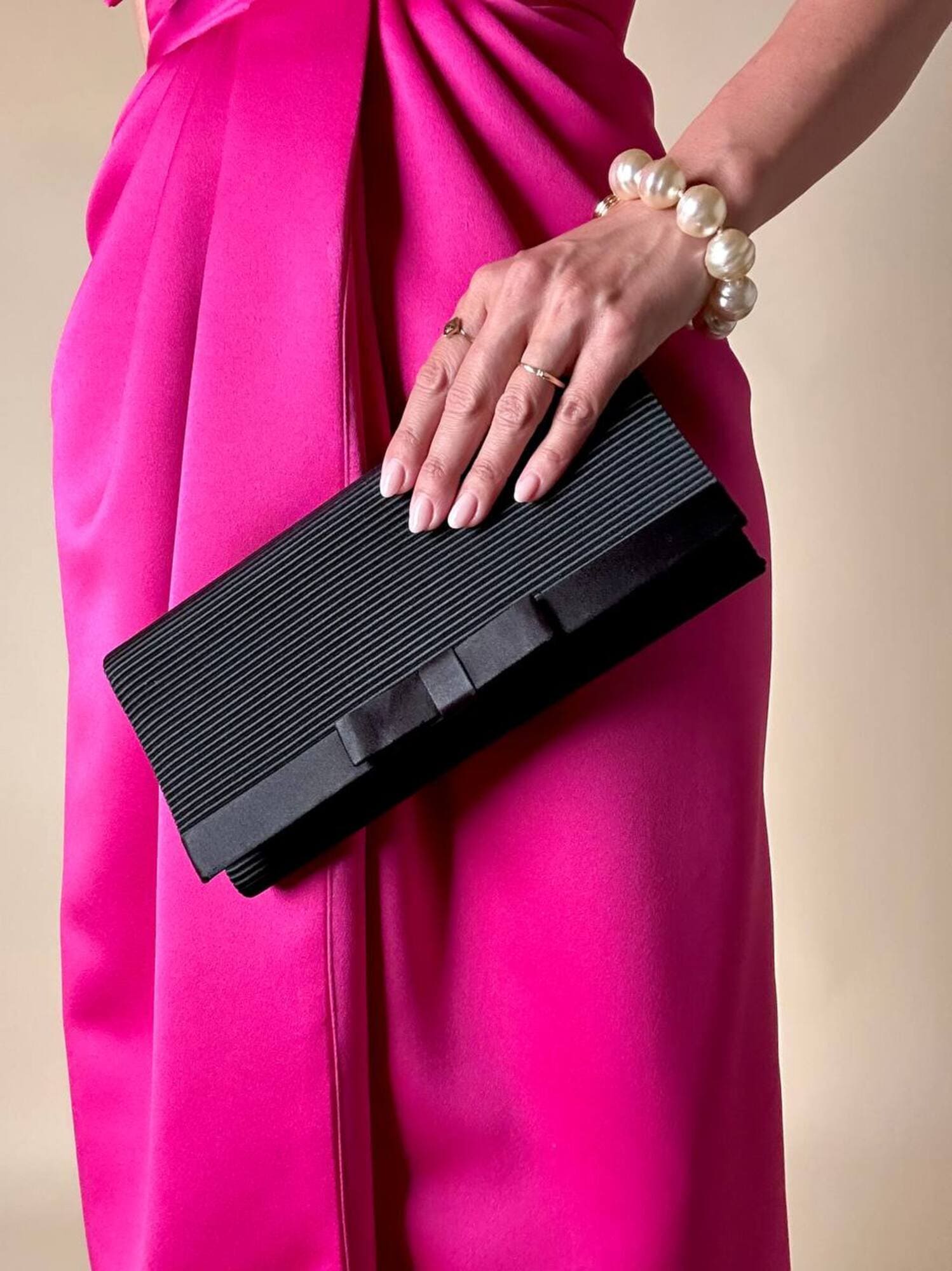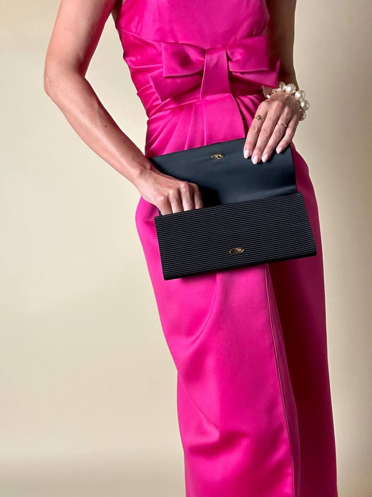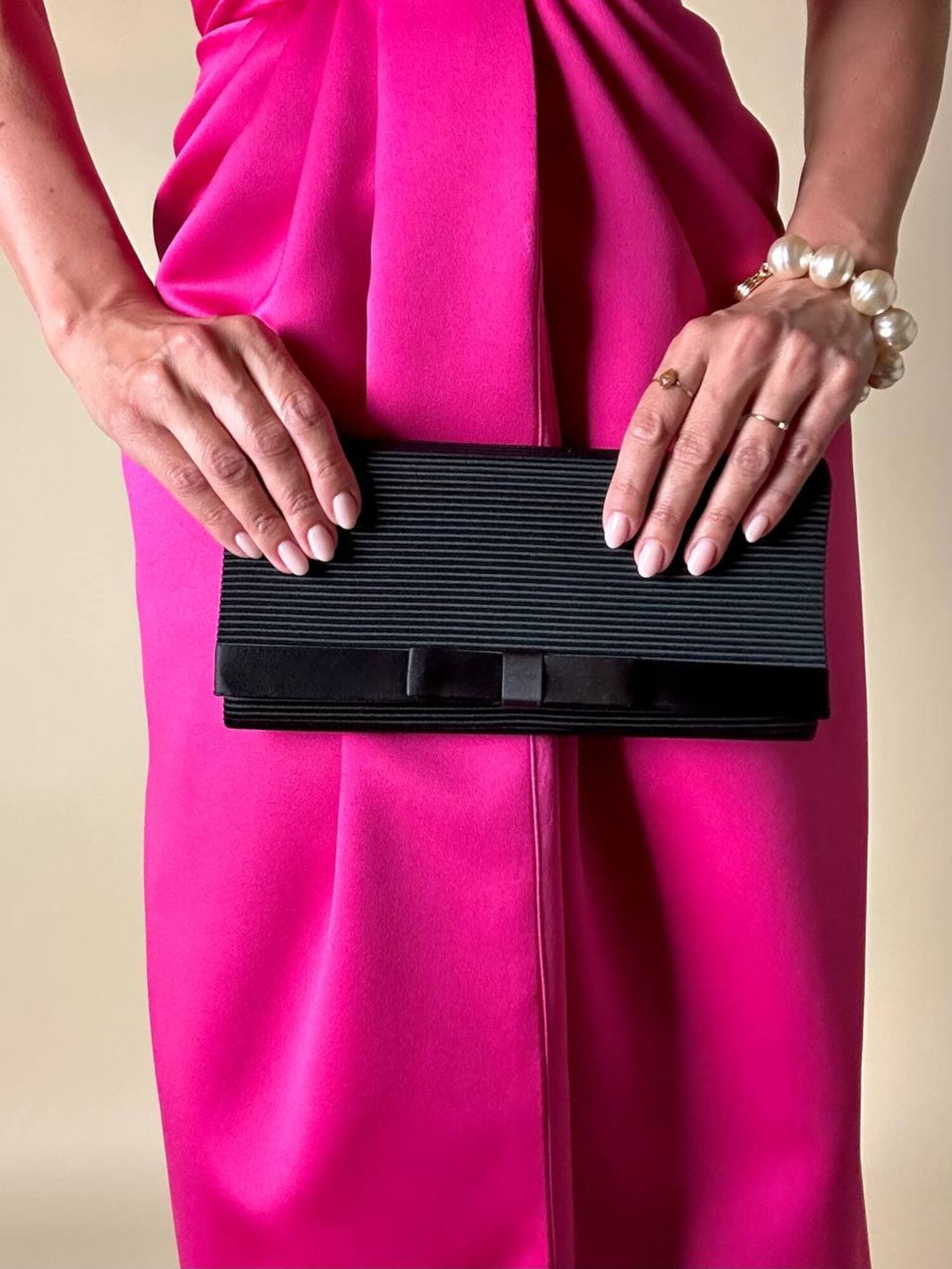 Elegante e senza tempo, questa pochette in tessuto canneté è un piccolo gioiello di stile pensato per accompagnare con grazia le occasioni più speciali. La patta frontale, sobria ma sofisticata, è impreziosita da un fiocco centrale in raso nero, che aggiunge un tocco di femminilità raffinata. Dalla linea compatta ma sorprendentemente capiente, è studiata per contenere tutto l’essenziale, dal rossetto al telefono. Si porta esclusivamente a mano, sottolineando il suo carattere formale e chic, perfetta con un abito da sera o a un tailleur ricercato.