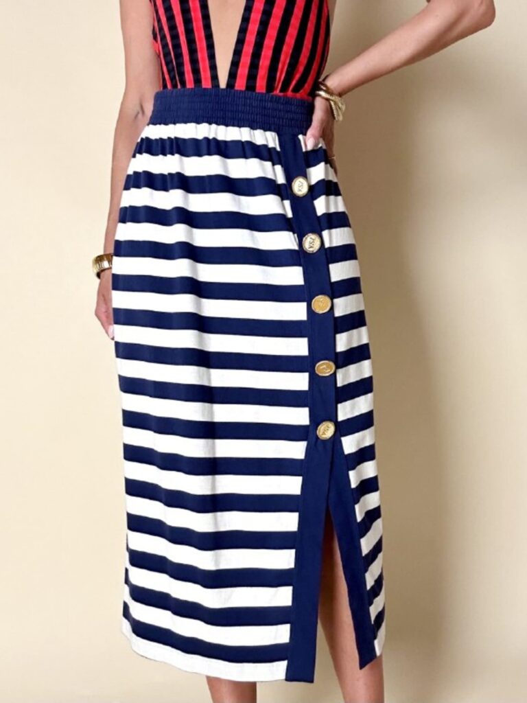 Polo a righe bianche e rosse, firmata “Yves Saint Laurent Variation”. Riporti blu navy, bottoni dorati in metallo, “YSL” ricamato in corsivo sul petto con filo blu.