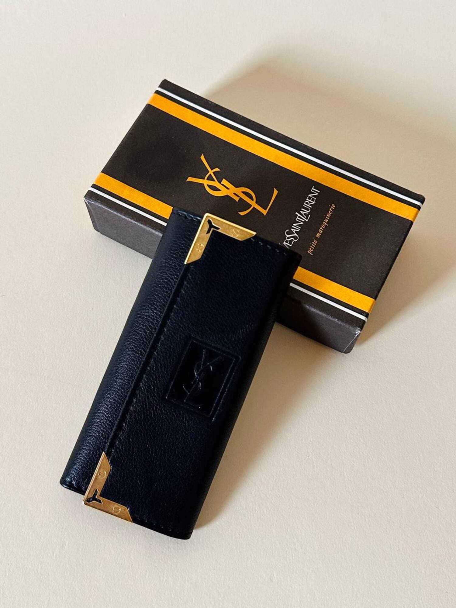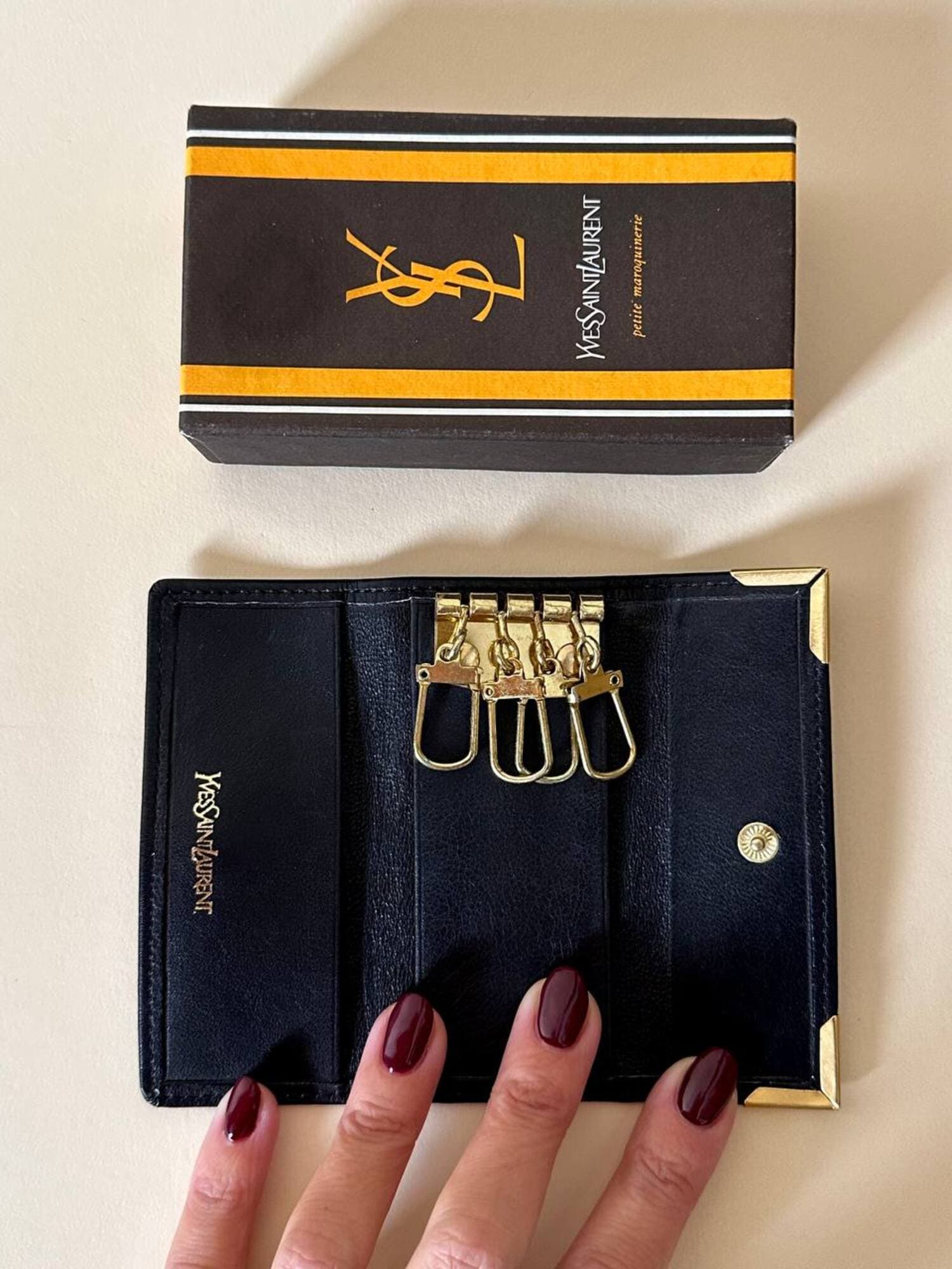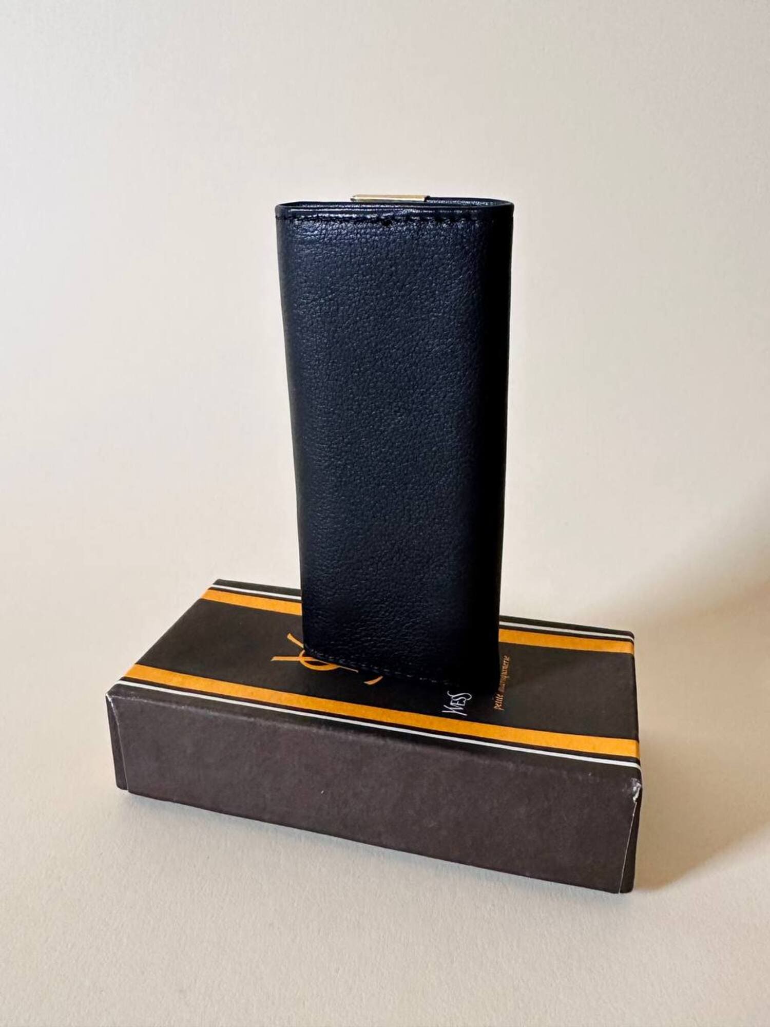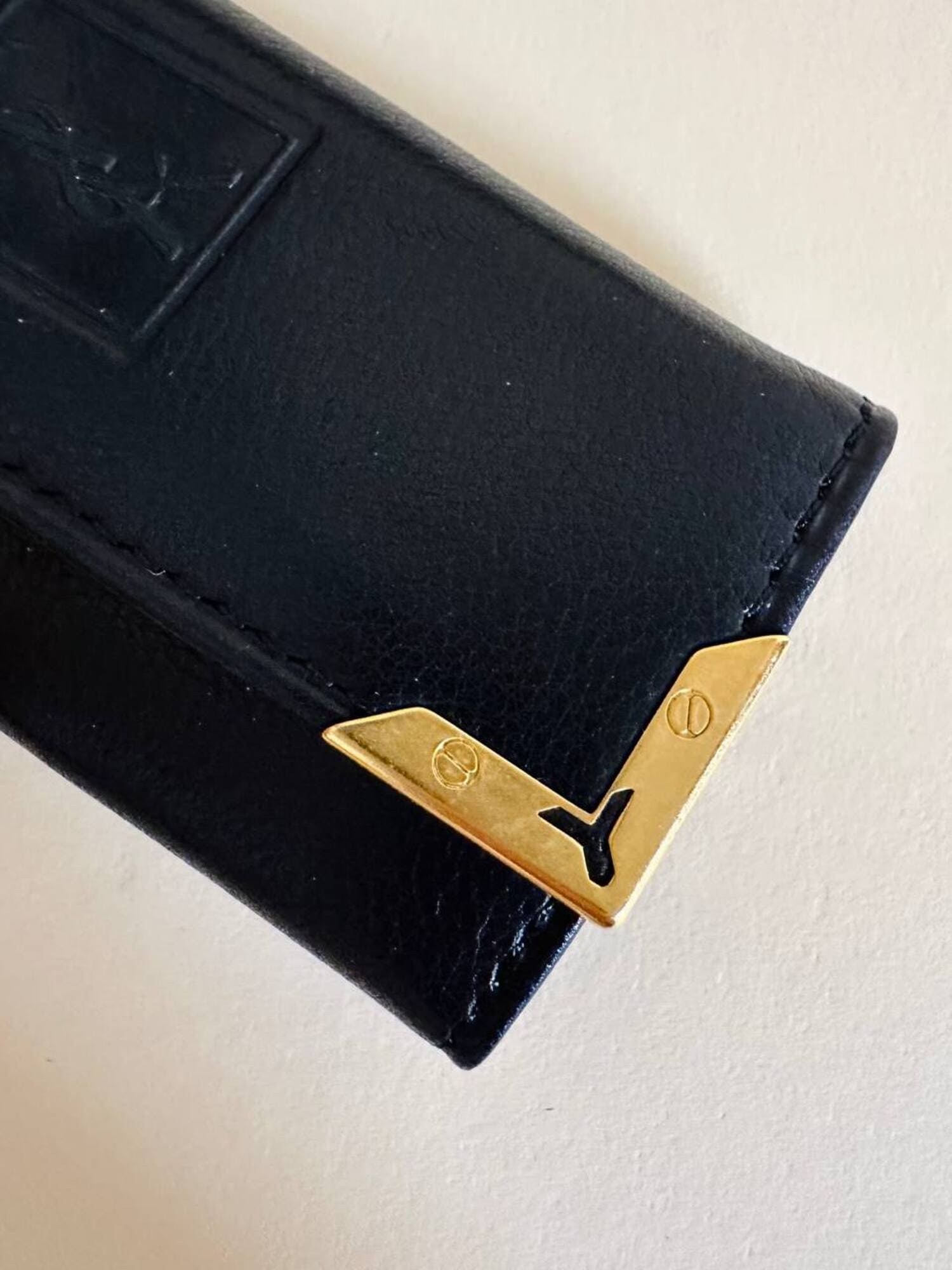 Raffinato ed elegante questo portachiavi trifold a sei ganci firmato Yves Saint Laurent è realizzato in pelle nera, arricchito da angolari dorati che conferiscono un carattere lussuoso e distintivo. Sulla parte frontale è presente il logo YSL impresso a caldo. Il design a tre ante con chiusura a bottone a pressione garantisce praticità e sicurezza, mentre gli angolari in metallo con “Y” forata esaltano l’estetica tipica della maison. All’interno, il marchio “Yves Saint Laurent” è stampato a caldo in foil oro, in perfetta armonia con l’hardware dorato e con l’impronta iconica del brand. Nuovo e completo di scatola originale.