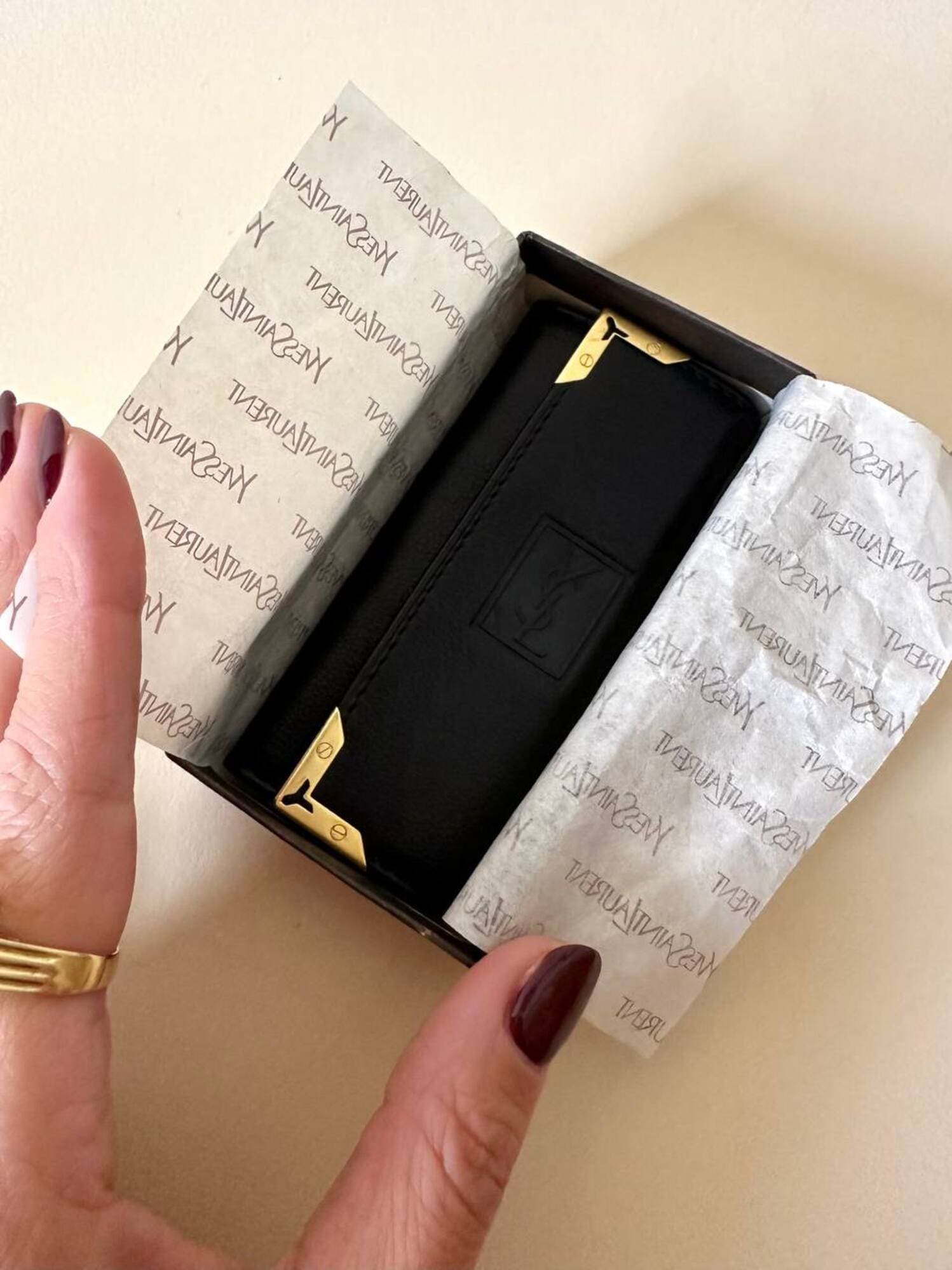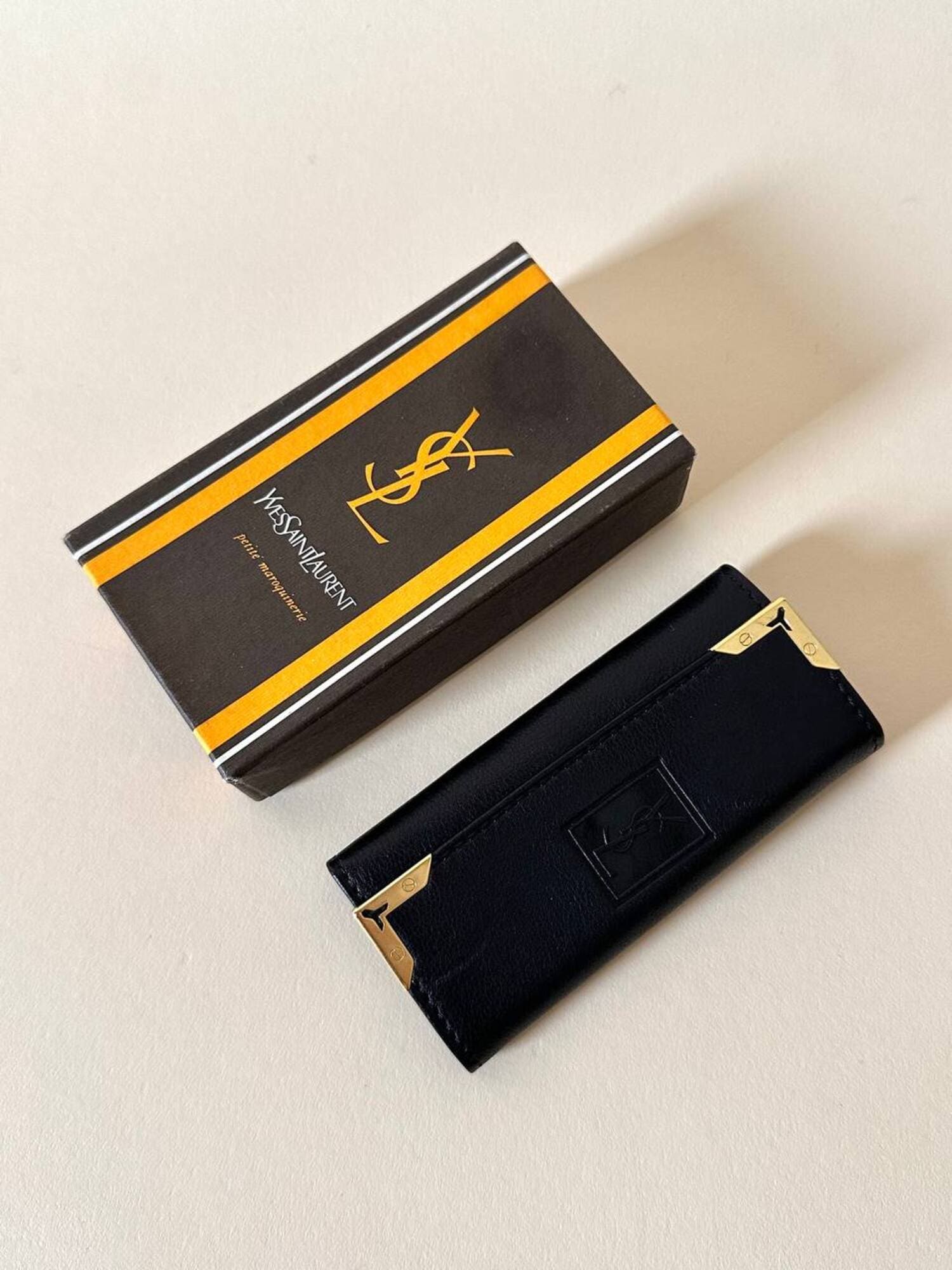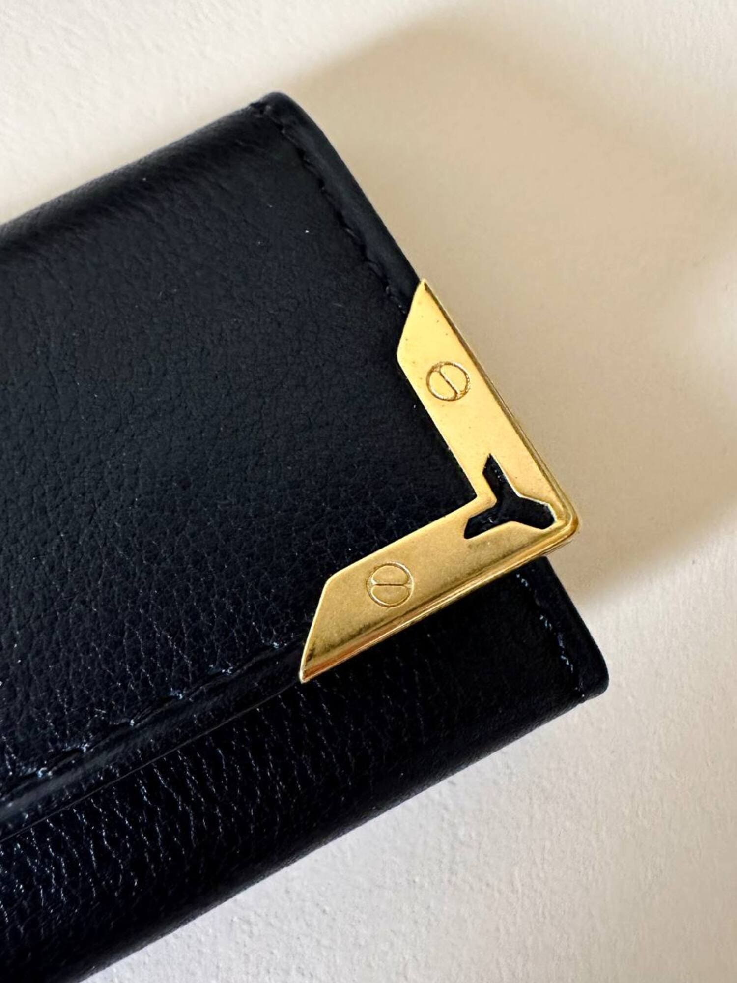 Raffinato ed elegante questo portachiavi trifold a sei ganci firmato Yves Saint Laurent è realizzato in pelle nera, arricchito da angolari dorati che conferiscono un carattere lussuoso e distintivo. Sulla parte frontale è presente il logo YSL impresso a caldo. Il design a tre ante con chiusura a bottone a pressione garantisce praticità e sicurezza, mentre gli angolari in metallo con “Y” forata esaltano l’estetica tipica della maison. All’interno, il marchio “Yves Saint Laurent” è stampato a caldo in foil oro, in perfetta armonia con l’hardware dorato e con l’impronta iconica del brand. Nuovo e completo di scatola originale.