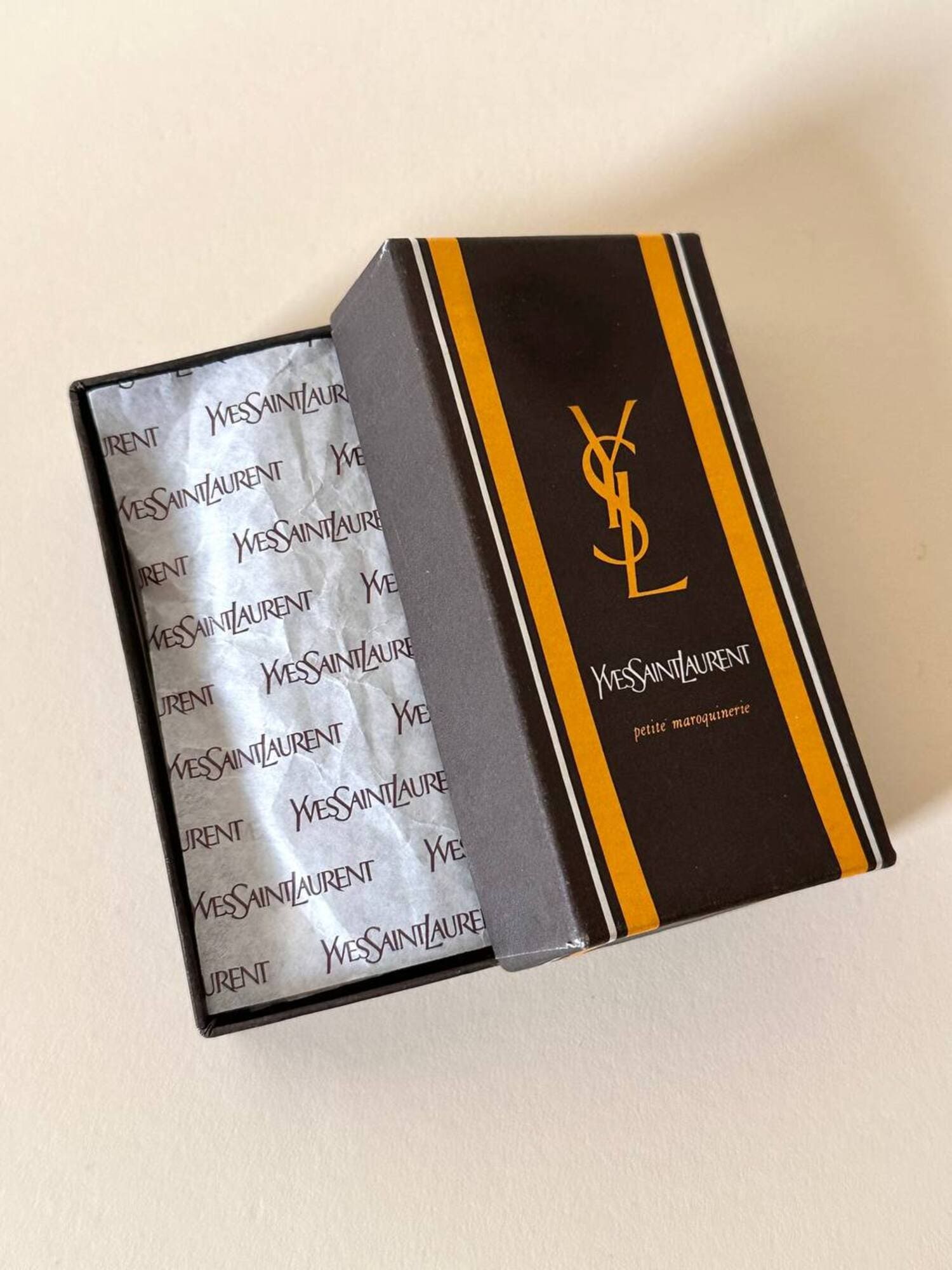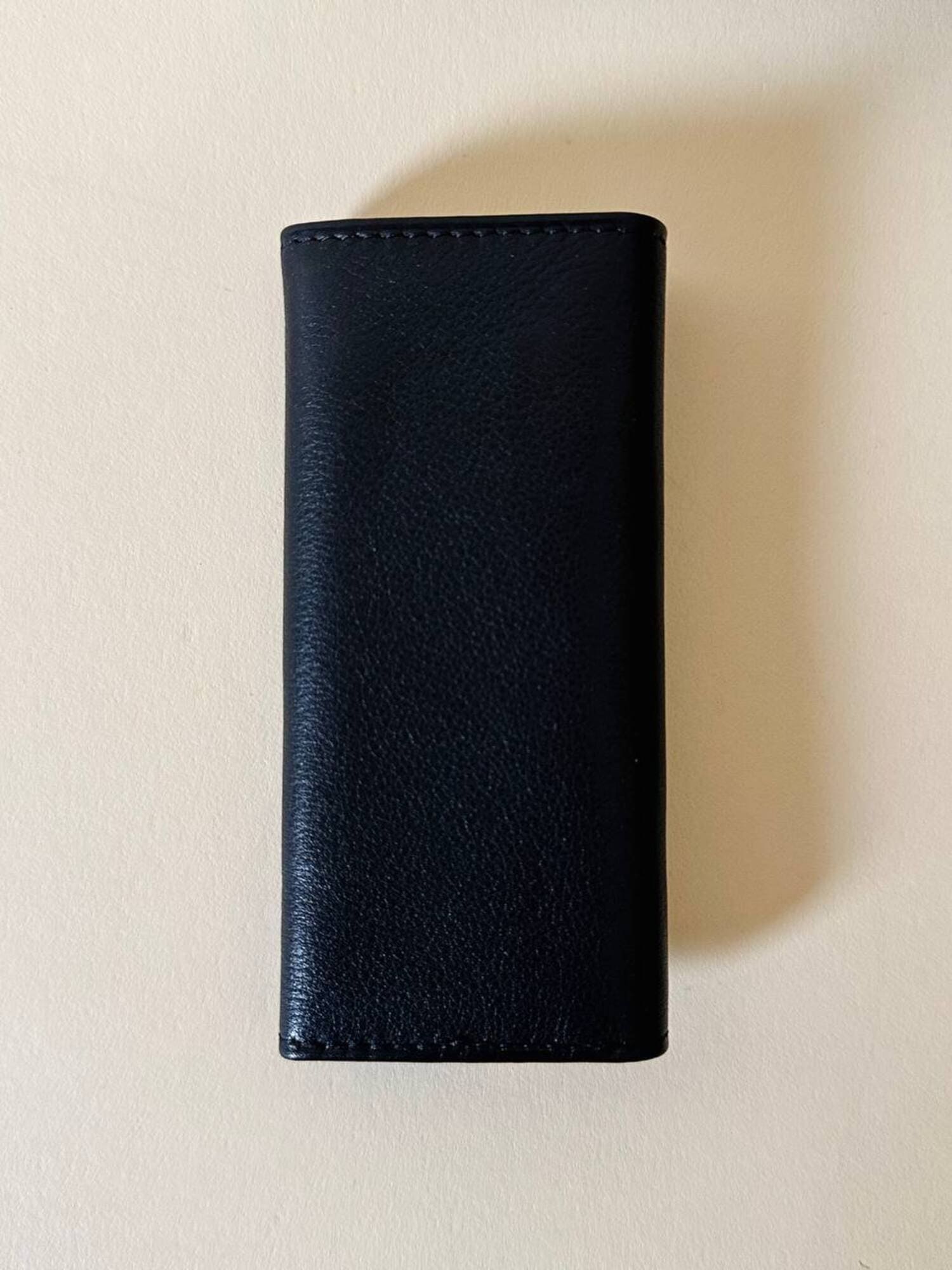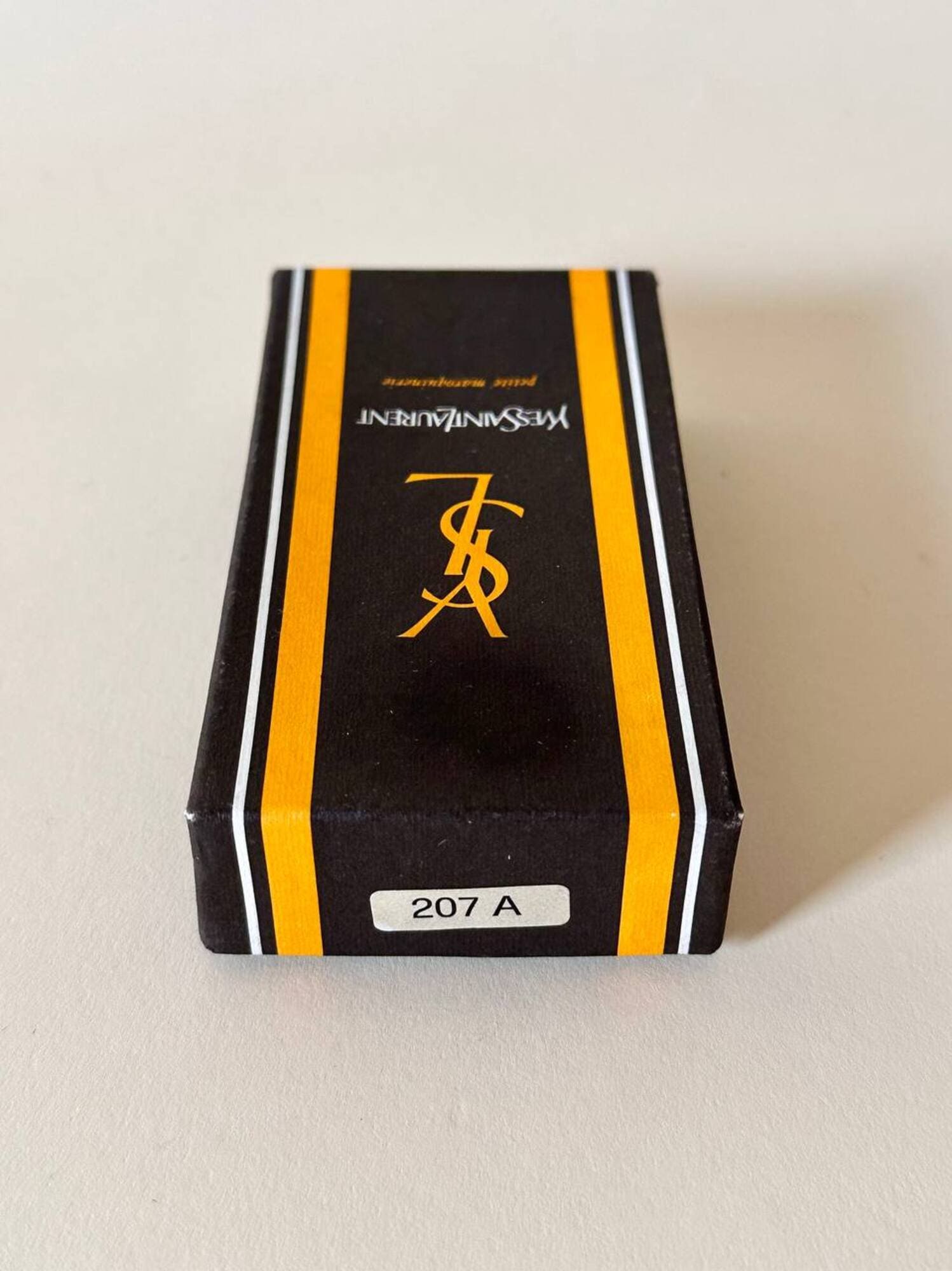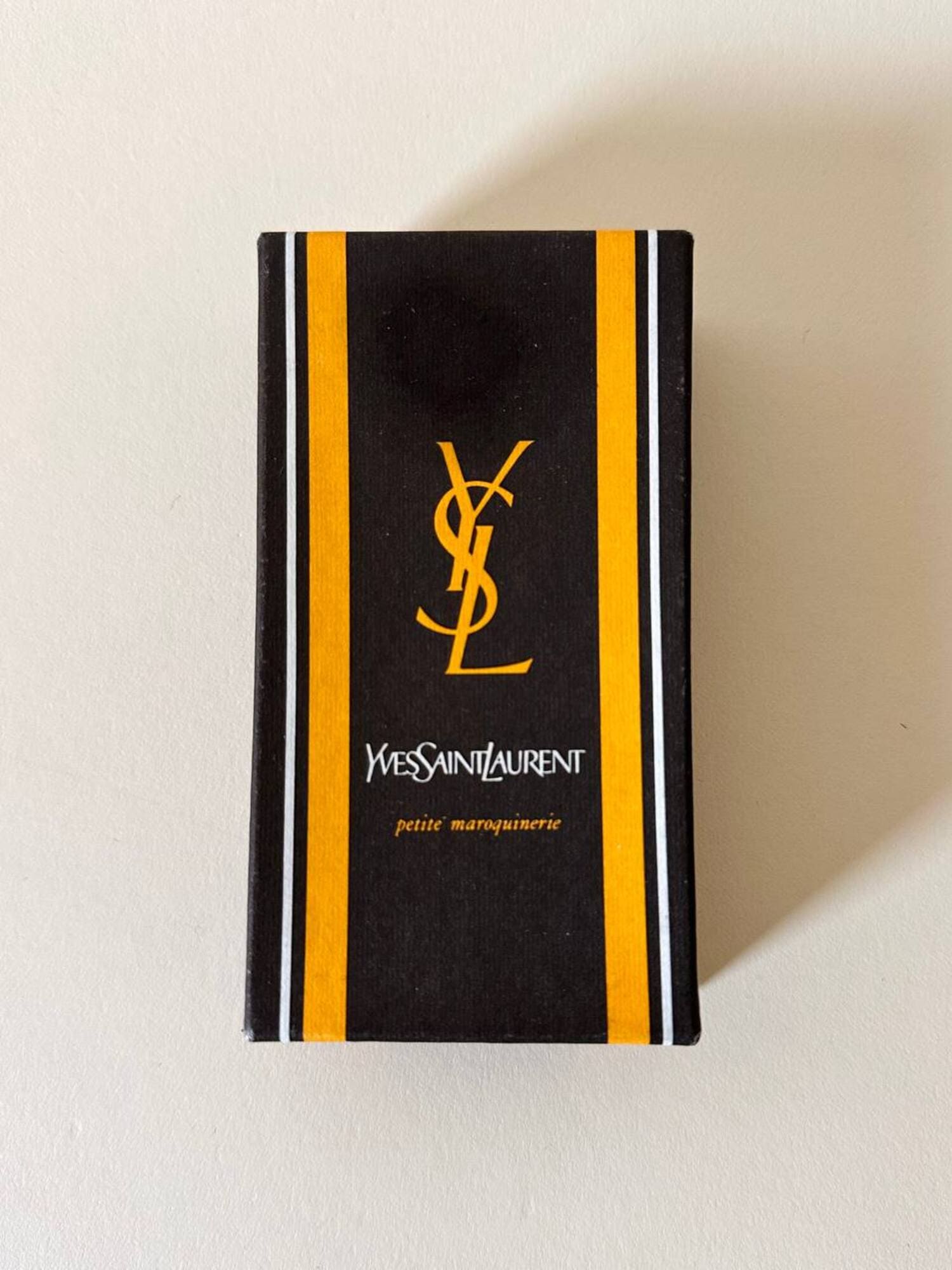 Raffinato ed elegante questo portachiavi trifold a sei ganci firmato Yves Saint Laurent è realizzato in pelle nera, arricchito da angolari dorati che conferiscono un carattere lussuoso e distintivo. Sulla parte frontale è presente il logo YSL impresso a caldo. Il design a tre ante con chiusura a bottone a pressione garantisce praticità e sicurezza, mentre gli angolari in metallo con “Y” forata esaltano l’estetica tipica della maison. All’interno, il marchio “Yves Saint Laurent” è stampato a caldo in foil oro, in perfetta armonia con l’hardware dorato e con l’impronta iconica del brand. Nuovo e completo di scatola originale.