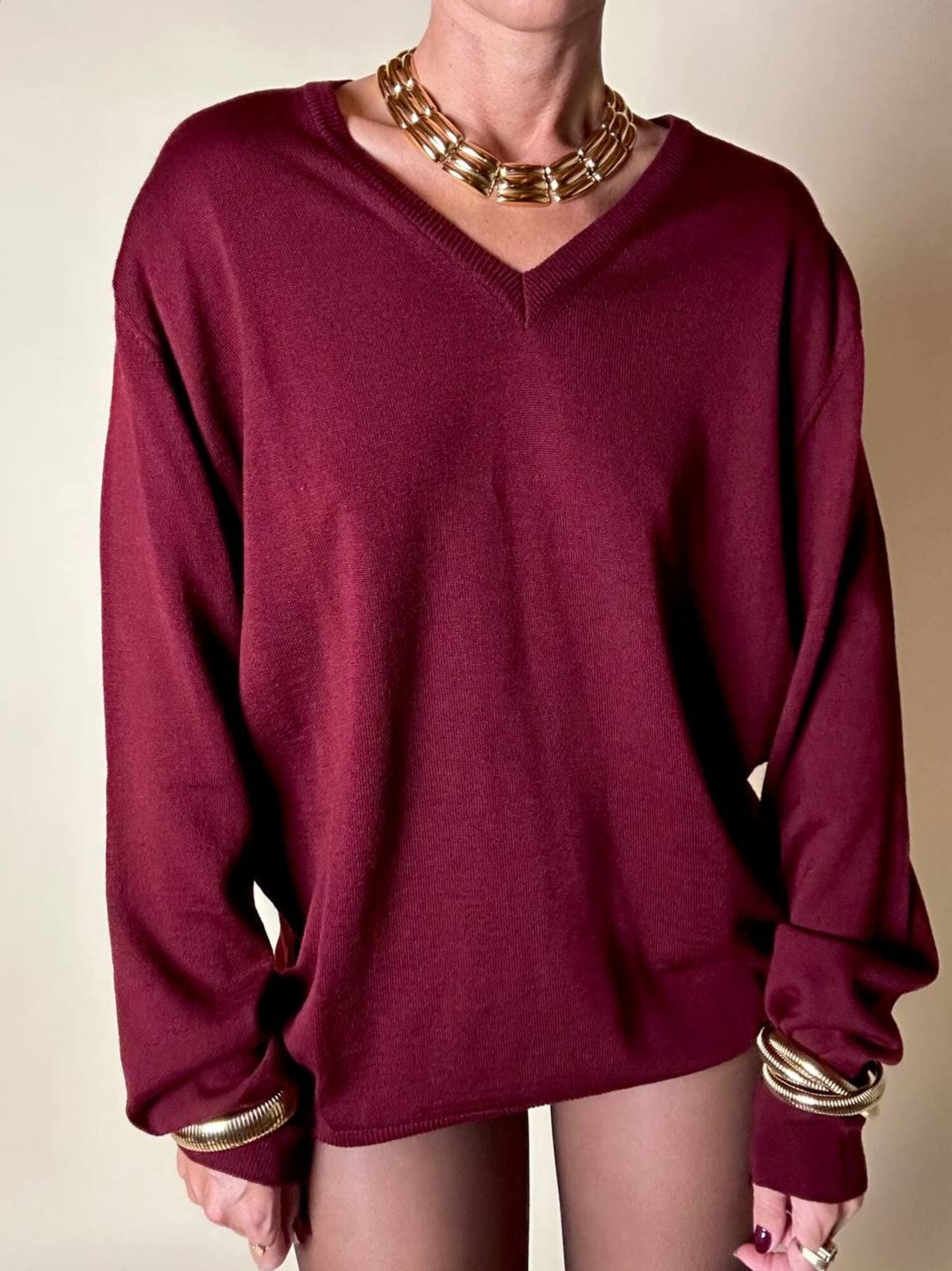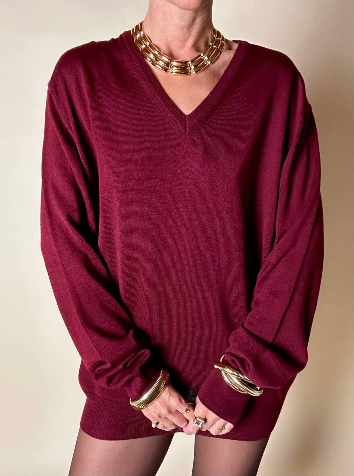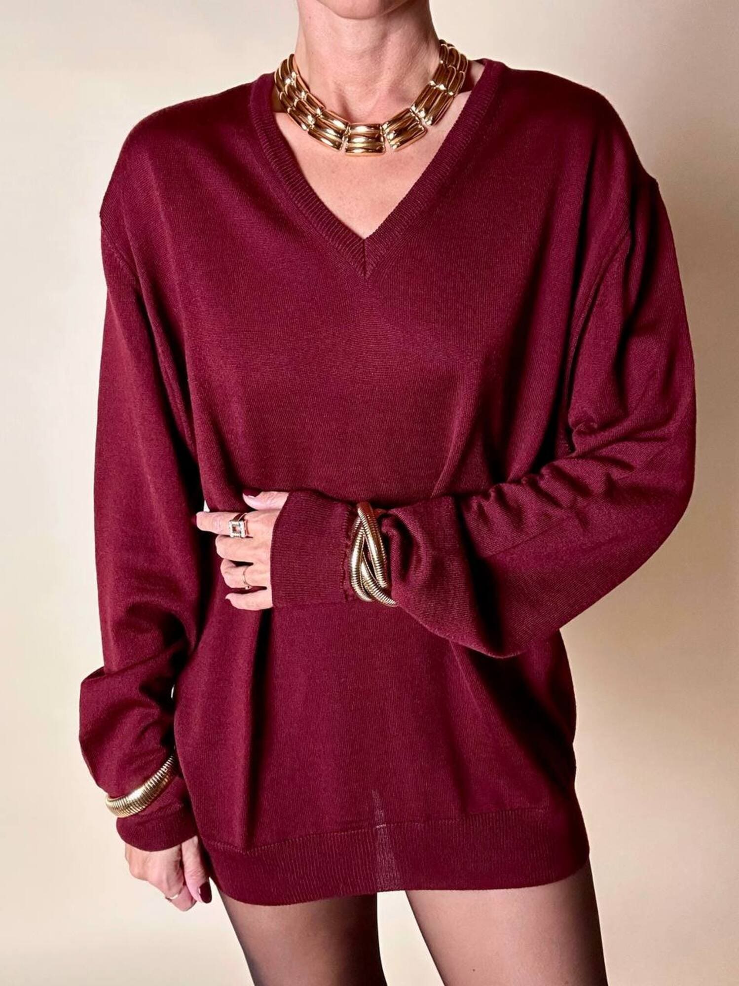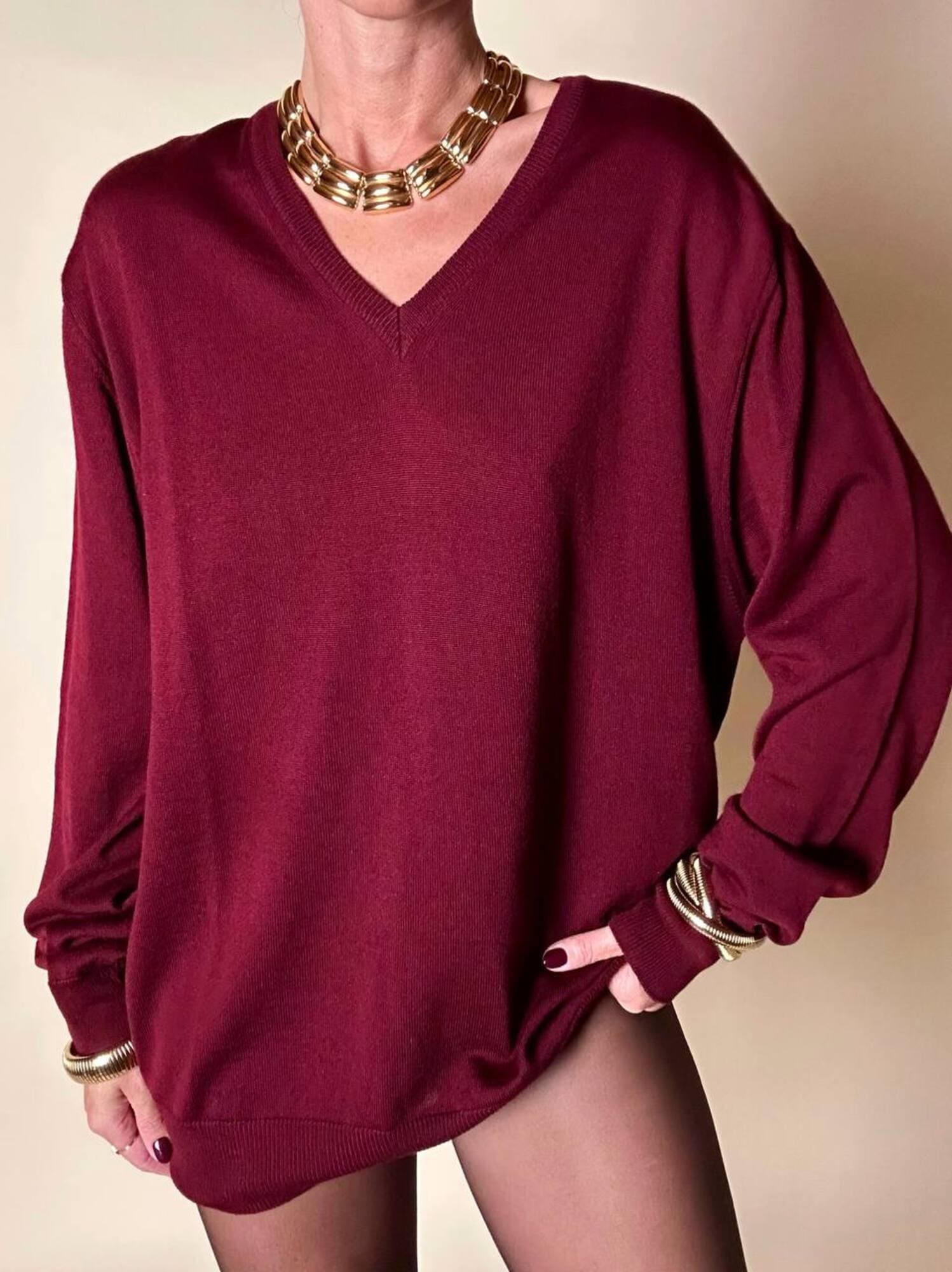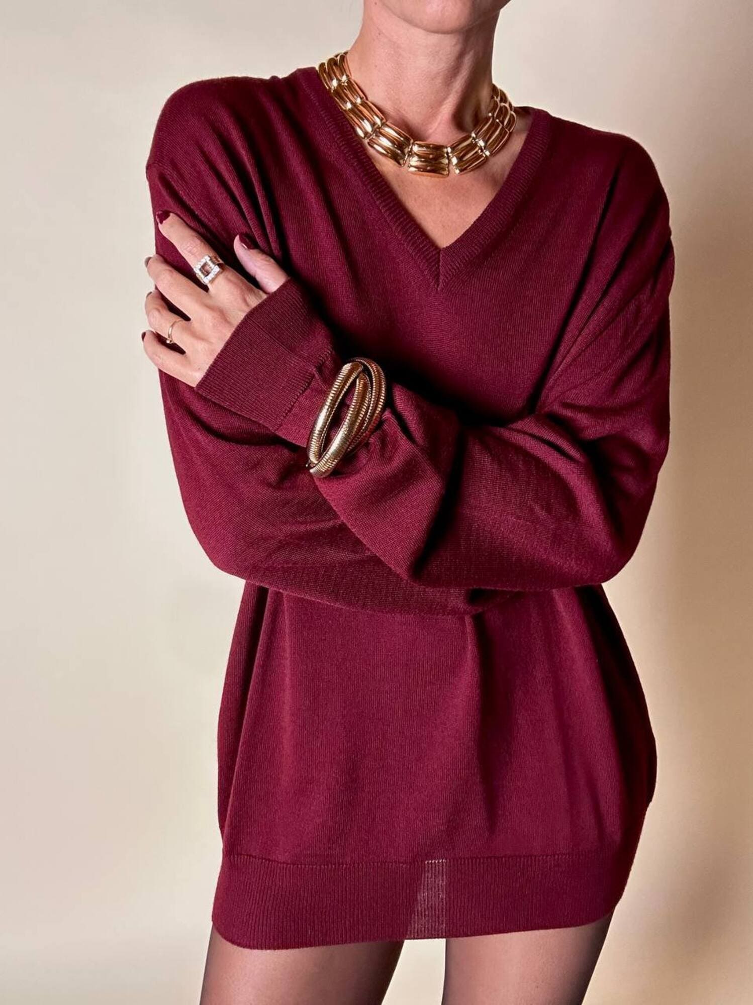 Questo pullover oversize in misto lana bordeaux firmato Wifshire è una dichiarazione di eleganza rilassata, dove la linea fluida e lo scollo a V profondo disegnano un equilibrio perfetto tra femminilità e rigore. La tonalità bordeaux intenso racconta un’eleganza senza tempo e valorizza ogni abbinamento, dal denim al tailoring più raffinato. Ideale per chi ricerca eleganza e comfort, questo pullover rappresenta il classico lusso essenziale.