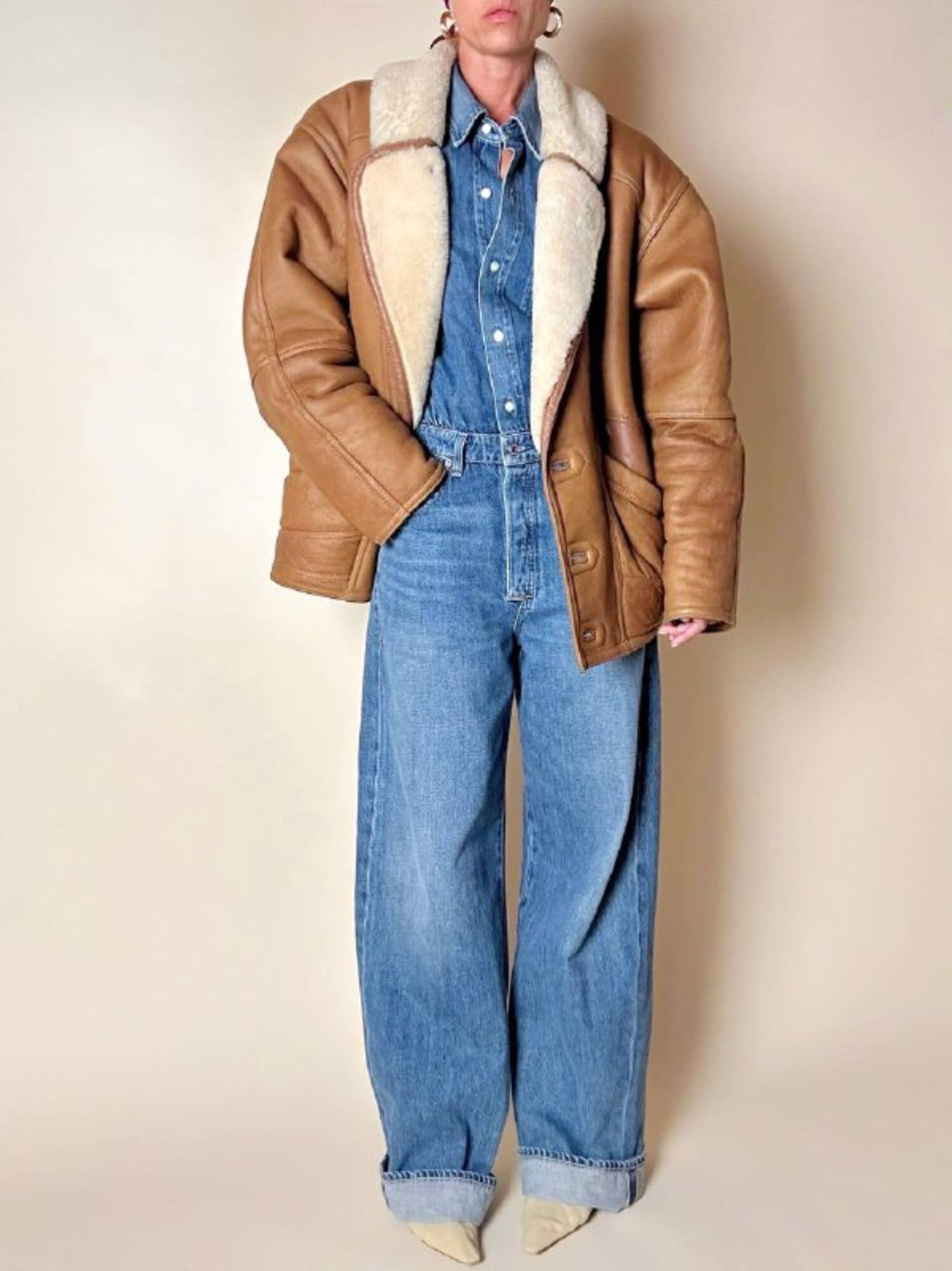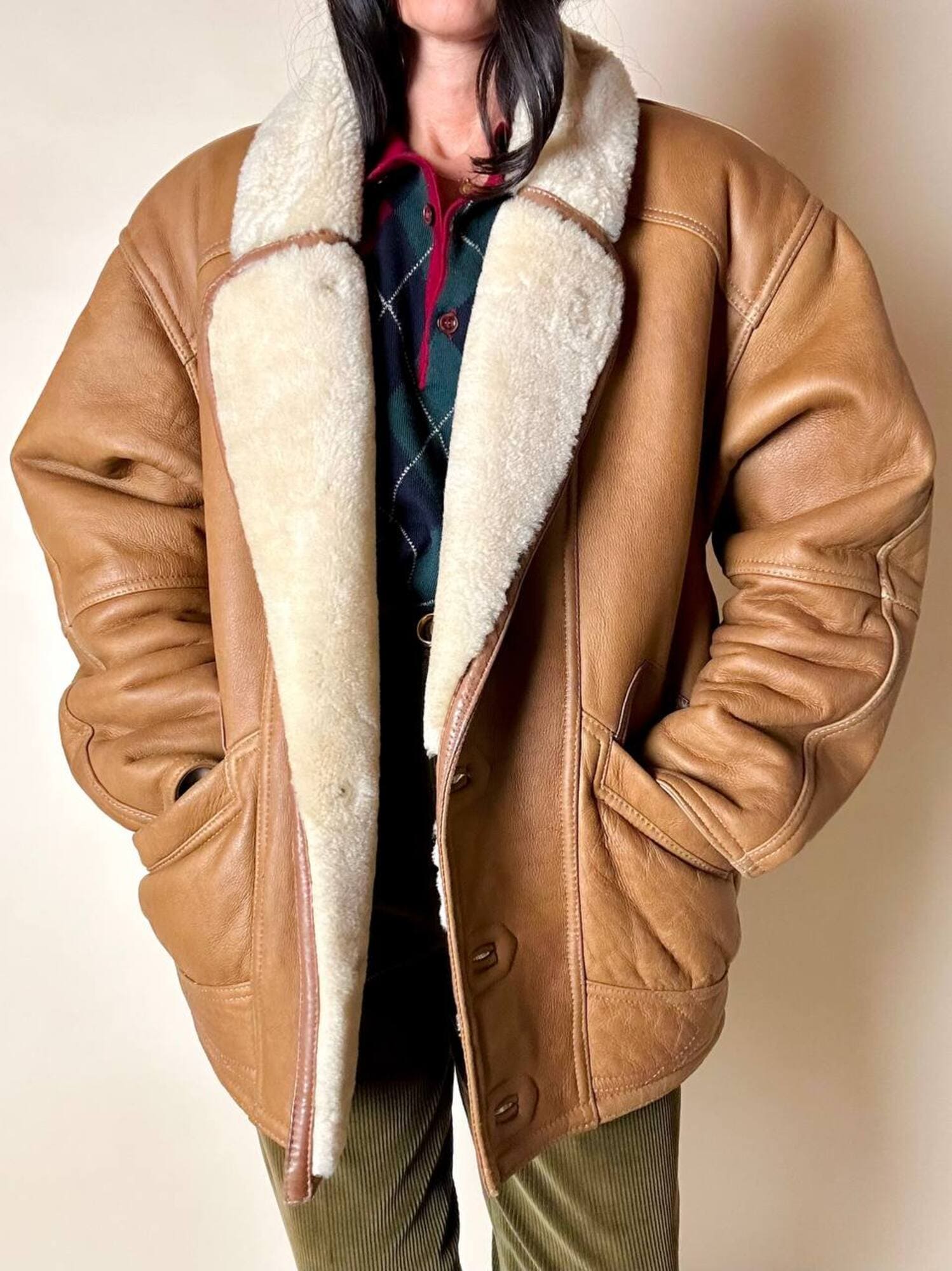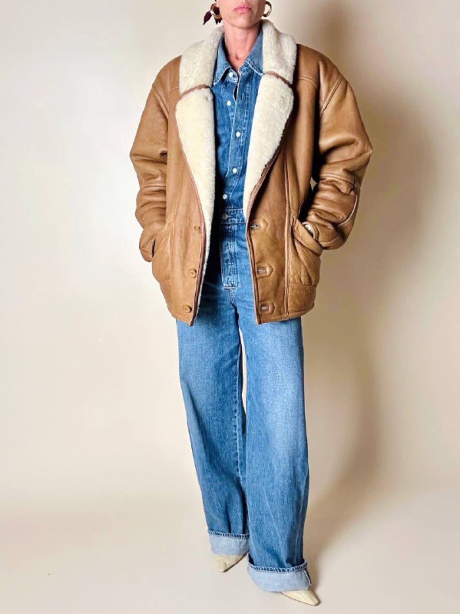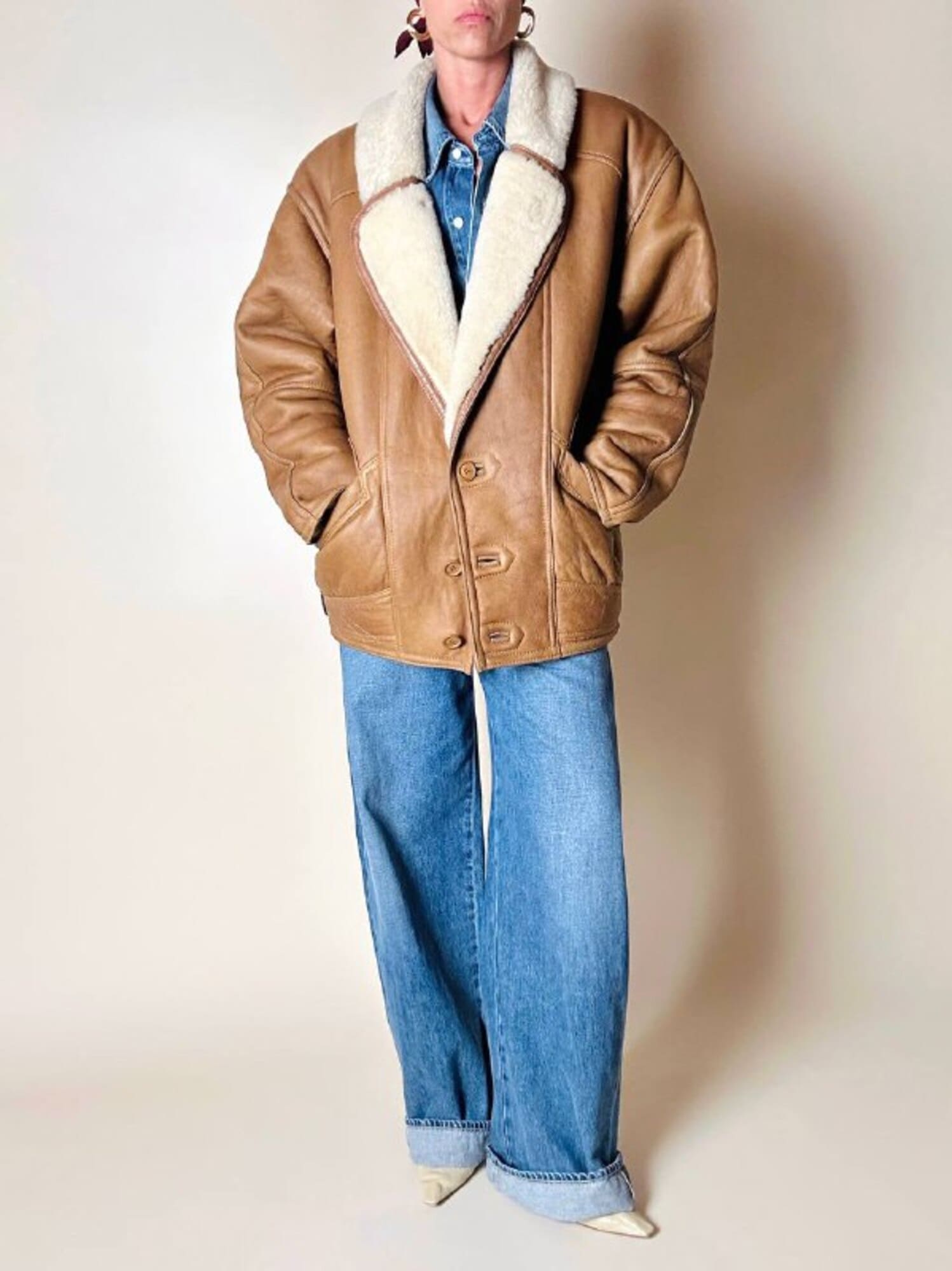Questo schearling firmato Marcus Creazioni esprime artigianalità e stile senza tempo. Il modello oversize presenta chiusura frontale monopetto con tre bottoni tono su tono e un rever ampio che mostra il vello interno. Le due ampie tasche frontali sono completate da un grande riporto in pelle applicato sopra l’apertura, mentre le maniche lunghe possono essere risvoltate per mostrare la pelliccia interna e regolare la lunghezza secondo le esigenze. Il design è completato da cuciture a vista, rinforzate da bordature in pelle più scura lungo colletto, tasche, maniche e cuciture principali, e cinturini laterali con fibbie in metallo ottone invecchiato, che conferiscono carattere e definizione al capo.