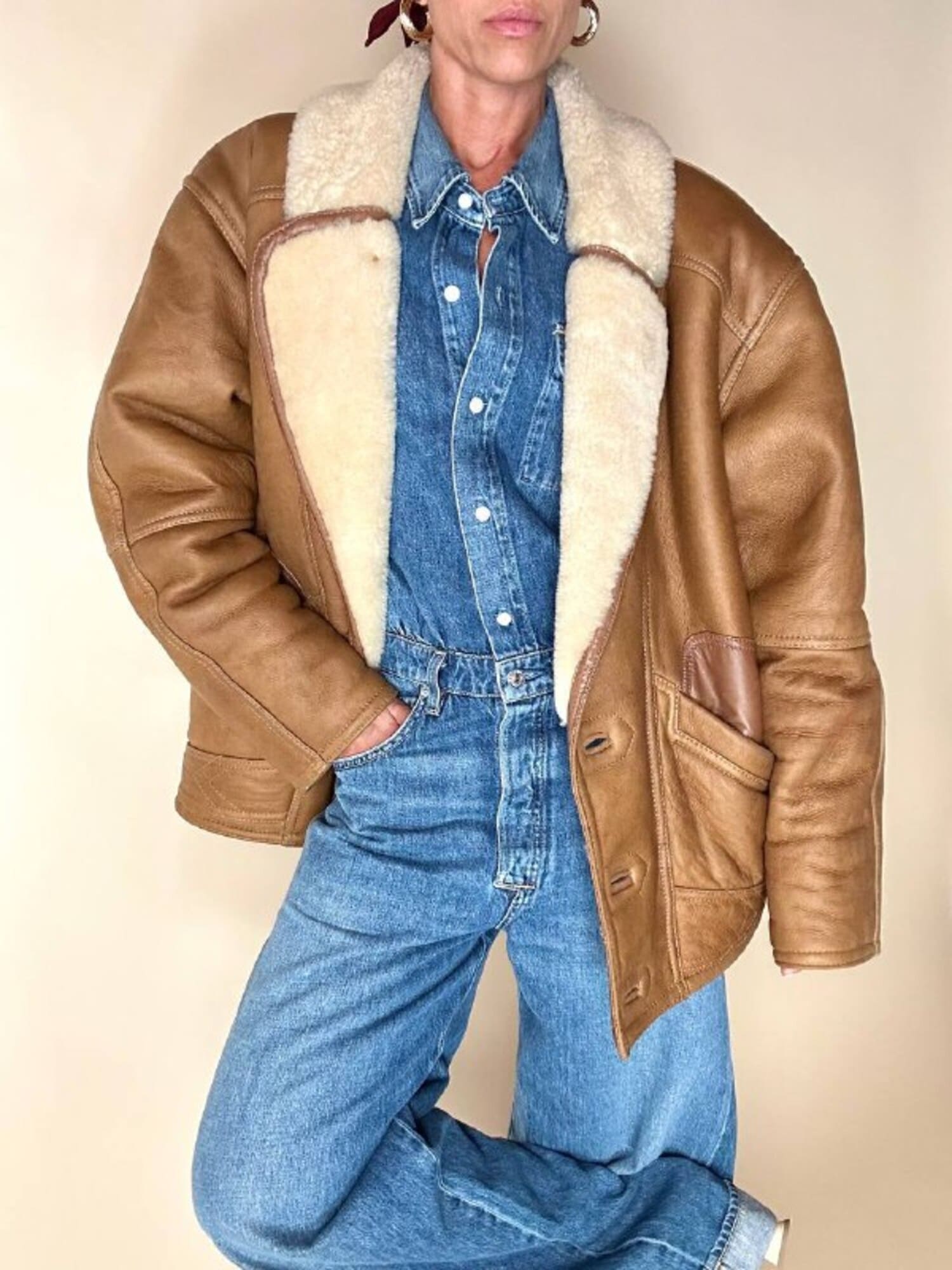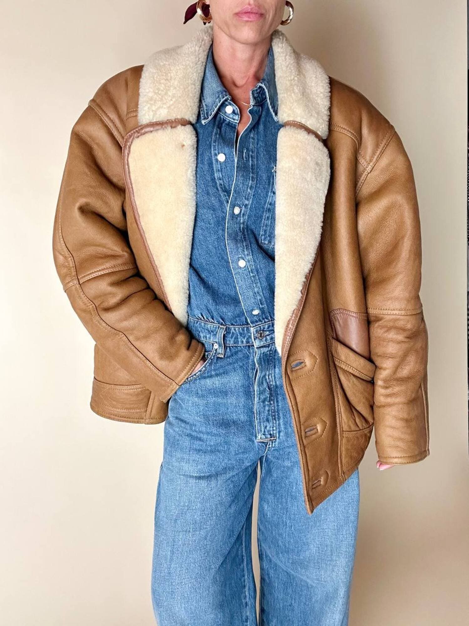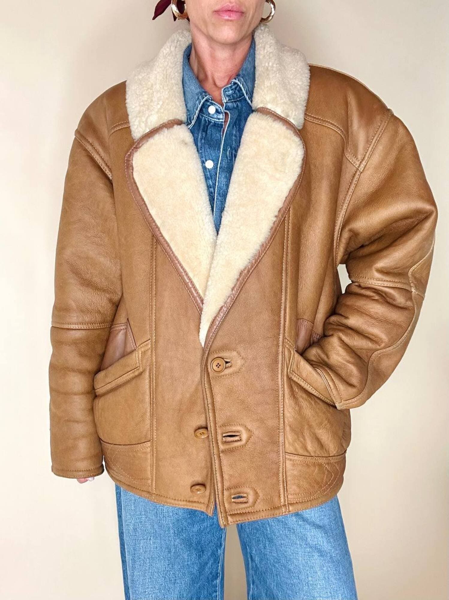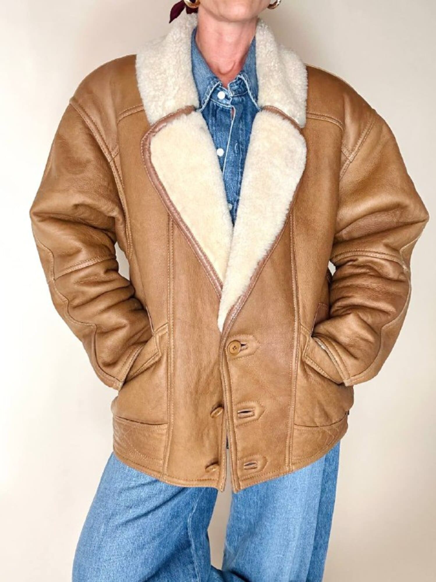 Questo schearling firmato Marcus Creazioni esprime artigianalità e stile senza tempo. Il modello oversize presenta chiusura frontale monopetto con tre bottoni tono su tono e un rever ampio che mostra il vello interno. Le due ampie tasche frontali sono completate da un grande riporto in pelle applicato sopra l’apertura, mentre le maniche lunghe possono essere risvoltate per mostrare la pelliccia interna e regolare la lunghezza secondo le esigenze. Il design è completato da cuciture a vista, rinforzate da bordature in pelle più scura lungo colletto, tasche, maniche e cuciture principali, e cinturini laterali con fibbie in metallo ottone invecchiato, che conferiscono carattere e definizione al capo.