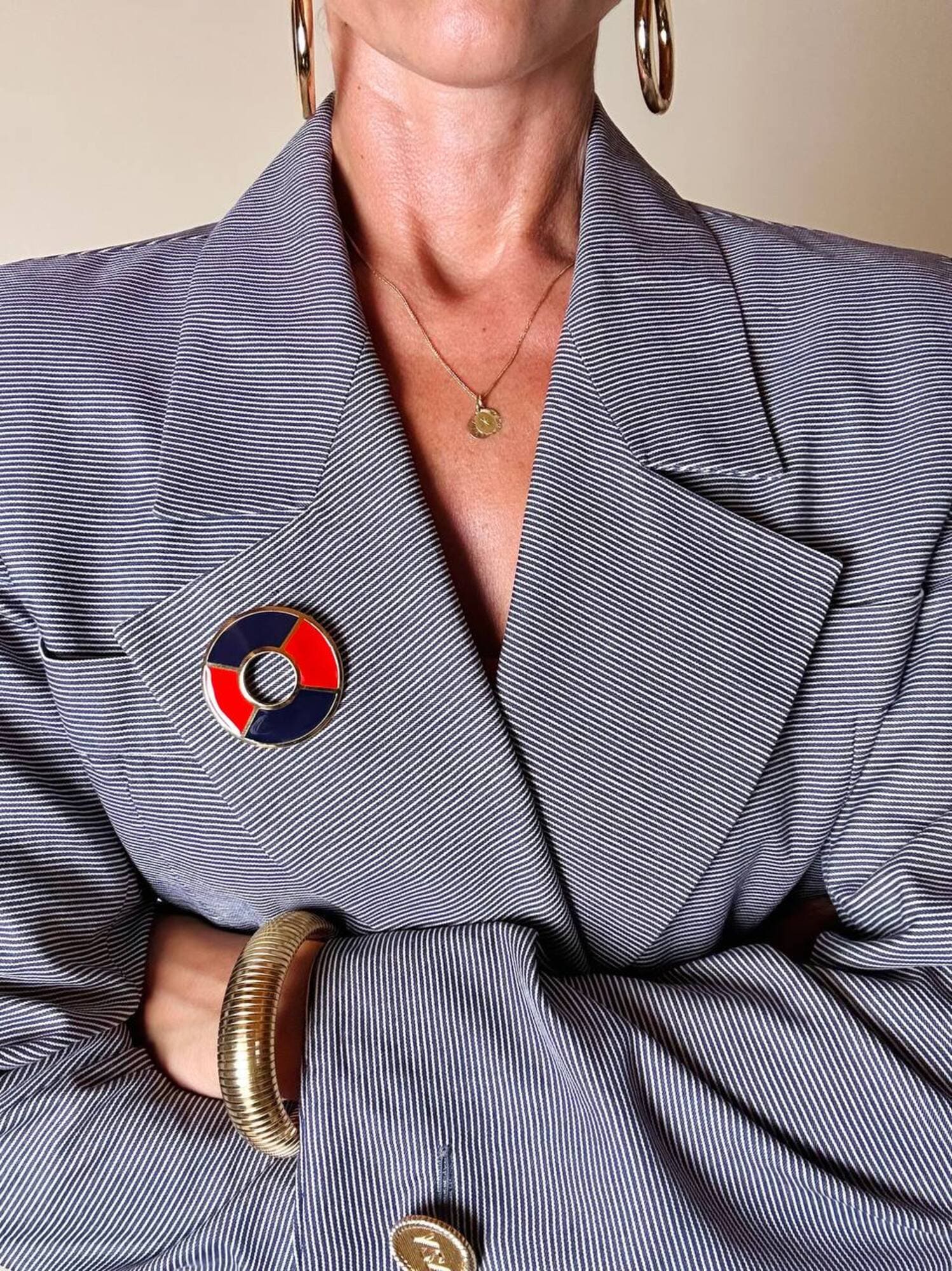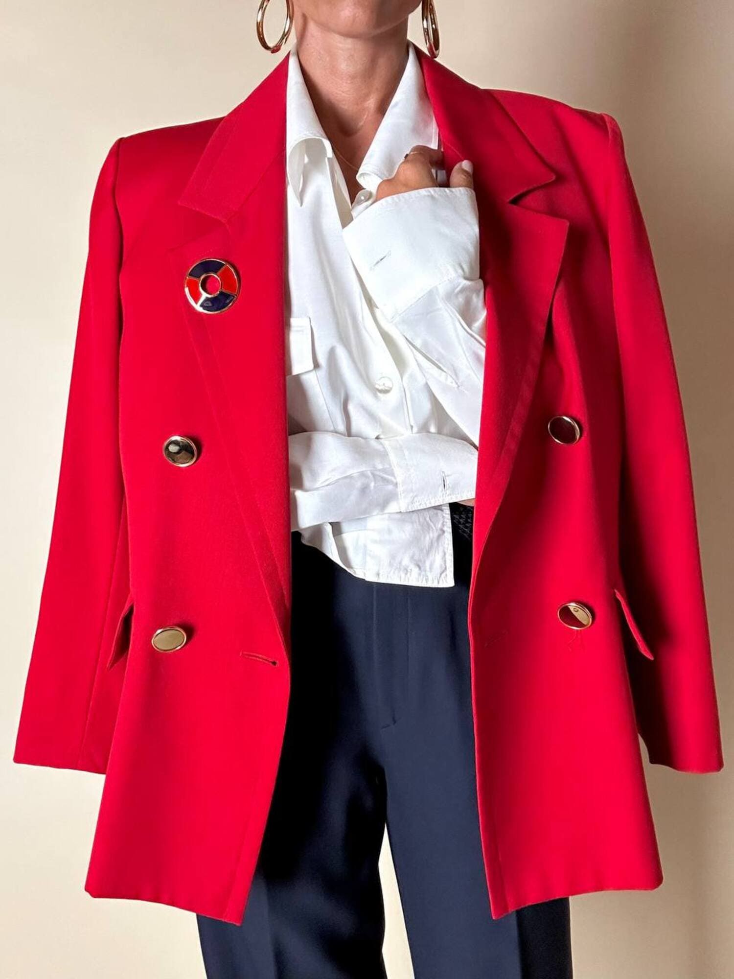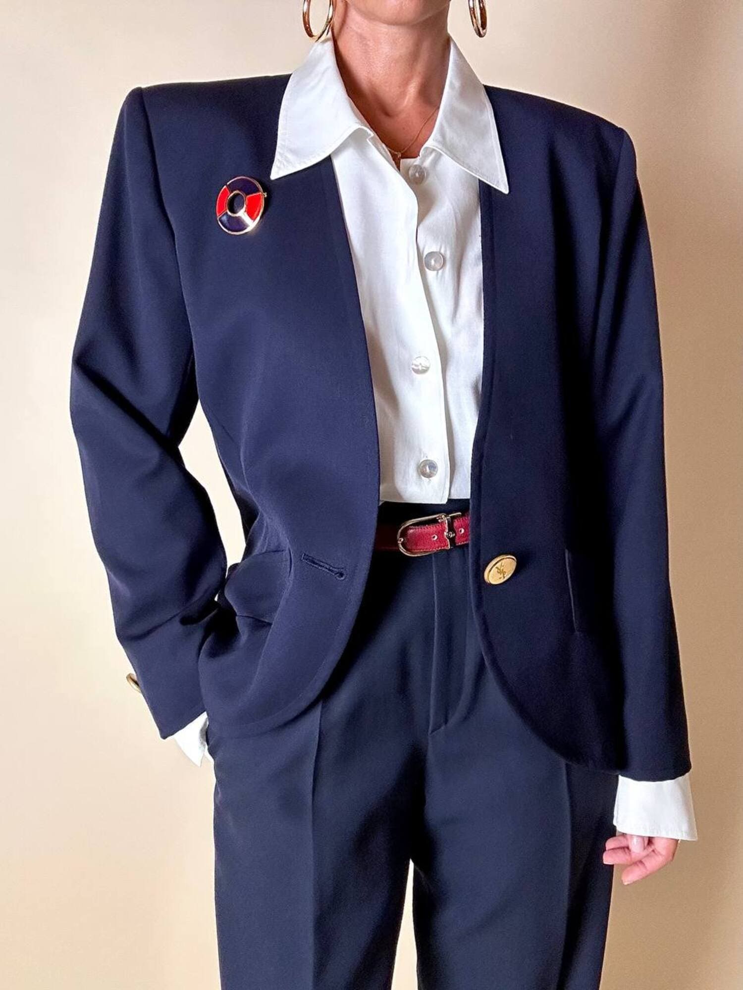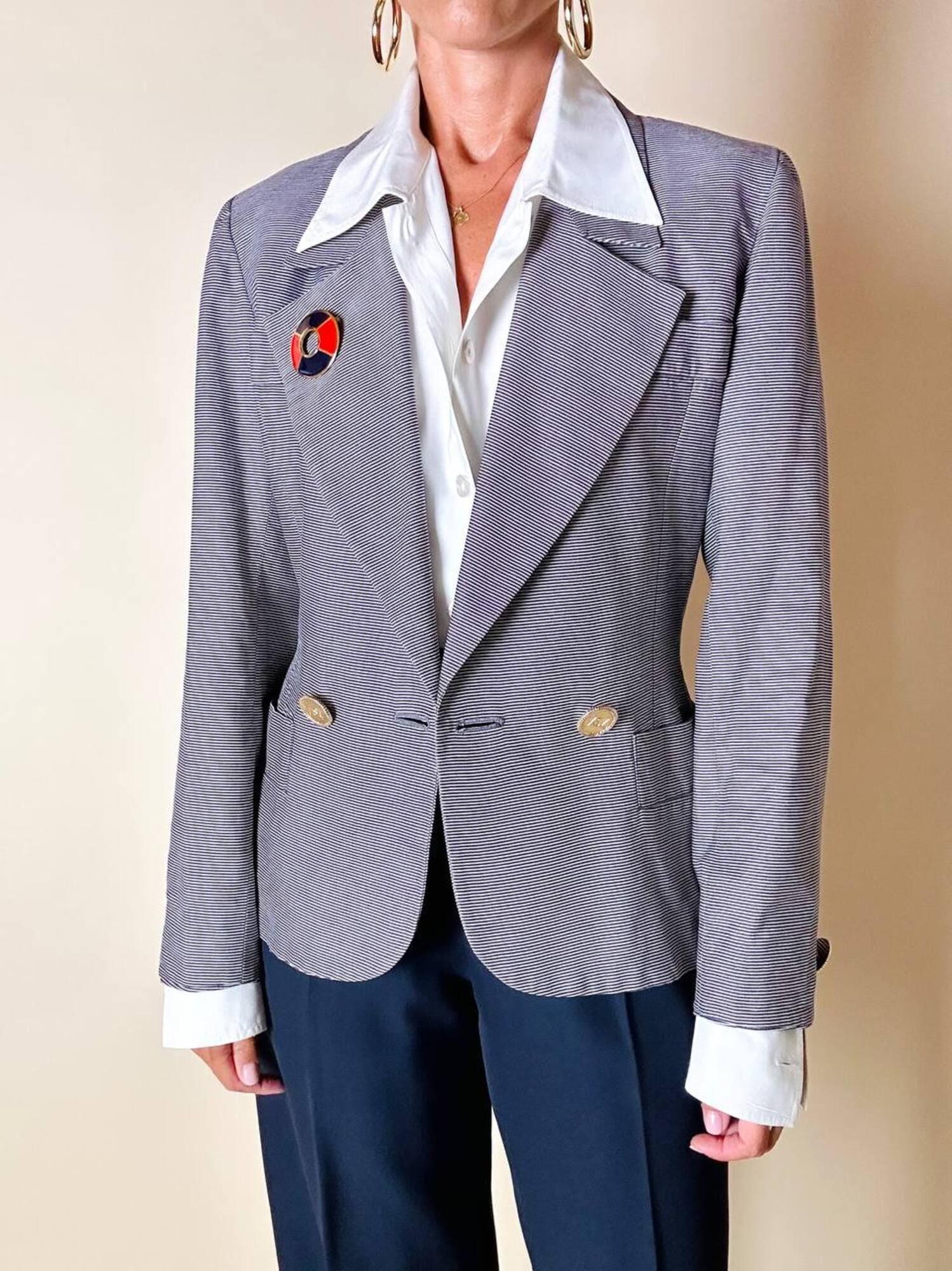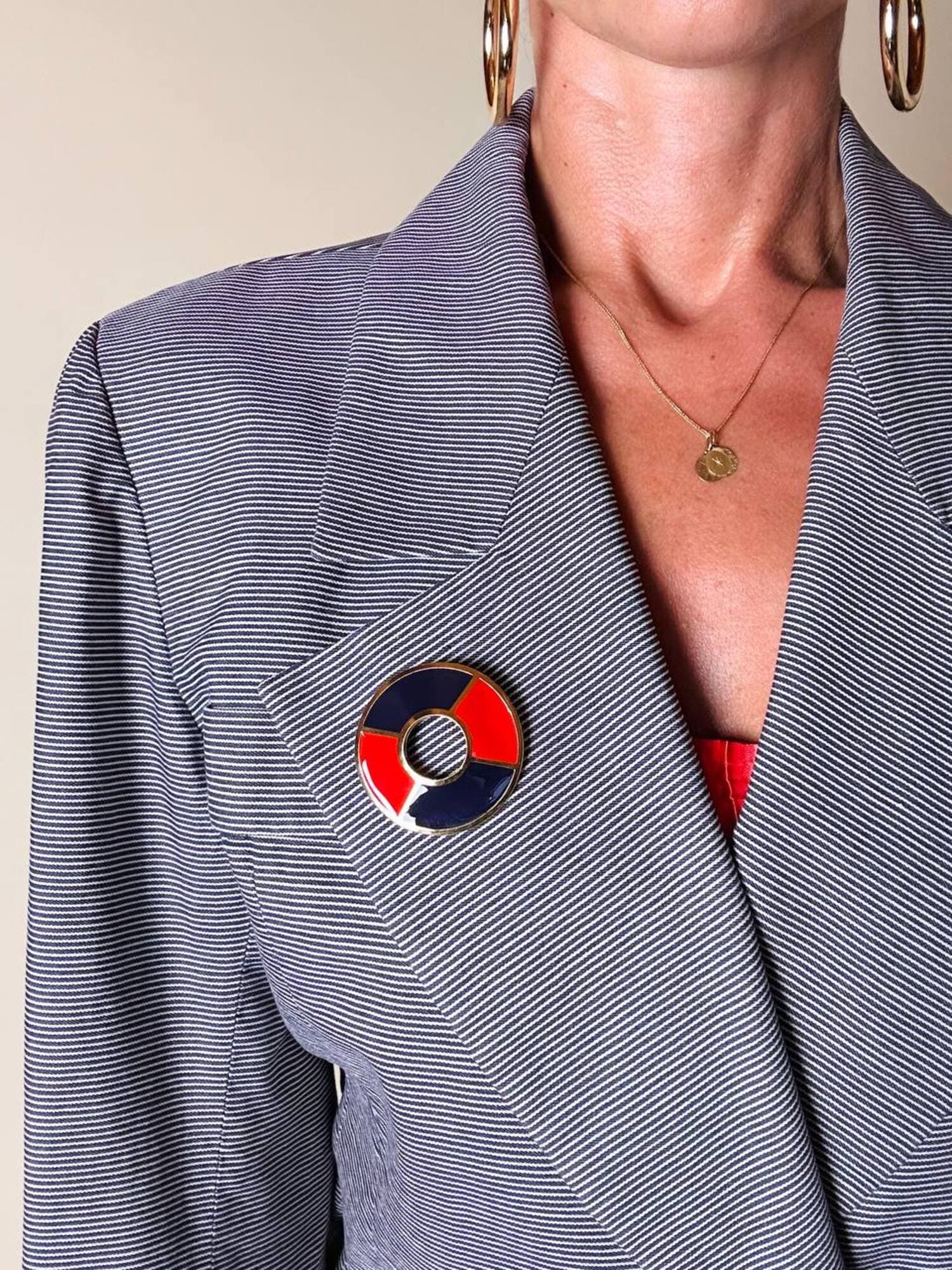 Piccola, preziosa, iconica: questa spilla firmata Yves Saint Laurent unisce la creatività della maison a un’estetica raffinata e giocosa, ispirata all’universo nautico. Realizzata in metallo dorato lucido, la spilla ha la forma stilizzata di un salvagente, reinterpretato in chiave gioiello grazie all’alternanza di smalto rosso e blu intenso che ne definisce i volumi con equilibrio e vivacità. Nel retro è presente il punzone “YSL Made in France”. Un accessorio originale e sofisticato, perfetto da appuntare su blazer, giacche, camicie o cappotti per aggiungere un dettaglio couture dallo spirito marinaro, elegante ma ironico. La firma “Yves Saint Laurent” incisa sul retro ne certifica l’autenticità e il pregio.