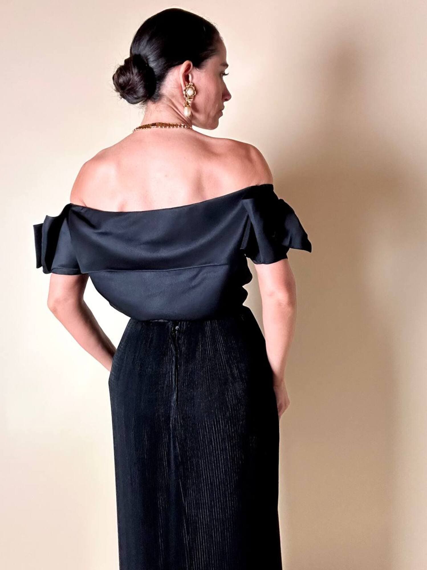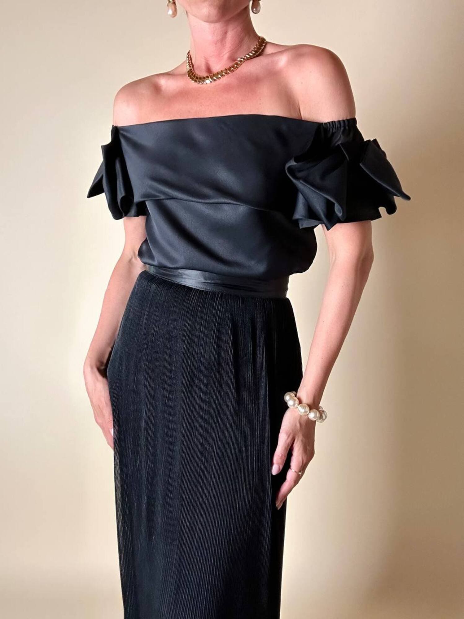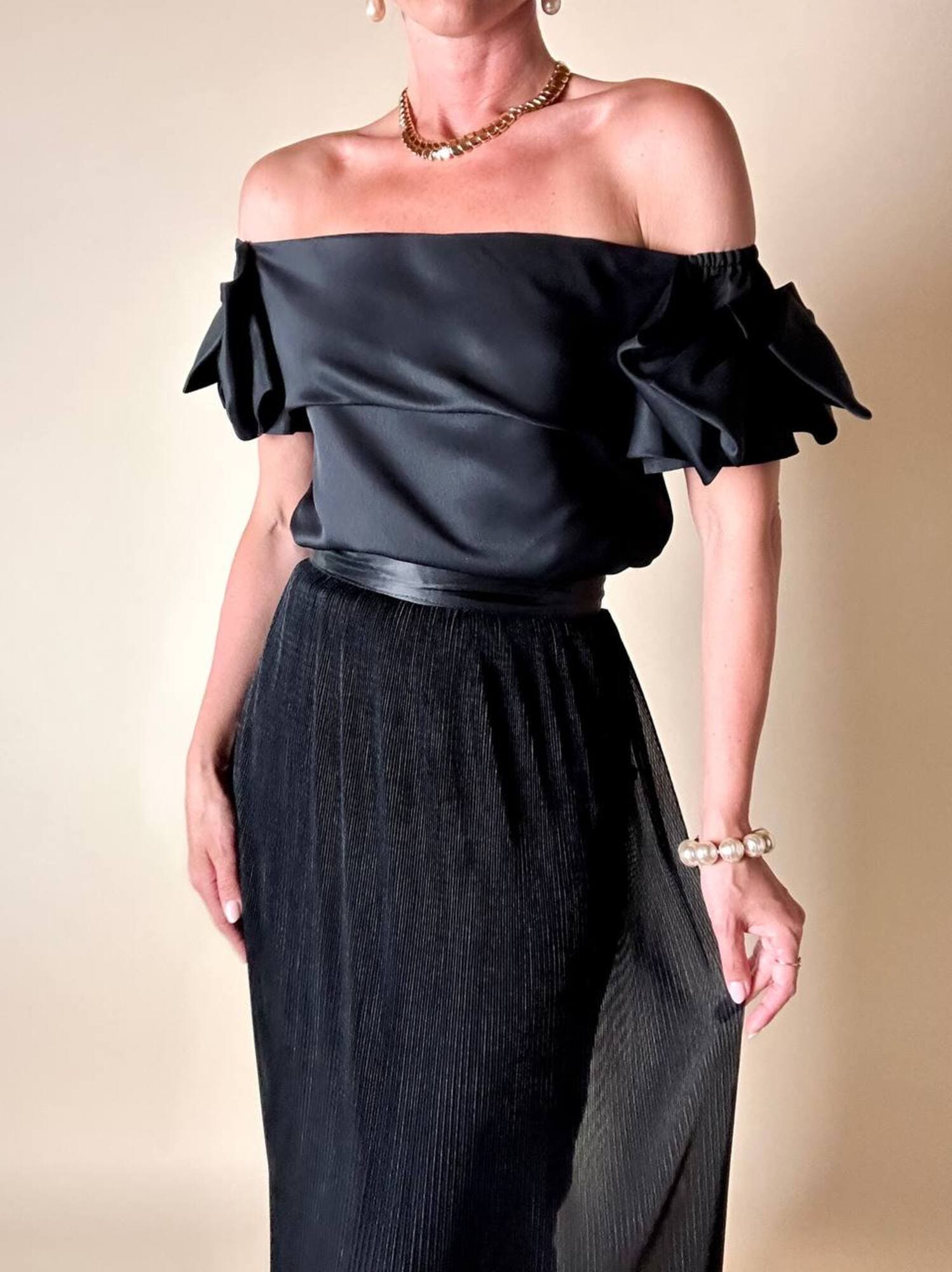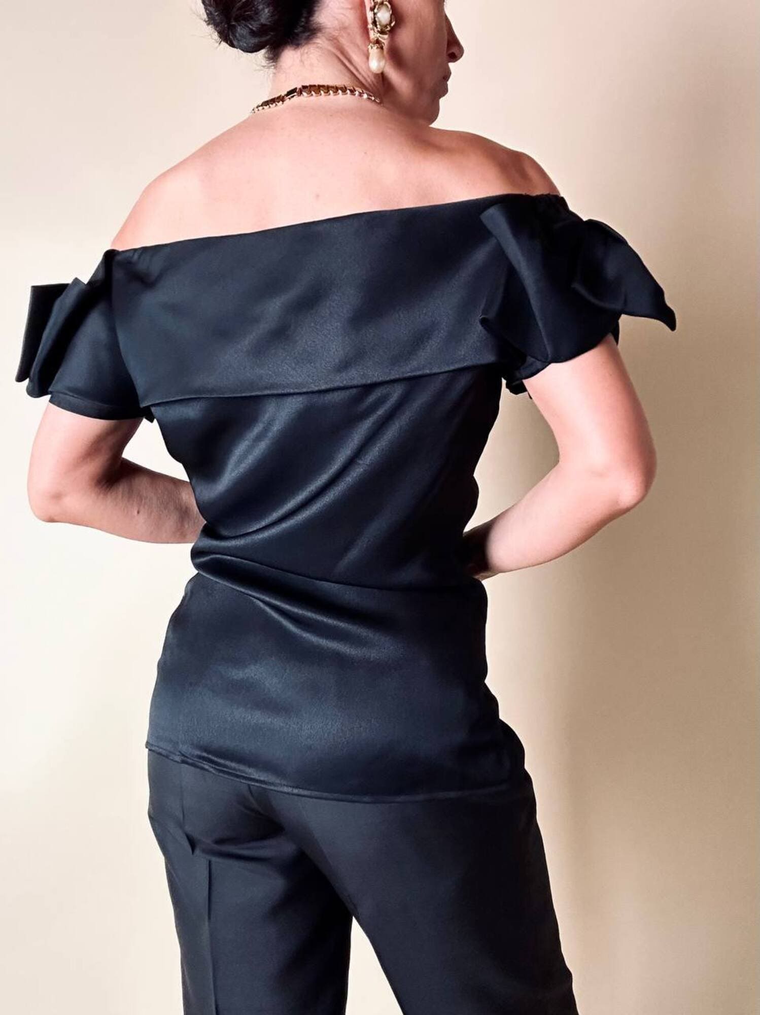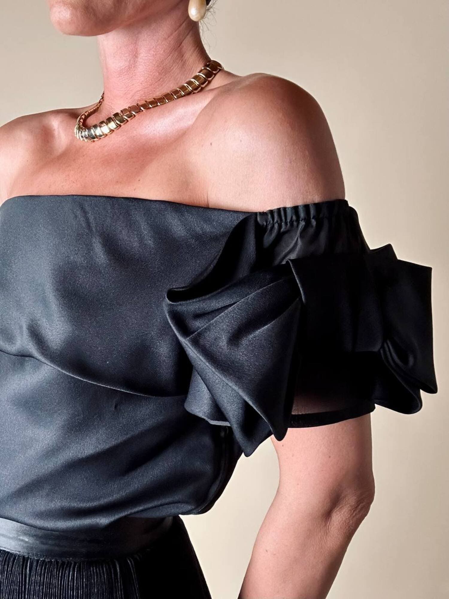 Un capo che unisce teatralità e raffinatezza con sorprendente versatilità. Questo top in seta nera con spalle scoperte e maxi fiocchi della linea “Istante” by Gianni Versace è un omaggio alla femminilità dinamica, capace di adattarsi con stile a ogni occasione coniuga classe e sensualità. La grande balza con comodi elastici laterali lascia le spalle scoperte esaltando la femminilità, le maniche corte sono realizzate in organza nera. A rendere il capo scenografico sono i due maxi fiocchi applicati ai lati che donano movimento e fascino scultoreo. La seta fluida, lucente e impalpabile, avvolge la figura con eleganza, mentre la zip laterale a scomparsa ne rende pratico l’utilizzo. Perfetto per serate speciali o eventi esclusivi, abbinato a una gonna lunga e orecchini gioiello, sia per un cocktail metropolitano con pantaloni sartoriali. Un top trasformista, pensato per la donna che ama reinventarsi con charme.