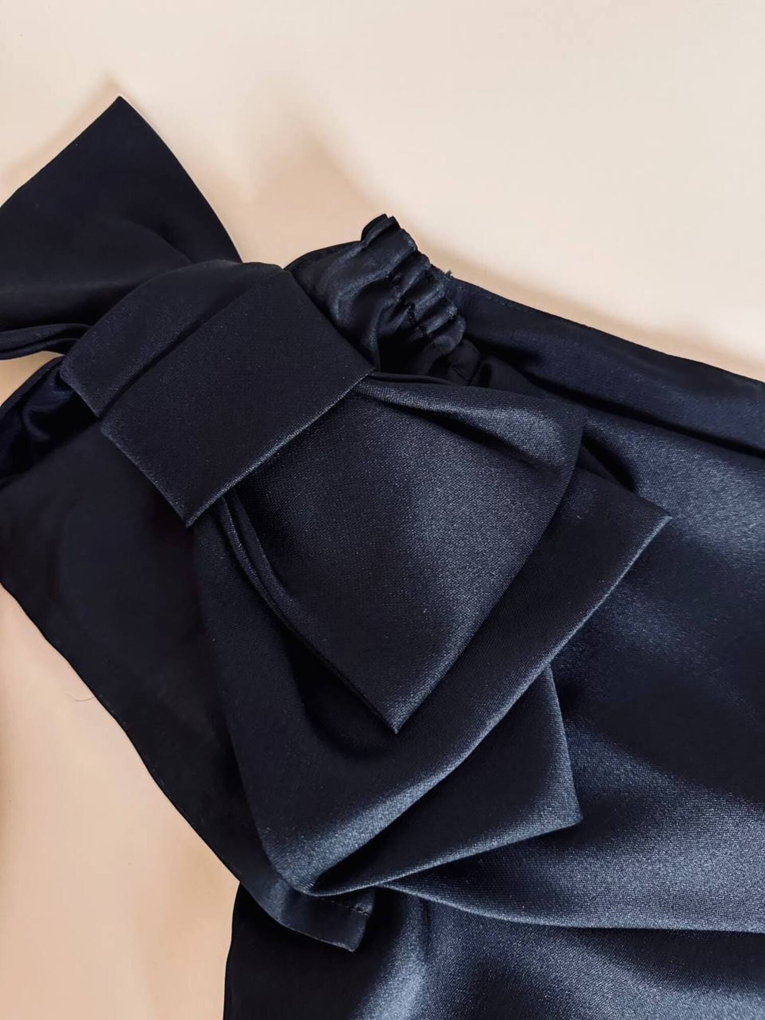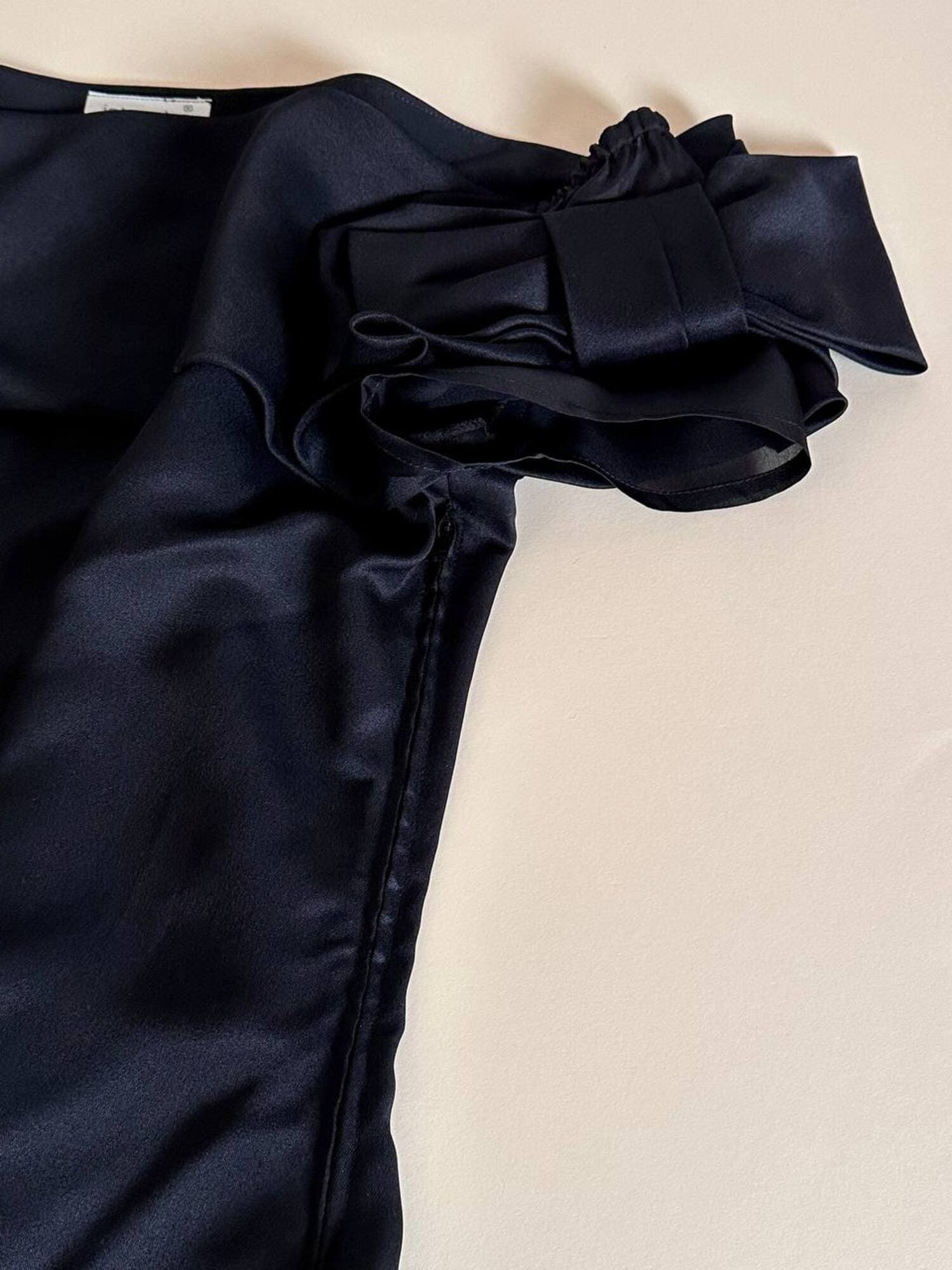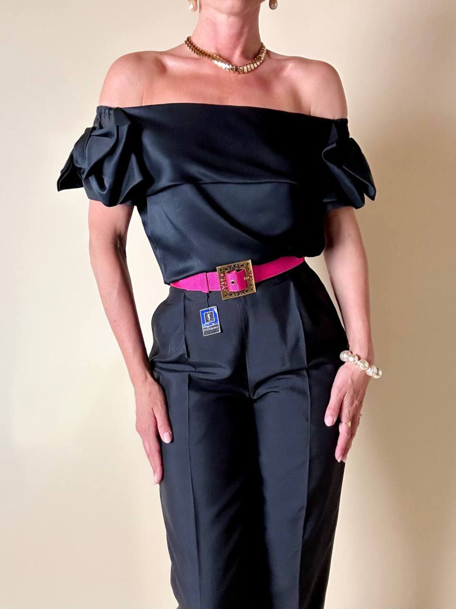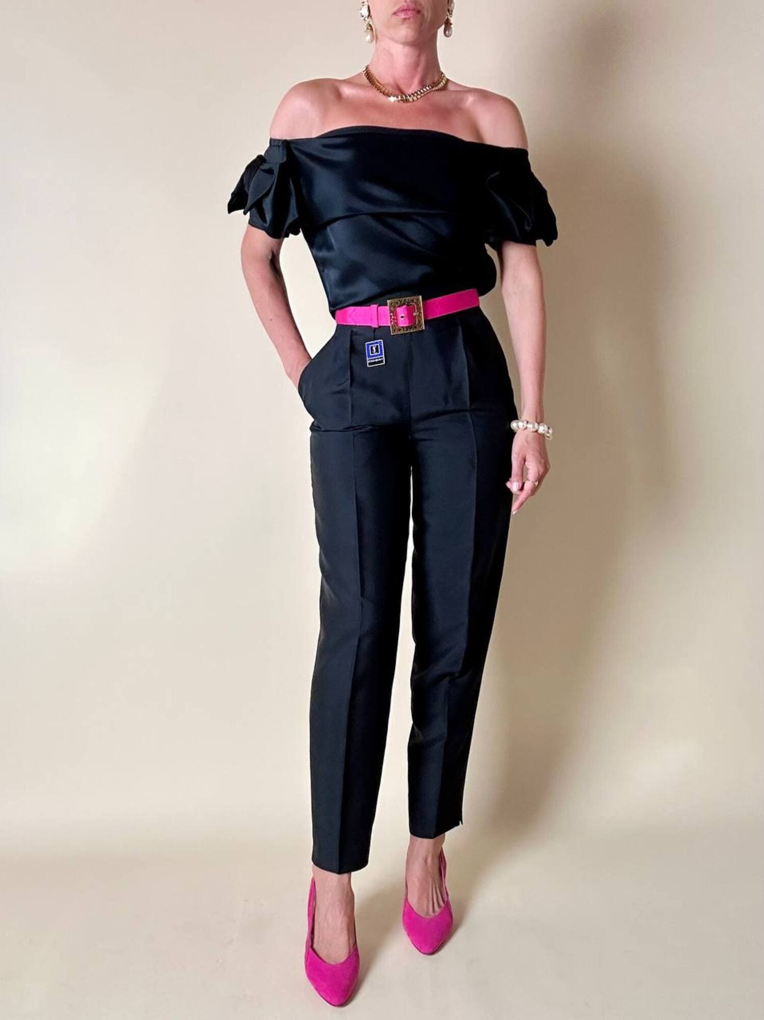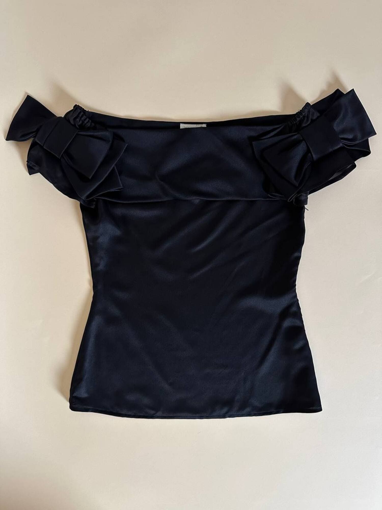 Un capo che unisce teatralità e raffinatezza con sorprendente versatilità. Questo top in seta nera con spalle scoperte e maxi fiocchi della linea “Istante” by Gianni Versace è un omaggio alla femminilità dinamica, capace di adattarsi con stile a ogni occasione coniuga classe e sensualità. La grande balza con comodi elastici laterali lascia le spalle scoperte esaltando la femminilità, le maniche corte sono realizzate in organza nera. A rendere il capo scenografico sono i due maxi fiocchi applicati ai lati che donano movimento e fascino scultoreo. La seta fluida, lucente e impalpabile, avvolge la figura con eleganza, mentre la zip laterale a scomparsa ne rende pratico l’utilizzo. Perfetto per serate speciali o eventi esclusivi, abbinato a una gonna lunga e orecchini gioiello, sia per un cocktail metropolitano con pantaloni sartoriali. Un top trasformista, pensato per la donna che ama reinventarsi con charme.