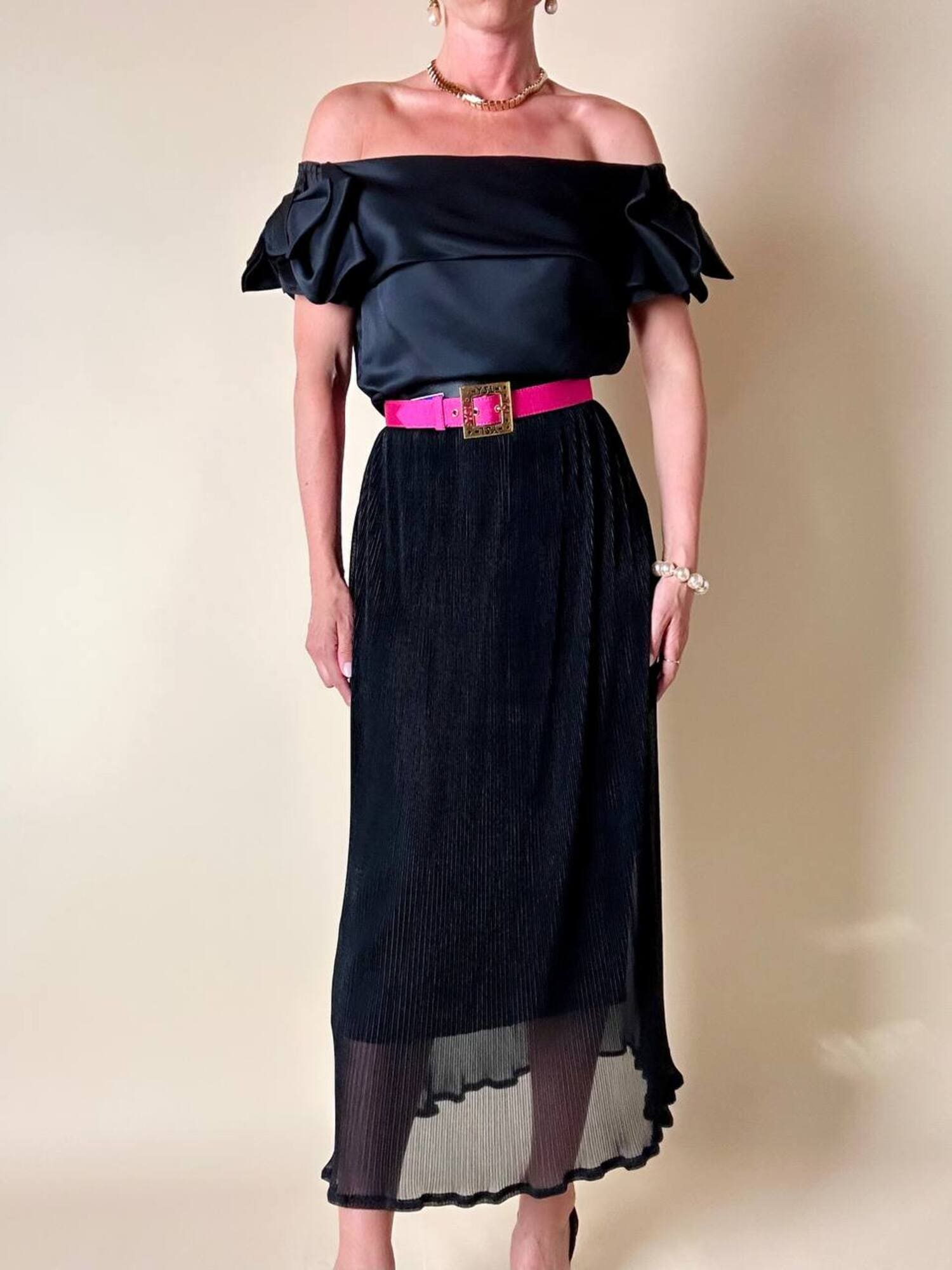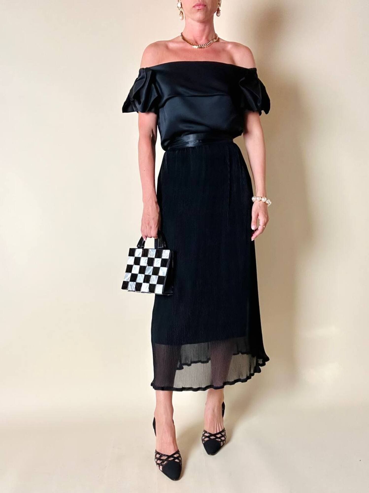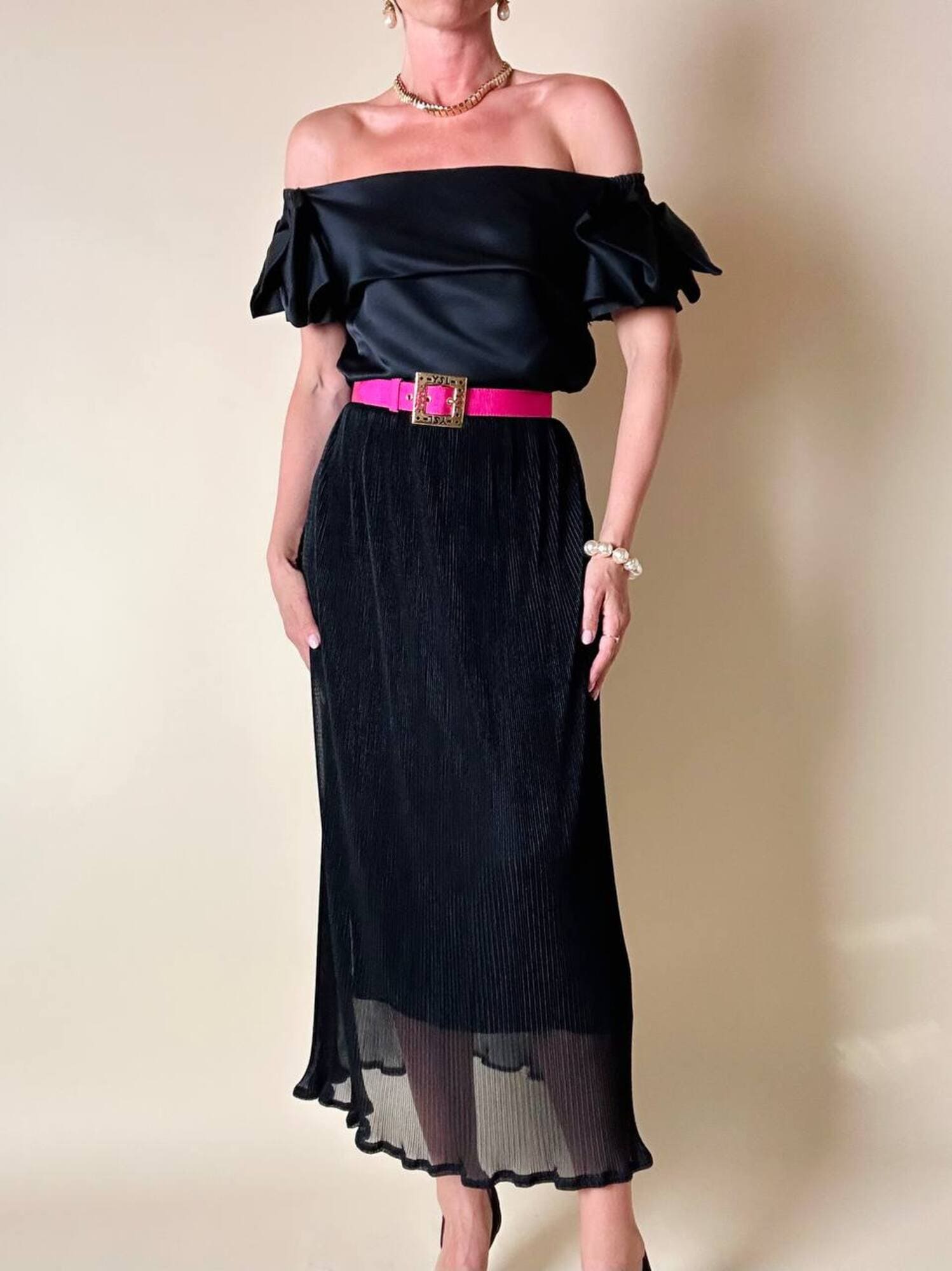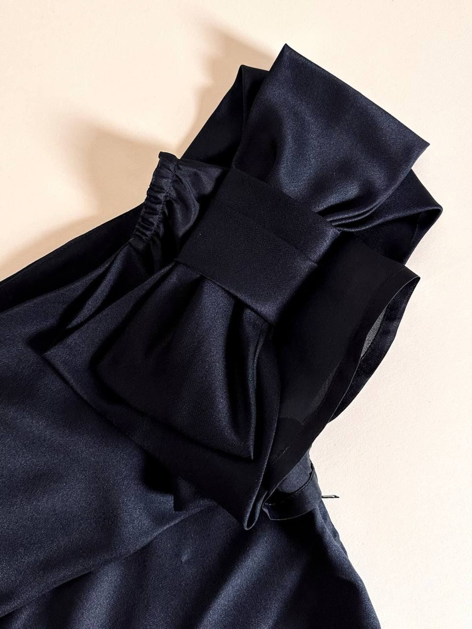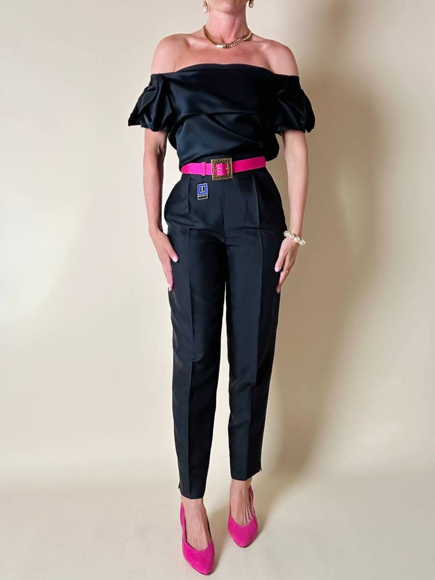 Un capo che unisce teatralità e raffinatezza con sorprendente versatilità. Questo top in seta nera con spalle scoperte e maxi fiocchi della linea “Istante” by Gianni Versace è un omaggio alla femminilità dinamica, capace di adattarsi con stile a ogni occasione coniuga classe e sensualità. La grande balza con comodi elastici laterali lascia le spalle scoperte esaltando la femminilità, le maniche corte sono realizzate in organza nera. A rendere il capo scenografico sono i due maxi fiocchi applicati ai lati che donano movimento e fascino scultoreo. La seta fluida, lucente e impalpabile, avvolge la figura con eleganza, mentre la zip laterale a scomparsa ne rende pratico l’utilizzo. Perfetto per serate speciali o eventi esclusivi, abbinato a una gonna lunga e orecchini gioiello, sia per un cocktail metropolitano con pantaloni sartoriali. Un top trasformista, pensato per la donna che ama reinventarsi con charme.